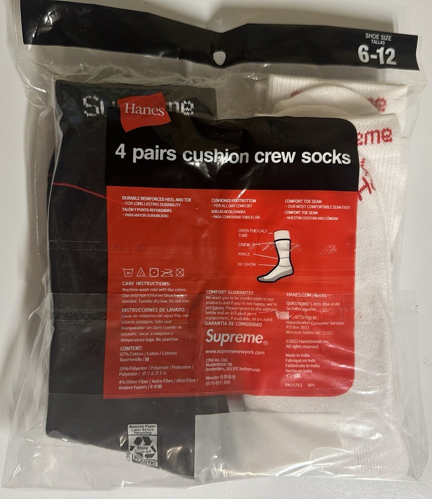 Elevate your sock game with this 2 pair set of Supreme Hanes Socks. Made of comfortable and breathable cotton material, these mid-calf socks feature a classic and stylish design with a logo theme. Perfect for any casual occasion, these socks are available in a solid pattern and multicolor scheme, making them a versatile addition to any wardrobe. Machine washable for easy care, these socks are suitable for all seasons and activities, including gym and training, skateboarding, and basketball. Whether you're looking for a comfortable and stylish pair of socks or want to add to your collection, these Supreme Hanes Socks are a great. You will get 1 pair Set of White and 1 Pair Set of Black Men's 6-12 Round Neck Socks👌