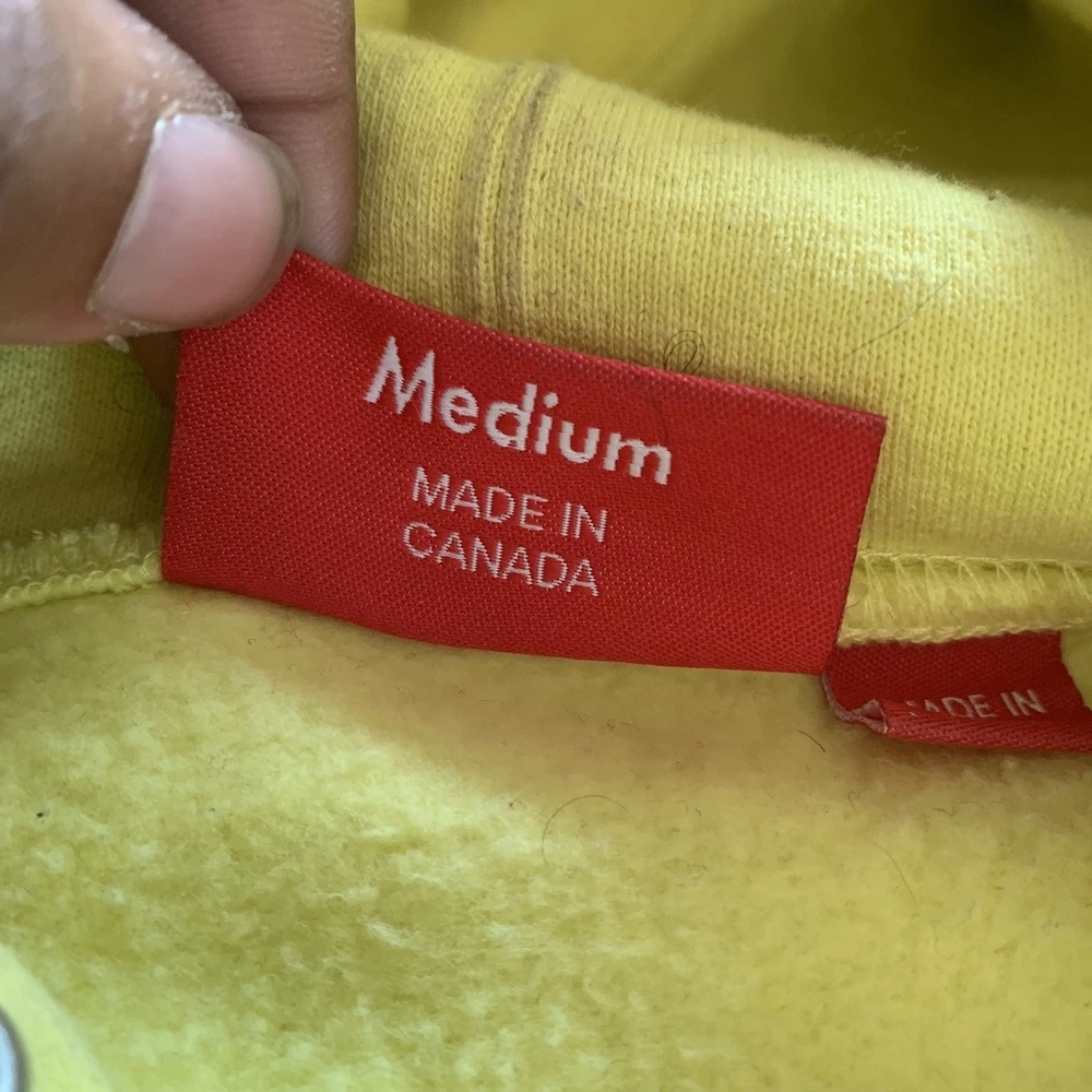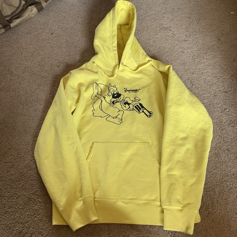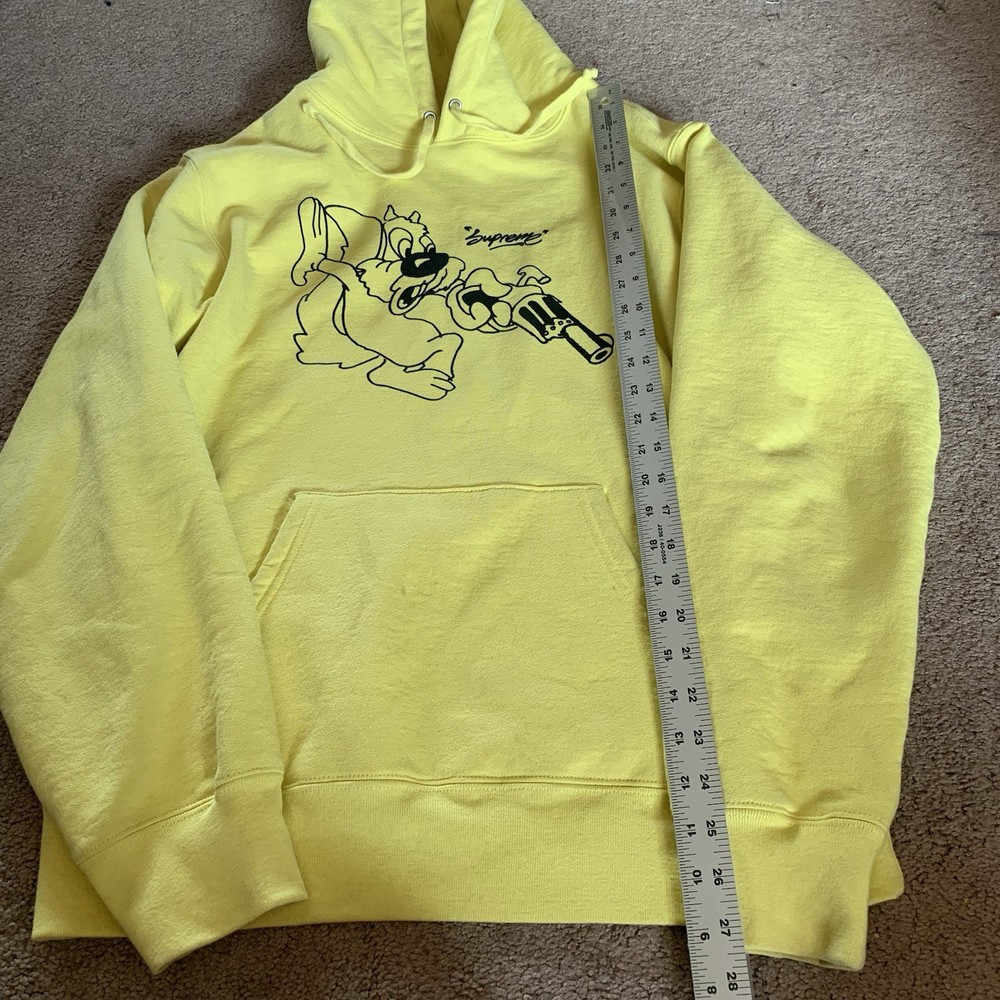 Sleeve Length:Long SleeveDepartment:MenCountry of Origin:CanadaStyle:HoodieUPC:Does not applygtin13:Does not applyType:HoodieSize:LTheme:GunColor:YellowMaterial:100% CottonPattern:SolidFeatured Graphics:Squirrel, LogoSize Type:RegularBrand:SupremeAccents:LogoFeatures:Drawstring, Kangaroo Pocket