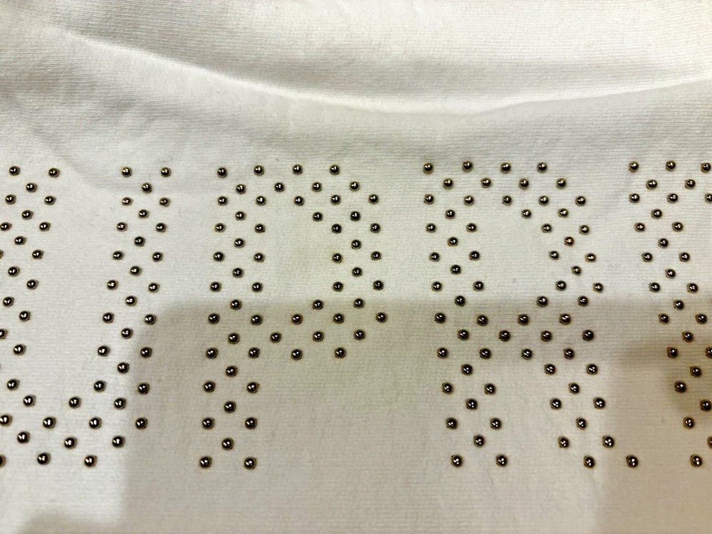 Elevate your streetwear game with this Supreme White Studded Logo Hooded Sweatshirt. Crafted from heavyweight cotton fleece, this sweatshirt features a drawstring closure and a crew neck. The long sleeve design and hood make it a perfect choice for winter, fall, and spring seasons. It comes in XL size with a regular fit, and is adorned with studded accents and the Supreme logo. This designer sweatshirt is ideal for gym and training, walking, and skateboarding. Get your hands on this solid patterned sweatshirt and add a touch of style to your wardrobe. Supreme is written across the back in gold studs, all of which are intact.