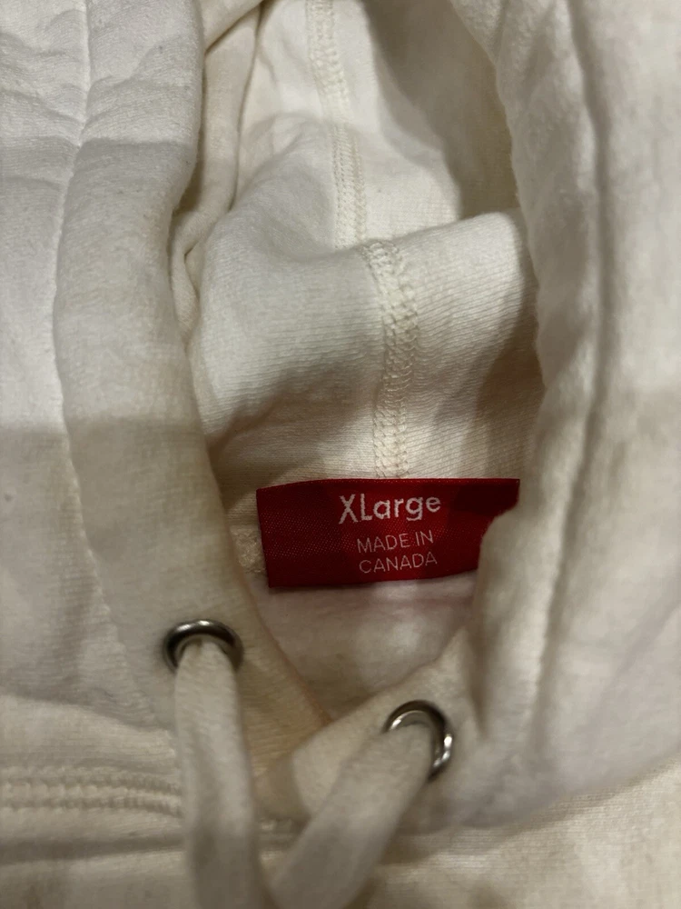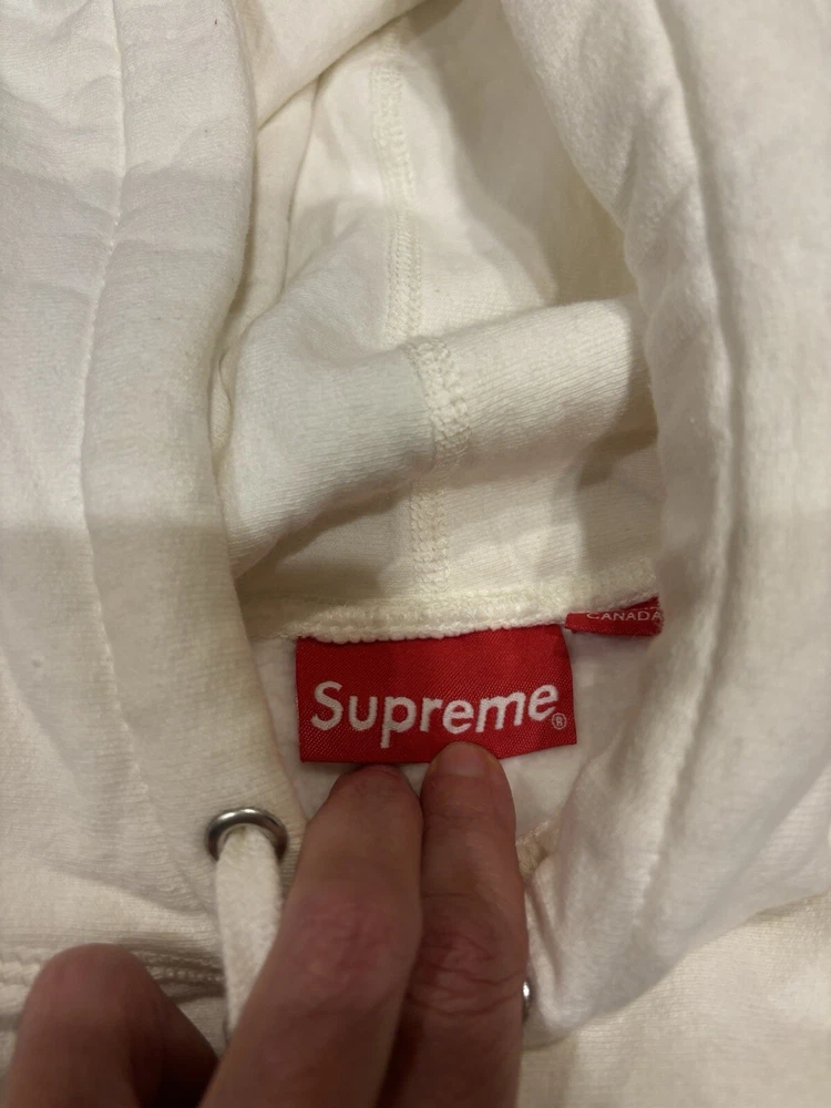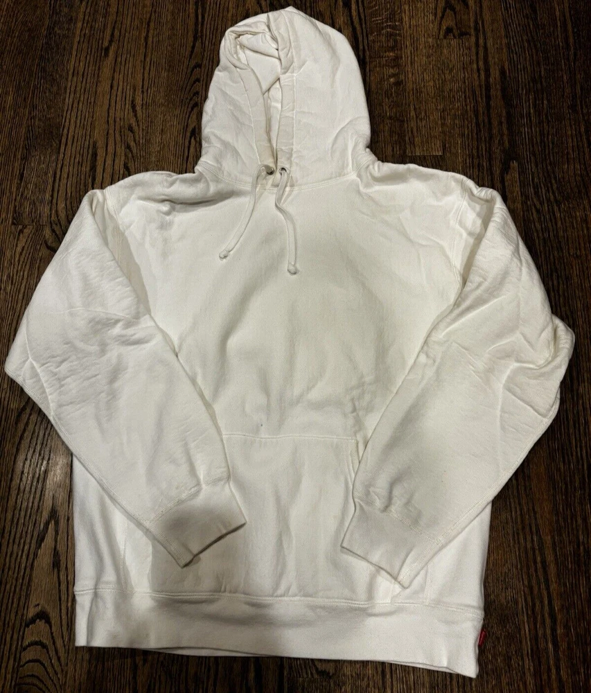 Material: Cotton Pattern: Solid Fabric Type: Fleece Neckline: Crew Neck Vintage: No Theme: Designer Style: Pullover Accents: Logo, Studded Color: White Fit: Regular Sleeve Length: Long Sleeve Type: Sweatshirt Brand: Supreme Size Type: Regular Performance/Activity: Gym & Training, Skateboarding, Walking Features: Heavyweight, Hooded Closure: Drawstring Size: XL Department: Men Season: Fall, Spring, Winter