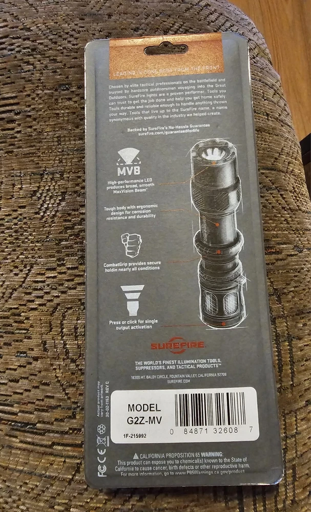 Model: Surefire G2x-Mv Battery Life: N/A Lumens: 500-999 Lumens Country/Region of Manufacture: US Motor Type: N/A MPN: G2Z-MV Battery Capacity: N/A Width: 4.000 Depth: 4.000 Power Source: N/A Battery Size: N/A Bundle Description: No Personalize: No Type: Flashlight Manufacturer Warranty: 1 year Voltage: N/A Brand: SureFire Battery Technology: CR123 Color: N/A Cable Length: N/A Number of Batteries: N/A Custom Bundle: No Length: 10.000 Weight: 0.3700 Features: Waterproof, Batteries Included, Handheld Lighting Technology: LED Battery Included: No