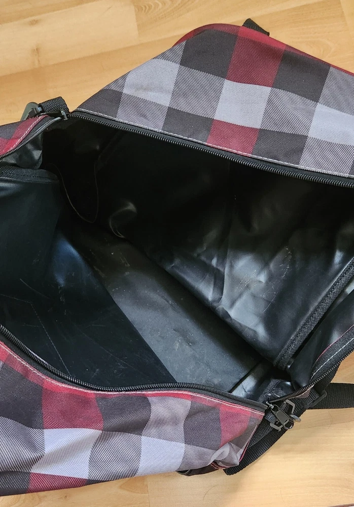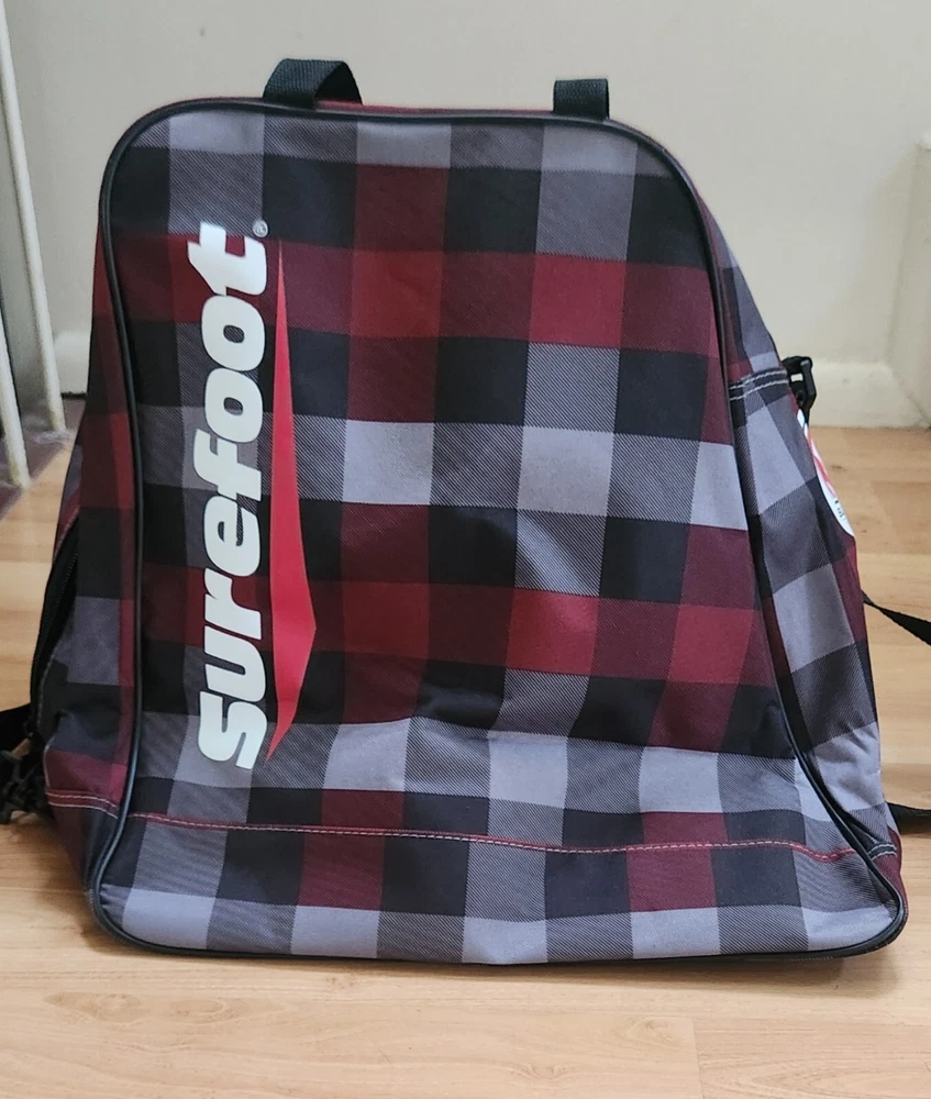 Surefoot Ski Boot Bag Red Black Grey Plaid 18x16" Great ConditionNo tears, holes, stains or fading Handles and detachable adjustable shoulder strap