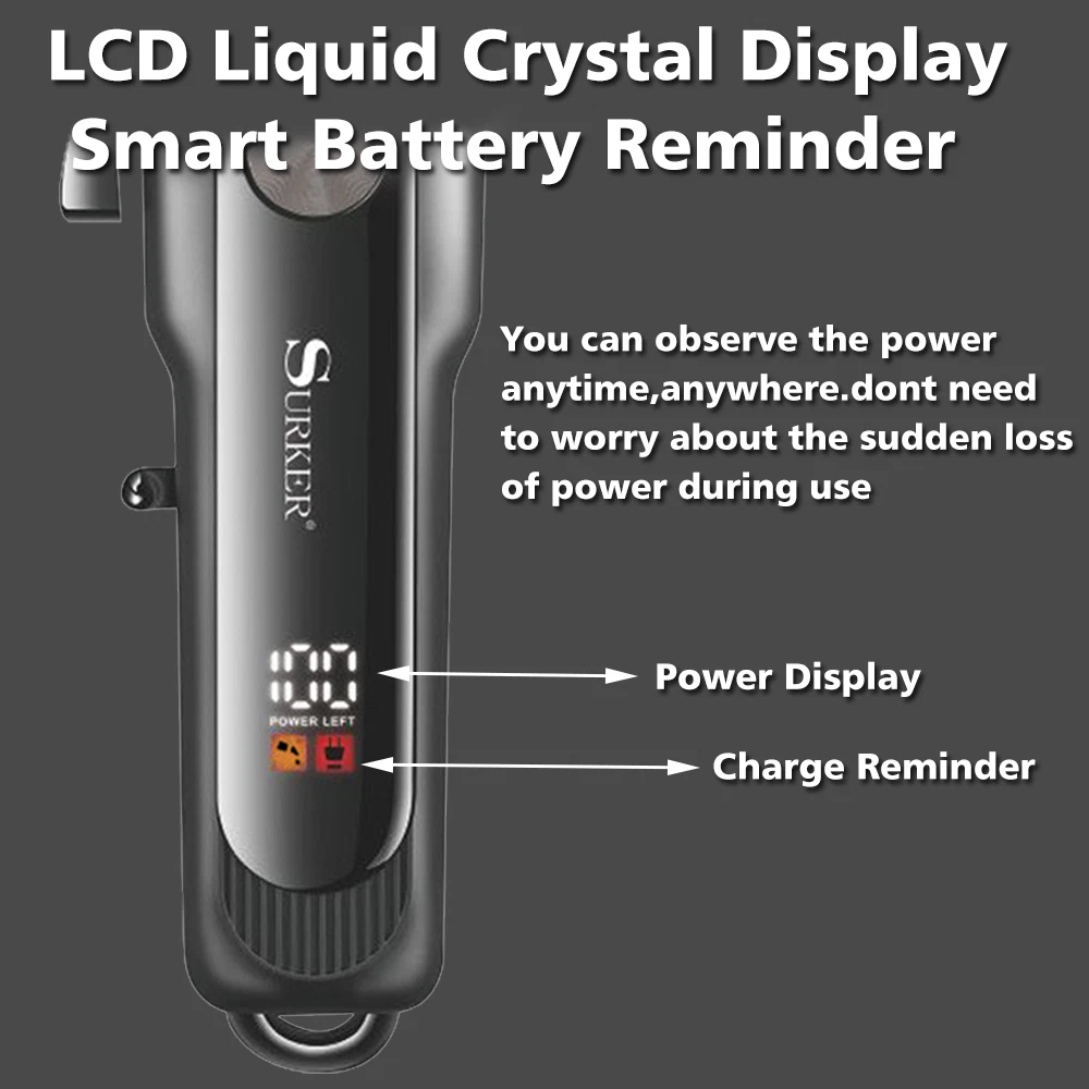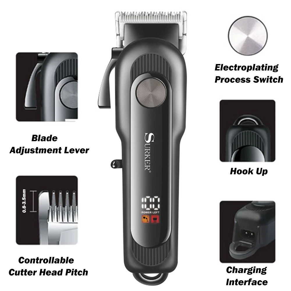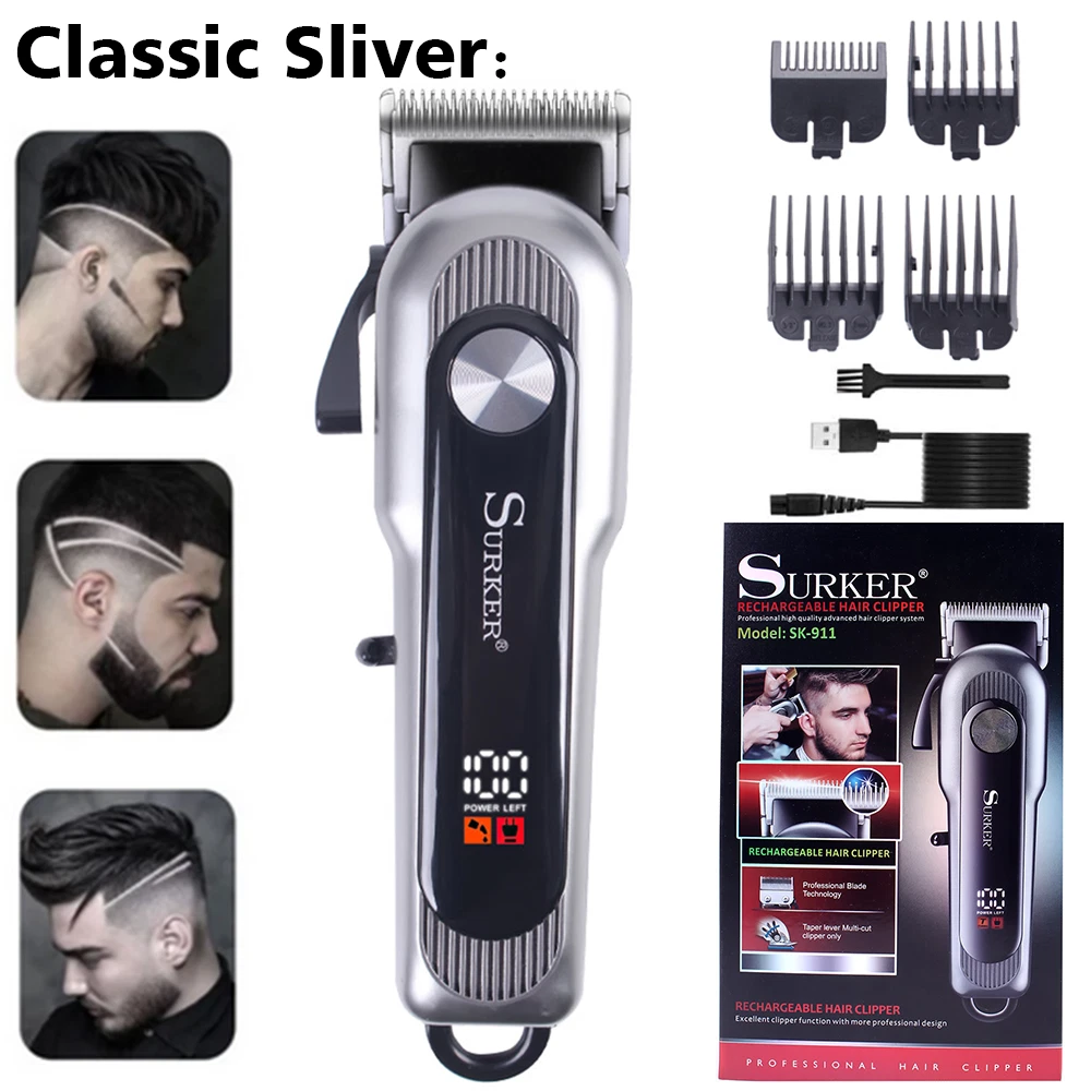 Product details: 1 Using high quality steel, sharp and durable. 2: limit comb * 4 (3/6/9/12mm) 3: The R-type blade safely, cuts hair easily and does not hurt the skin. 4: waterproof design, easy to clean. 5: Large capacity lithium battery can work up to 240 minutes. Product parameters : Brand: Surker Product Name:SK-911 Body weight: 252g Color box size: 23.5*6.5*14cm Machine size: 19*5/7.4*1.9 Inch Color: Black / Grey Voltage: 110-240V 50/60HZ Power 5W, Use Time: Charge 3 hours , Use 150 mins Include: host*1 USB cable*1 limit comb*4, cleaning brush*1