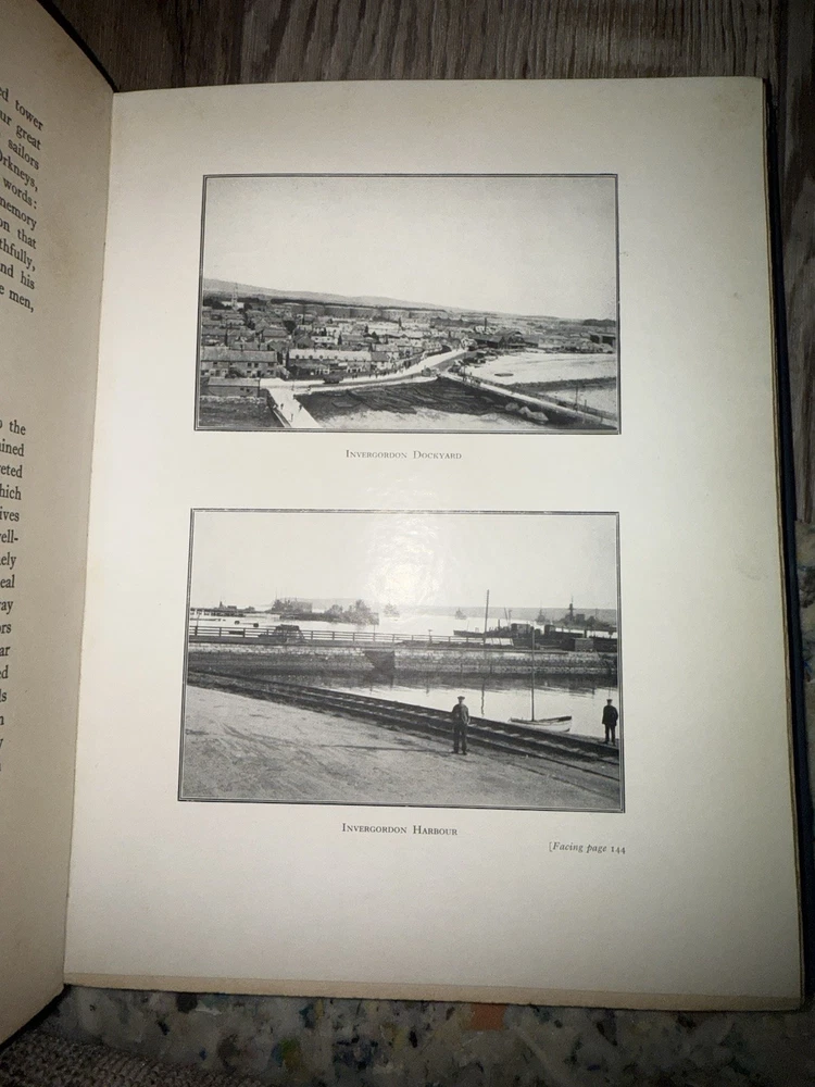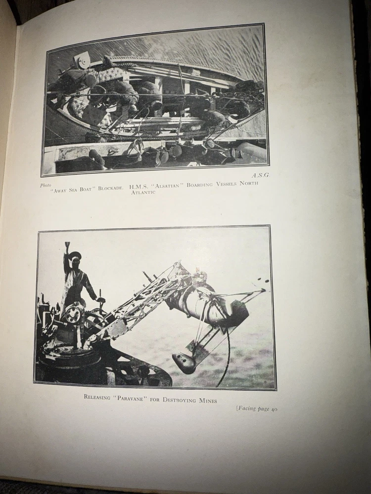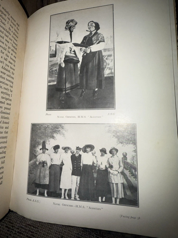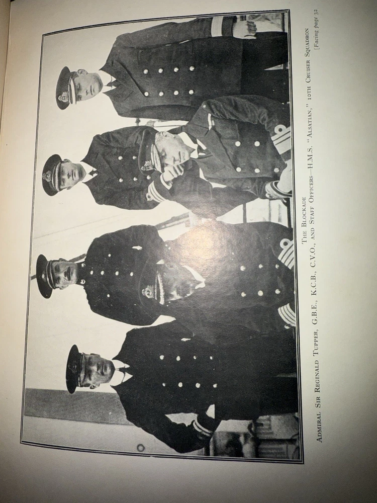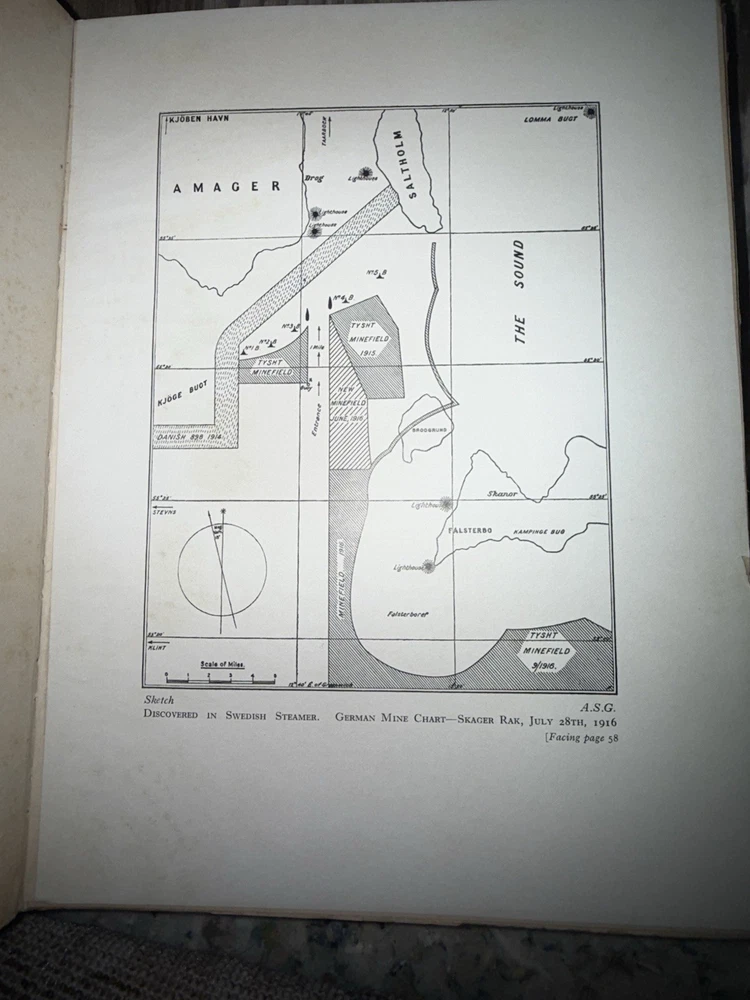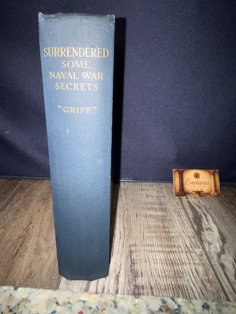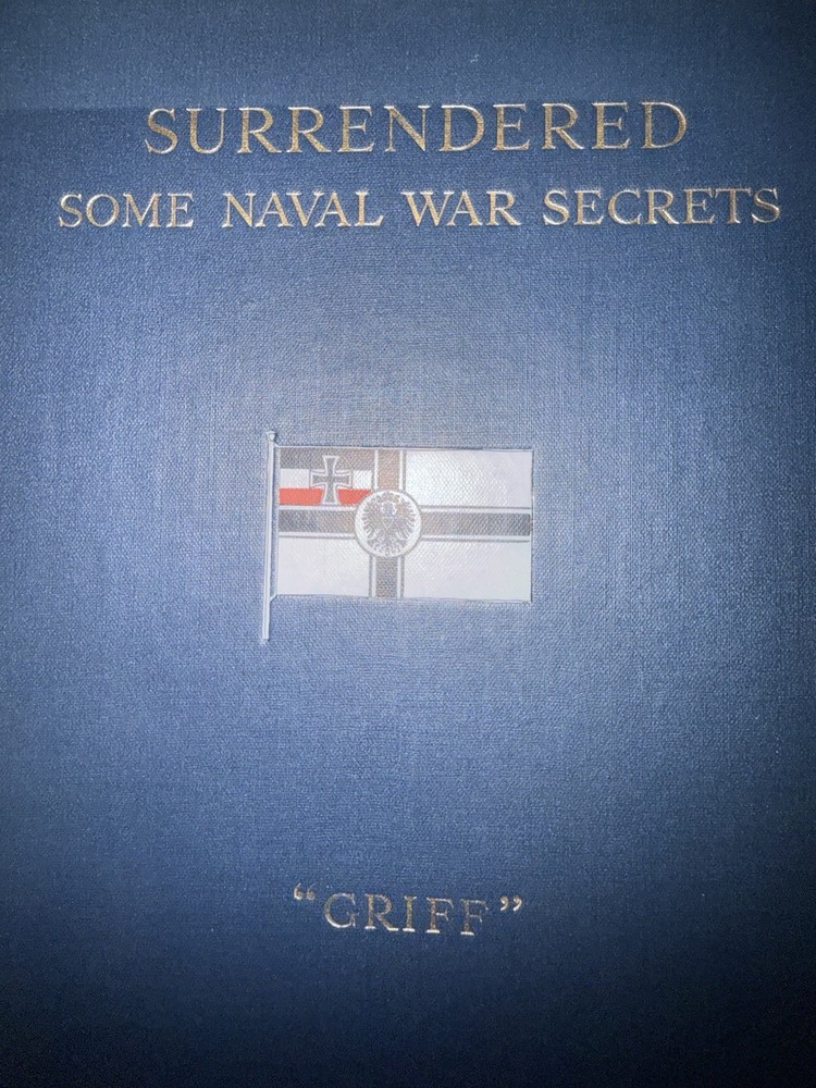 Surrendered: Some Naval War Secrets By “Griff” (A.S.G.) Published by the Author, Cross Deep, Twickenham. Circa 1918–1920, First Edition. A scarce self-published World War I naval memoir by “Griff” (A.S.G.), detailing covert intelligence work, U-boat operations, and German naval strategy during the Great War. Written with firsthand authority, the book provides insight into early 20th-century espionage, communication methods, and wartime technology. Bound in navy-blue cloth with gilt title and a printed German Imperial Navy flag on the cover — a striking and uncommon design. Includes a frontispiece portrait of the author in uniform and several in-text diagrams and maps, such as a chart of the German minefield near Skager Rak (1916). Details: • Publisher: Self-published, Cross Deep, Twickenham • Pages: approx. 140 • Binding: Original navy-blue cloth with gilt title and flag device • Features: Frontispiece portrait; illustrated charts and diagrams • Condition: Very good. Clean, tight binding; bright gilt; mild foxing to endpapers and title page; no loose or missing pages.