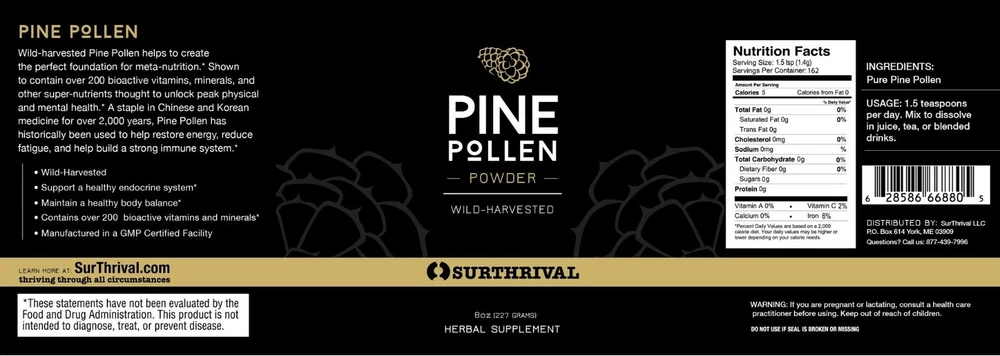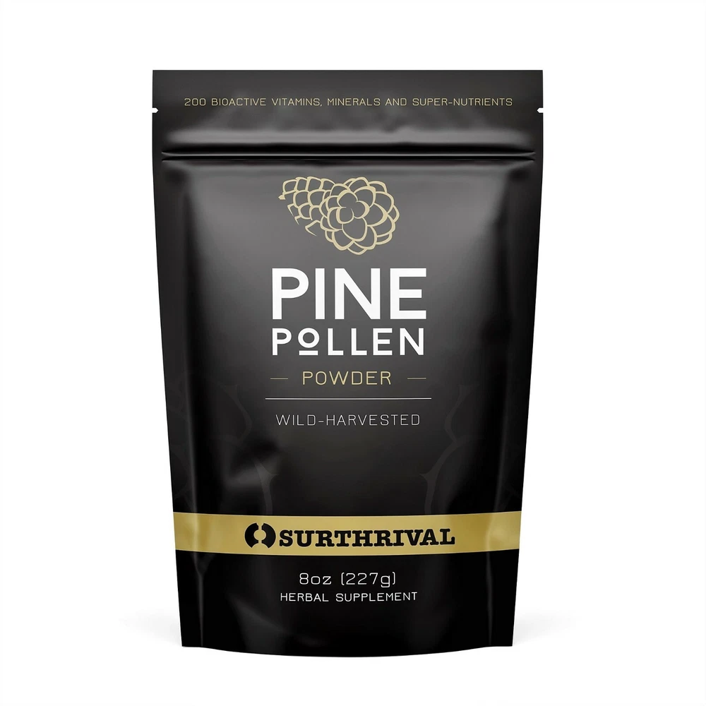 Surthrival Pine Pollen Pine trees produce both male and female cones; the male cones are more often found at the bottom of the tree, where they can better disperse their pollen. Every spring, that pollen falls onto the forest floor, and though not every grain finds and fertilizes its female counterpart, the entire ecosystem gets a virility boost from the event. Packed with essential vitamins, minerals, plant sterols, and a complete essential amino acid profile, pine pollen has been used and revered in the Far East for centuries because of its many energy-supporting, anti-aging potencies, & influence on testosterone and estrogen. Here in the West, it’s been studied for its balancing, anti-aging, and stamina-supporting agents (again—that virility boost!). Surthrival Pine Pollen Powder is responsibly wild-harvested from Masson pine trees (pinos massoniana). *FDA Disclaimer: These statements have not been evaluated by the Food and Drug Administration. This product is not intended to diagnose, treat, cure, or prevent any disease.