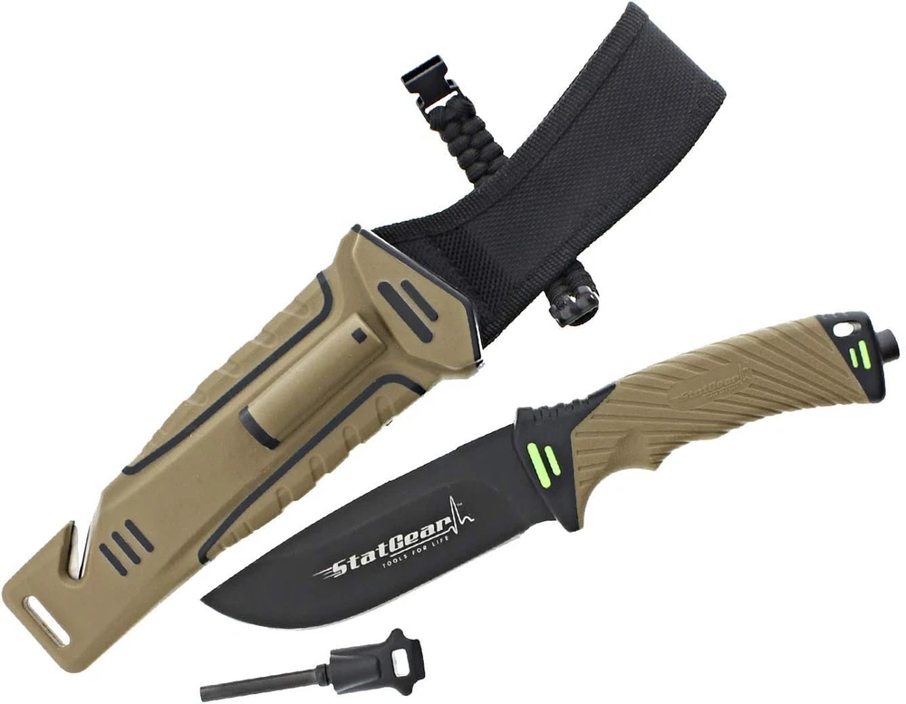 StatGear survival outdoor knife is a stainless steel full tang knife. This durable knife can handle anything especially the tough outdoors. Features a drop point blade equipped with a blade sharpening stone in rear of sheath so your knife is sharp & sturdy consistently. Fire starter and cord cutter in sheath. The cord cutter works well for minor cuts so you don’t have to take out your knife. If you enjoy hunting and all other outdoor activities, you'll find the StatGear Surviv-All Outdoor Knife a convenient and practical choice for your go-to knife. The Surviv-All Survival Knife From Statgear Has A High Carbon 440 Stainless Steel Full Tang, Drop Point Blade. It Has A Rubber Textured Handle With A Stainless Steel Pommel On The Handle Bottom. The Heavy Duty Belt Sheath Includes A Fire Starter Rod And Cord Cutter So You Don'T Have To Take Your Knife Out For Minor Cuts. There Is An Integrated Knife Sharpener Stone On The Rear Of The Sheath. The Knife Handle Is Secured To The Sheath With The Patent-Pending Para-Secure Paracord Handle Strap. Knife Length: 9. 5 Inches Blade Length: 4. 25 Inches Knife Weight: 7. 5 Ounces Knife Weight In Sheath: 13 Ounces.
