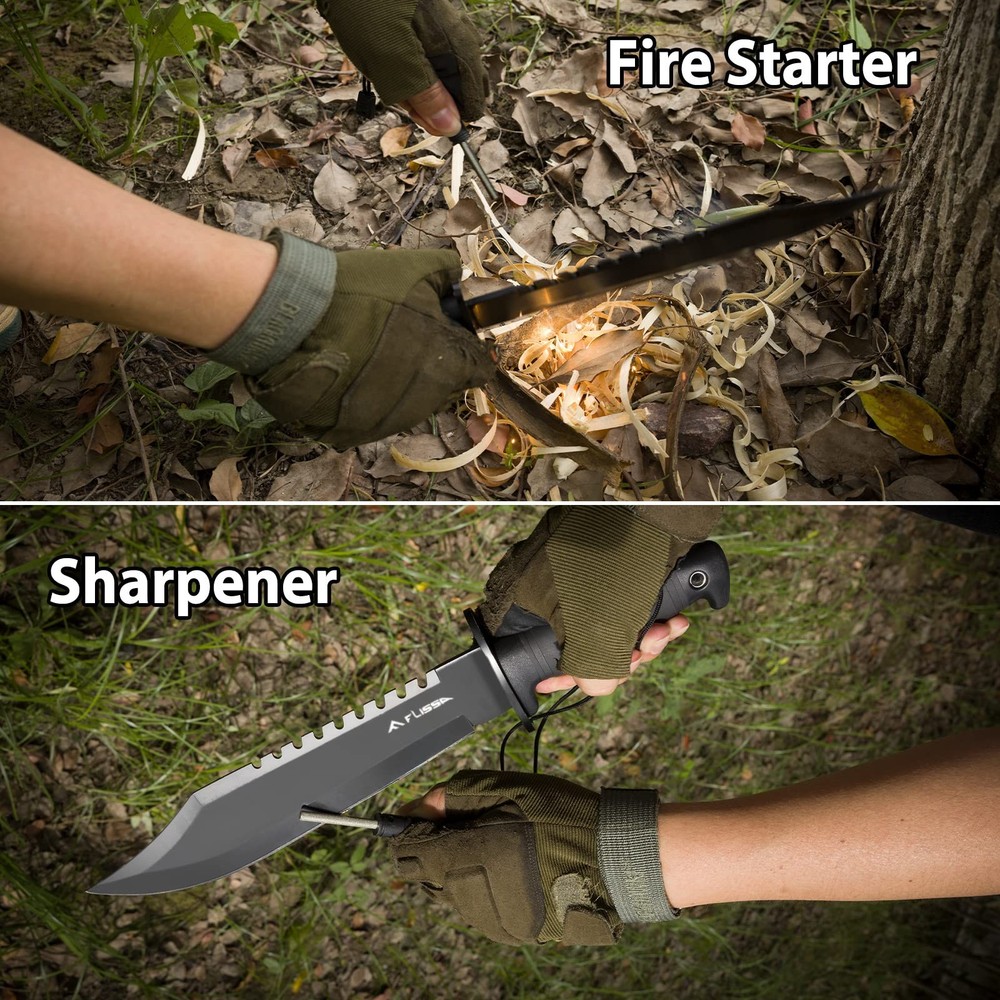 Survival Hunting Knife with Sheath, 15-inch Full Tang Fixed Blade Tactical Bowie Knife with Sharpener & Fire Starter for Camping, Outdoor, Bushcraft 15" Fixed Blade Hunting Knife: Ultra-sharp combat knife, stronger than traditional hunting or bowie knives. Overall Length: 15 inches; Blade Length: 10 inches; Thickness: 5/32 inch; Weight: 16.8 oz Razor Sharp Clip Point Blade: Made of stainless steel for excellent hardness, improved edge retention, and rust resistance. The clip-point blade features a saw back and black anodizing, making it ideal for camping, hiking, survival training, or military combat Hunting Knife with Sheath & Rubber Handle: The classic soft rubber handle provides high friction and a comfortable, non-slip grip. This heavy-duty sheath features an easy-open fastening system and a belt hanging system for convenient and safe carry Knife Sharpener & Fire Starter: Equipped with a fire starter for easy fire ignition during outdoor survival. The included knife sharpener allows you to quickly restore the blade’s edge A Great Gift for Men: This camping and hunting bowie knife is suitable for hunters, campers, survivalists, or outdoor sports enthusiasts, making it an excellent gift for adventure lovers Shipping We offer FREE shipping on all orders! We ship within Three business days of payment, usually sooner. We use a selection of shipping services such as UPS, FedEx, USPS etc. We only ship to the lower 48 states, no APO/FPO addresses or PO Boxes allowed. Local pickups and combined shipping options are not provided at this time. Return You can return a product for up to 30 days from the date you purchased it. Any product you return must be in the same condition you received it and in the original packaging. Please keep the receipt. Payment We accept payment by any of the following methods: PayPal Please pay as soon as possible after winning an auction, as that will allow us to post your item to you sooner! Feedback Customer satisfaction is very important to us. If you have any problem with your order, please contact us and we will do our best to make you satisfied. Contact Us If you have any queries, please contact us via ebay. We usually respond within 24 hours on weekdays. Please visit our eBay store to check out other items for sale! Thank you for shopping at our store.