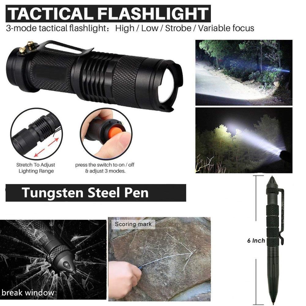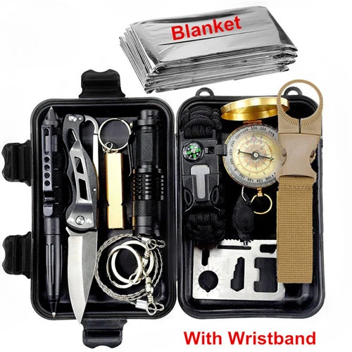 12 in 1 Outdoor survival kit Set Camping Travel Multifunction First aid SOS EDC Emergency Supplies Tactical for Wilderness tool WHAT'S IN THE BOX? 1. 4 in 1 Survival paracord ( Pleast note: As mailing range, there are no flint in the paracord !) 2. Powerful laser pointer: Provides remote indication when calling for help outdoors. The laser range is more than 2000M and the beam is visible, especially at night. 3. Upgrade Compass: 360 degree rotating bezel for easy navigation & orienteering, compass glows in the dark making it easy to read in all weather at any time. 4. Flashlight: with zoomable design, heavy duty, compact handheld flashlights, zoom in for an intense beam or out for wider illumination. 3 light modes like high / low / strobe. with its ultra-bright LED light, and ability to run for hours of just a single AA battery (BATTERY NOT INCLUDED). 5. Heavy-Duty Tact-Pen with Carbide Tip : made from tungsten steel for superior strength & portability, break a window / glass, escape in an emergency situation 6. Emergency Blanket: provides convenient easy protection in all cold or warm weather states. 7. Upgrade Survival Knife: high quality survival knife, great for any use. 8. Wire Saw: used for cutting wood (no more than 3 inches), plastic, bone, rubber and soft metal. 9. Water Bottle Clip: simple and firm way to carry water bottles. 10. Credit Card Knife: credit card sized, easily to fits inside your wallet, pocket. [11 Functions] can opener, bottle cap opener, 4-position wrench, 2-position wrench, butterfly screw wrench, direction ancillary wrench. 11. Whistle: two holes, the sound is more loud. can let the rescue team find you faster 12. Mini Light: small, practical can also be a key ring 13. Compact Durable Waterproof & Shockproof Carrying Case (all the survival tools will be packed in Black Box) :ABS Plastic Durable Water Proof Case to keep your items safe from the elements.Designed to fit into most compact spaces for easy access. Attention : There are a lot of pirate survival box in market, compare the survival box quality as below, we sell the most durable survival gear box now ! - Carry on with you - We've packed this kit into a super compact, discreet, ultra-durable, waterproof and easy to carry case that is the size of a small book. Our kit is compact enough to throw in your backpack, your car, your office drawer or store in virtually any small handy space that you can access quickly! Package Dimensions: 7.1 x 4.8 x 2.4 inches Item Weight: 1 pounds Small size emergency first aid kit with 13 multi tools, easy to carry What You Get: 1 x Multi-function scraper 1 x Emergency tactical pen 1 x Emergency thermal blanket 1 x Tactical torch flashlight 1 x Multi-function compass 1 x Mini keychain light 1 x Tactical military knife 1 x Saber card 1 x Whistle 1 x Wire saw 1 x Survival wristband paracord 1 x Water Bottle Clip 1 x Shockproof case 1 x Laser pointer Dropping are welcome, please contact me for any question. Shipping: All orders will be dispatched within 24 hours once confirmed you payment. As international shipping is affected by many factors: customs, flights, weather, war, trade, policy, etc, some shipment do get delayed sometimes, if you have not received your shipment after the expecting working days, please contact us, we will track the shipment and get back to you ASAP. Payment: We currently accept Aliexpress payment. We can ship the parcel to your aliexpress address, please noted other address if you want. Feedback: Your satisfaction is our main goal and your feedback is very important to us. We want our customers to be 100% satisfied with their order. when you receive your order, please take a moment to leave us positive feedback and 5 star rating to us is appreciated, it is vital and very valuable to the continued success of our business. If you are not satisfied, please email us before leaving neutral feedback and negative feedback, and please give us 1 business days to resolve your complaint.your full satisfaction is our duty. Return: All items will be checked carefully and packaged in good condition. We offer 14 days dead on arrival replaycement warranty from the date of receipt. About us: We guarantees all our customers would be satisfied with our product. If you are not satisfied, we will try our best to make you pleased on your purchase. Contact us: If you have any questions, please do not hesitate to contact us in Aliexpress. Emails are normally answered within 12 hours. We work hard to keep our feedback positive. We always provide timely responses to emails and strive for a superior customer experience.