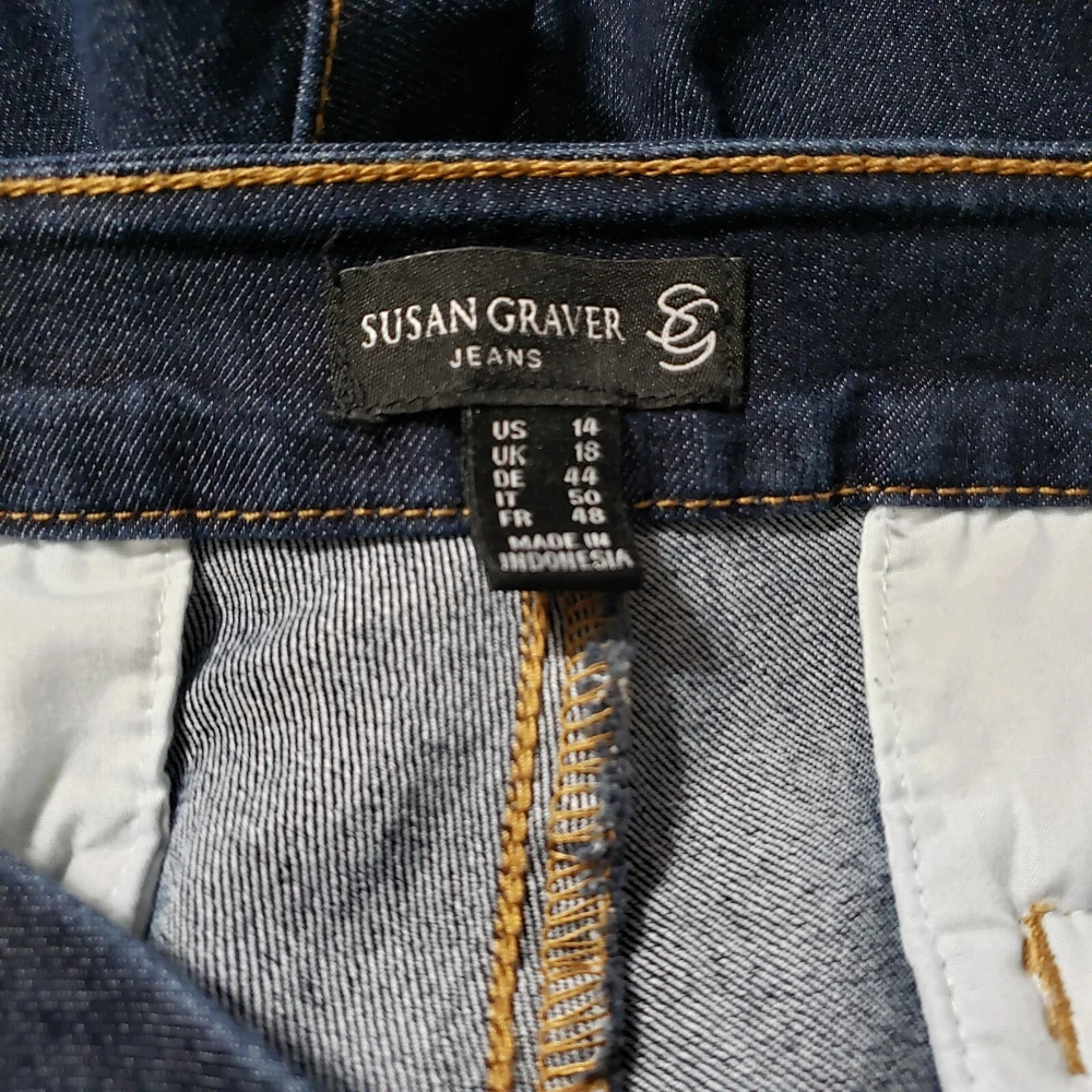 Susan Graver Jeans Size 14 Mid Rise Stretch Dark Wash Good pre-owned condition No flaws found See all photos for condition, color and measurements