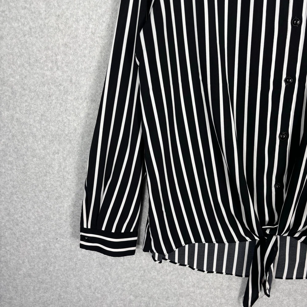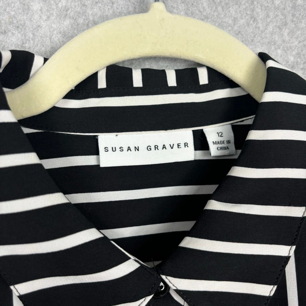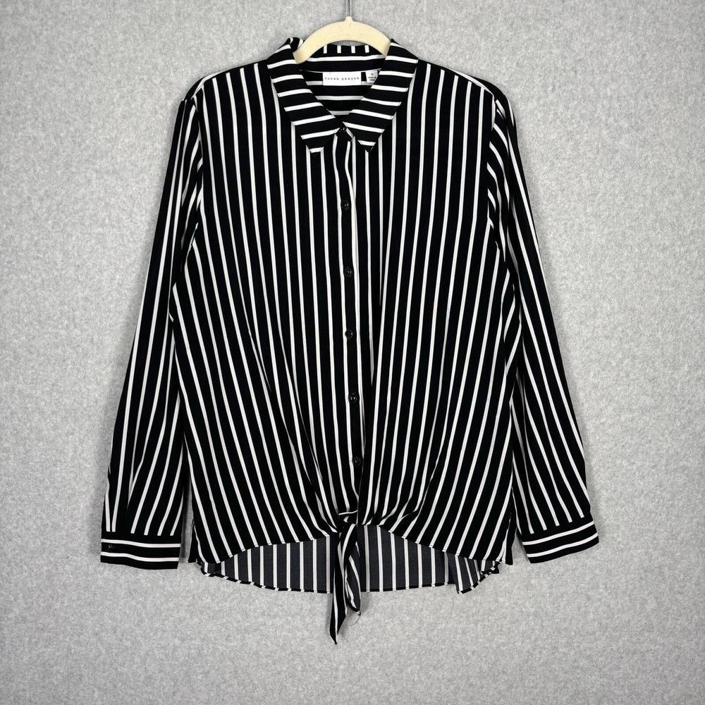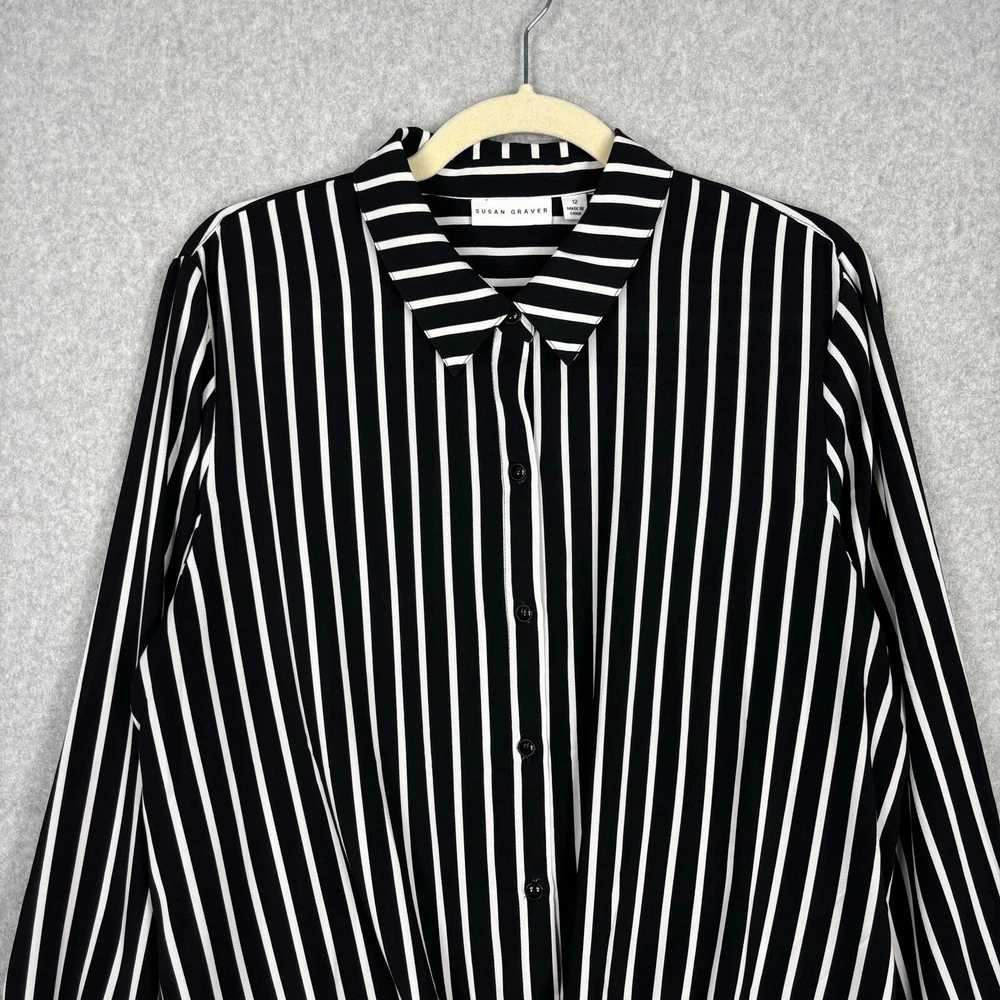 Susan Graver Shirt Women 12 Black White Striped Tie Hem Front Silky Soft Blouse Top Career Button Collar Corp Career Work Office Business Church Long Sleeve Tunic EXCELLENT Pre-owned condition: minimal to no signs of wear, no stains or holes SKU 5562 **Please see all pictures for full item condition, details, and approximate measurements** - Ships Same/Next Day, Professional Seller, Offers Welcome, Like or watch for price drops - Item in photos is exact item you will receive - I list new items daily, be sure to browse my store/closet for more items - Bundle pricing and combined shipping available for additional savings - Feel free to send a message