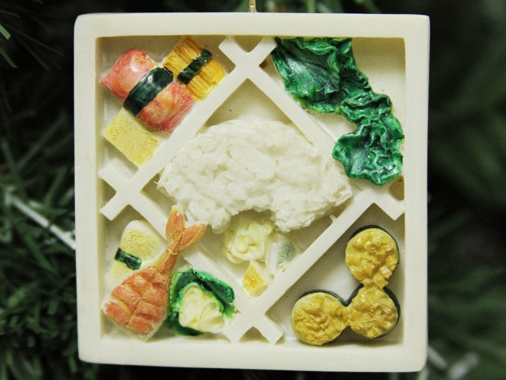 You are buying a new Sushi Bentobox Christmas Ornament. Nice detail. Size is about 2" inches tall. Ships from Ernie's Ornaments with gift box. Check out our eBay store. We have several hundred unique Christmas Ornaments. We combine shipping!