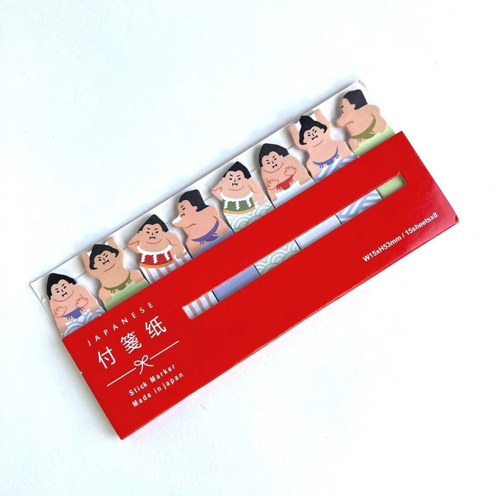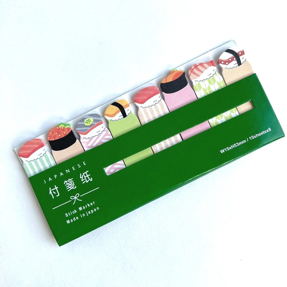 Use these fun sticky tabs as bookmarks and mark pages in your notebooks. For school and the office. Each pack has 8 designs with 15 sheets each. The little folders can slip into book covers or pockets so they are ready to use. Choose the sushi, Mt Fuji or Sumo wrestler. I have more stickers, washi tape and paper for sale. I do combine shipping. Please put all the items you want to purchase in ONE cart and then pay. I will refund you the difference in shipping after shipping label is printed. Let me know if you have any questions through eBay messaging. Thank you for stopping by!