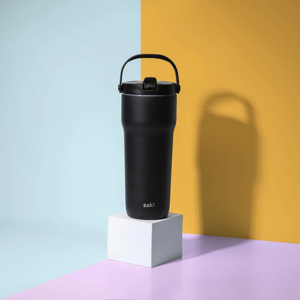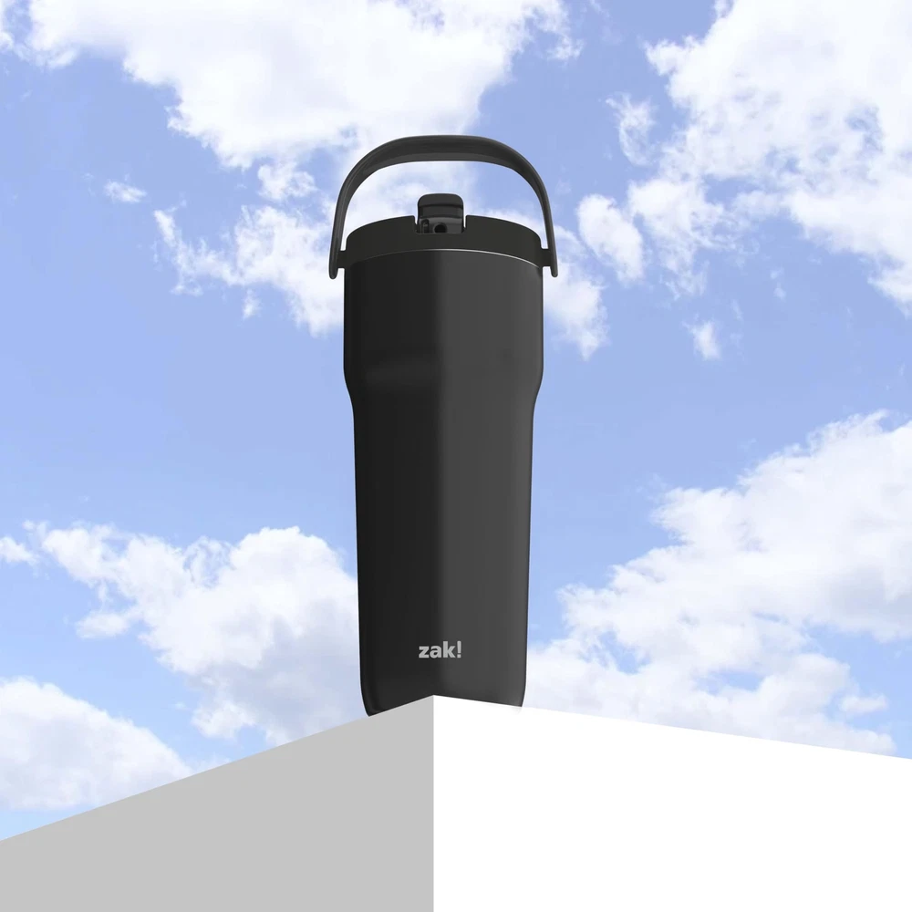 This insulated travel tumbler from zak! designs is the perfect choice for daily hydration! Durable Materials: The 30-ounce tumbler is made with food-, 18/8 stainless steel. All the materials are completely BPA free and sturdy enough to stand up to everyday wear and tear. Vacuum Insulation: The tumbler has vacuum insulation to keep cold drinks cold for hours. The double-wall construction also stops condensation from forming on the outer walls, booting messy water rings out of your life. Flip Spout: The screw-on lid has a flip-up spout that keeps sipping simple and won't leak when it's fully closed. Great for On the Go: The tumbler has a wide bucket handle that gives you a secure and comfortable grip, so it's easy and convenient to carry while you travel. Specifications: 30 oz capacity. Made of durable, food-stainless steel. BPA-Free - zak! is committed to safety. Lid is dishwasher safe, tumbler is top rack dishwasher safe. Do not microwave. Length: 4.44-inch, Width: 4.48-inch, Height: 10.2-inch. Color: Ebony (Black). SIZE & MATERIAL: This zak! tumbler holds 30 ounces and measures 4.44 by 4.48 inches wide and 10.2 inches tall. It's made with food-, 18/8 stainless steel, which is both sturdy and BPA free, and everything is top rack dishwasher safe for an easy clean. VACUUM INSULATED: The travel tumbler has vacuum insulation to keep drinks cold for hours, and double-wall construction that stops condensation from forming on the outside. No more messy water rings! CONVENIENT SPOUT: The flip-up spout keeps sipping simple and won't leak when it's fully closed. CARRY HANDLE: The lid includes a wide bucket handle for a secure and comfortable grip, so the tumbler is easy to carry on the go. LIFESTYLE FRIENDLY: zak! designs tumblers are the perfect choice for your daily routine! This stylish drinkware is fully reusable—no more disposable cups—and great for staying hydrated all day long.