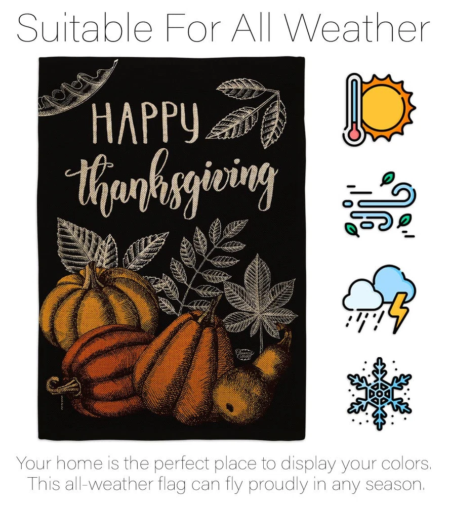 Thanksgiving Beautiful Mini Garden Flag have variety of Garden Flag for all occasions. Uniquely design for hanging indoor or outdoor use. We are committed to offering you exceptional values. Our customers enjoy displaying our Garden Flag for longer periods. Specification: Theme: Thanksgiving Size: Garden Flag 13" x 18.5" Print: Double-Sided Readable: Readable Both Sides Material: Weather Resistant Double Burlap Stitching: Double Stitched Display: Vertical Hang Type: Sleeve Artist: © Brad Whitewood Special Features: Origin: Made In USA Package Include: 1 pc x Garden Flag 13" x 18.5" Package Decorative Flags For more than a decade, we’ve been dedicated to manufacturing flags with no comparison in quality and beautiful designs. Our flags are made with our Guard material that is soft to the touch and designs can be read correctly on the flag. A feature that our customers will love. We are committed to using eco-friendly inks that won’t leave a foot print in our environment. MPN: OC-TG-G-192258-IP-DB-D-US20-OC 92258 G92258 PROUDLY Made In USA - Package And Product Designed In California PURCHASE WITH CONFIDENCE - From 's US Authorized Resellers MADE OF DURABLE - 100% Thick Double Burlap Fabric construction helps resist the wear and tear from frequent use TEXT READABLE BOTH SIDES - Garden Flag Double-Sided Print DURABLE FLAG - Double stitching panels on multiple rows and high quality Sleeve to provide lasting strength VIBRANT COLORS - With UV-Resistant Maintains Its Colors All Season Long FEATURES - Sleeve Hanger fits standard Banner/Flagpole, Bracket, Arbors or stand, SOLD Separately