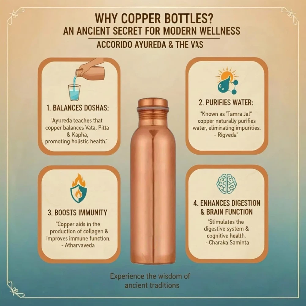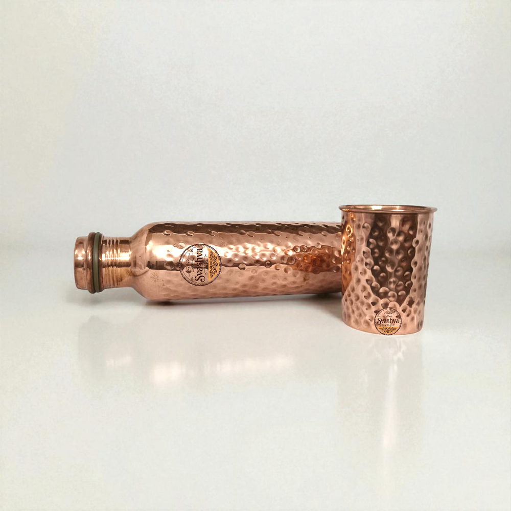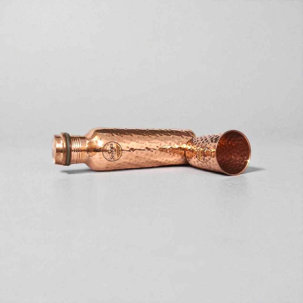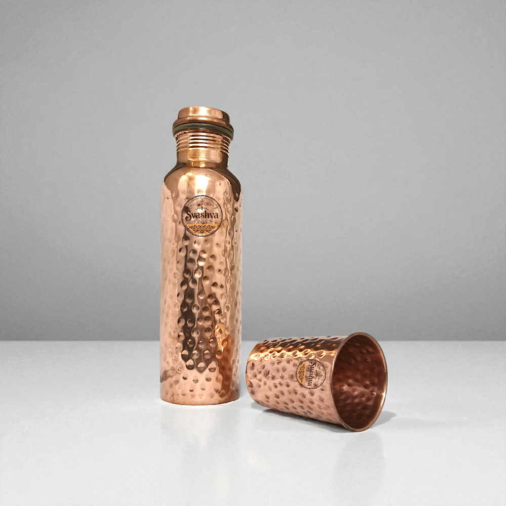Enhance your daily hydration routine with the health benefits of this 100% pure copper water bottle and cup set . Rooted in the wisdom of Ayurveda and crafted with care, this set is designed to support your well-being while offering timeless elegance and durability. What You Get: 1 Copper Water Bottle 1 Copper Drinking Cup Features and Benefits: 100% Pure Copper Material Made entirely from high-grade copper for maximum purity and effectiveness. No coatings, linings, or mixed metals. Hammered Finish Design The hand-hammered surface not only adds a traditional aesthetic but also enhances grip and reduces slippage. Health Benefits (According to Ayurveda) May aid in digestion and metabolism Supports immunity and overall health Believed to balance the body's doshas (Vata, Pitta, Kapha) Known for its anti-inflammatory and antioxidant properties Leak-Resistant Bottle Cap The bottle features a tight-sealing threaded cap, making it ideal for daily use, travel, or office hydration without spills. Sustainable & Reusable Environmentally friendly alternative to plastic bottles – reduce your carbon footprint with this stylish and eco-conscious option. Care Instructions: To maintain hygiene and the shine of the copper: Wash regularly using lemon and salt or vinegar and salt . Rinse thoroughly with clean water. Do not use in the dishwasher or microwave. Avoid storing acidic liquids (like lemon water or fruit juices) to prevent unwanted chemical reactions. A natural darkening or patina may develop over time – this is a sign of real copper and can be cleaned if desired. Important Notes: Copper is a reactive metal. The product will naturally oxidize or develop patina, which is normal and safe. Slight variation in color, finish, or texture is expected due to the handcrafted nature of the product. Perfect For: Daily wellness and hydration Yoga and meditation practice Ayurveda lifestyle integration Unique gift idea for health-conscious friends and family Festivals, weddings, birthdays, or housewarming gifts Why Choose Svashva: Svashva is a trusted name in handcrafted wellness products inspired by traditional Indian practices. Our copper products are made with purity, sustainability, and health in mind, offering you a blend of tradition and function you can rely on every day. International Buyers (including USA): Import duties, taxes, and charges are not included in the item price or shipping cost. Customer may have to pay 25-50% custom import duty at the time of delivery.