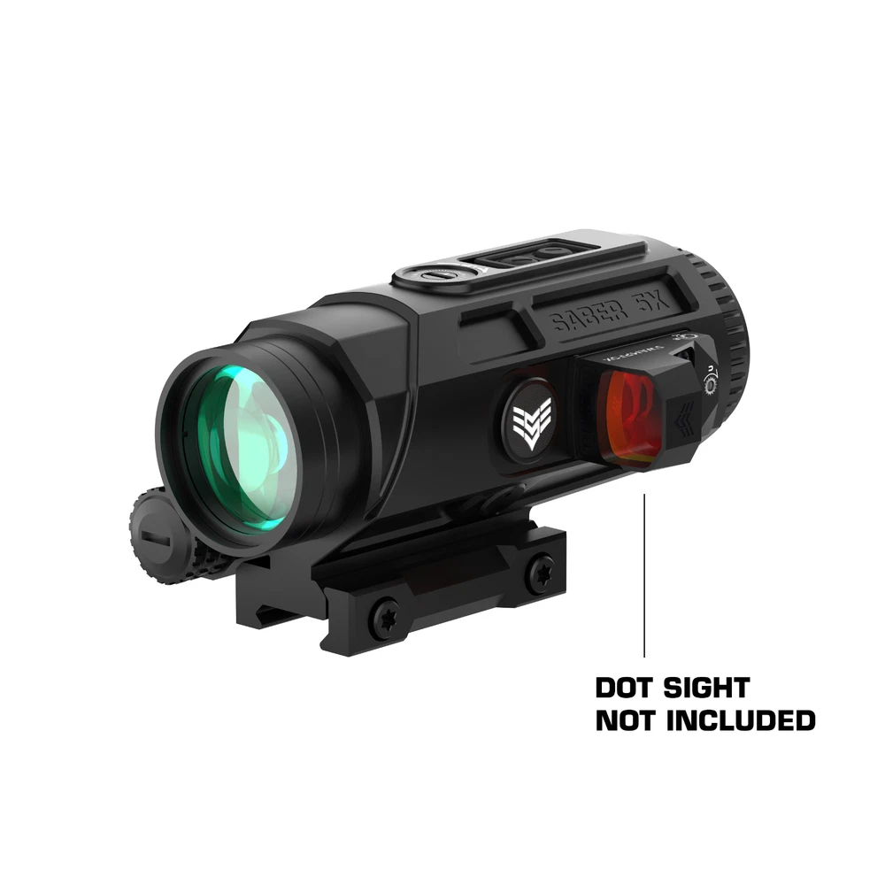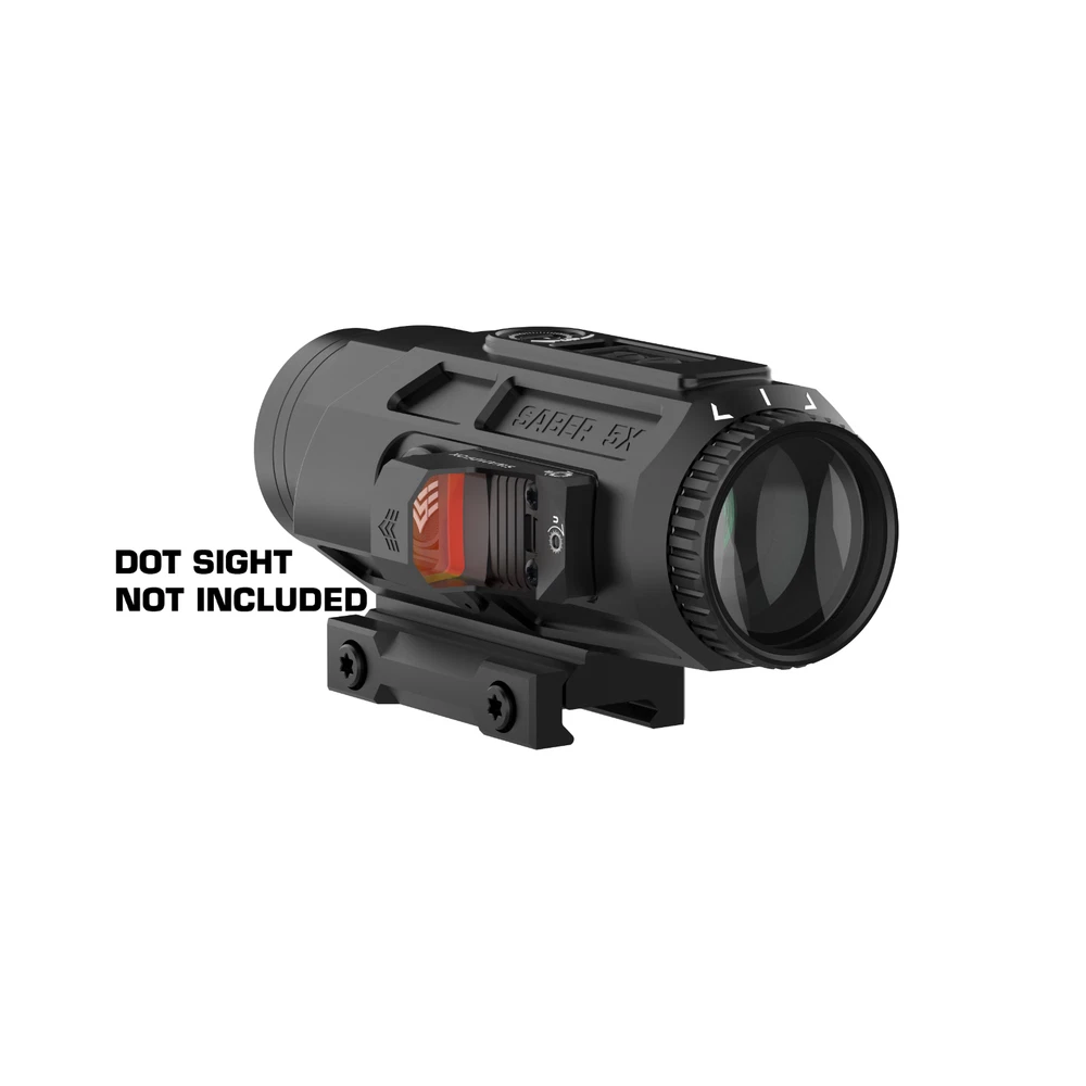Saber is a 5x prism featuring the new ambidextrous 90-degree micro red dot mount giving the ability to rapidly transition from 1x to 5x. True ten-degree field of view returns providing the largest sight picture on the market. Choose from red or green illuminated “Shake ‘N Wake” etched Strike MOA reticle. The Saber combines legacy technology with cutting edge additions giving the shooter an ergonomic and uncompromised experience. A TRUE 5X PRISM-- Our 5x prism scopes offer great optical clarity and mid-distance precision in a simple, compact package – True 10 degree field of view (much greater lateral vision) from a 36 mm objective lens, meaning more targets are seen with faster follow on acquisition ADVANCED RETICLE -- Chemically etched Strike MOA reticle. Red or Green illumination offers a thick illuminated ring drawing your eye to the center for fast snap action and a 42 MOA vertical hold ladder. Even works (black reticle) if the battery dies EXTREME BATTERY LIFE—NO CR 2032 here (235 mah). Saber combines a proven Shake ‘N Wake system with a CR 123a battery (1550 mah) for up to 6 times the illumination life. Reticle illumination shuts off after 225 seconds without motion – Instant return with motion BUILT IN MOUNTS—Built in main 1913 MIL STD Picatanny base only uses 7 slots -- AND no need for extra 90° or 45° offset mounts. SABER has built in dual (ambi) SIDECAR 90° Sentinel mounts. 30° roll enables superfast transition from 5x (mid distance) to 1x CQB LIGHT—All this an weighs less than most LPVO’s