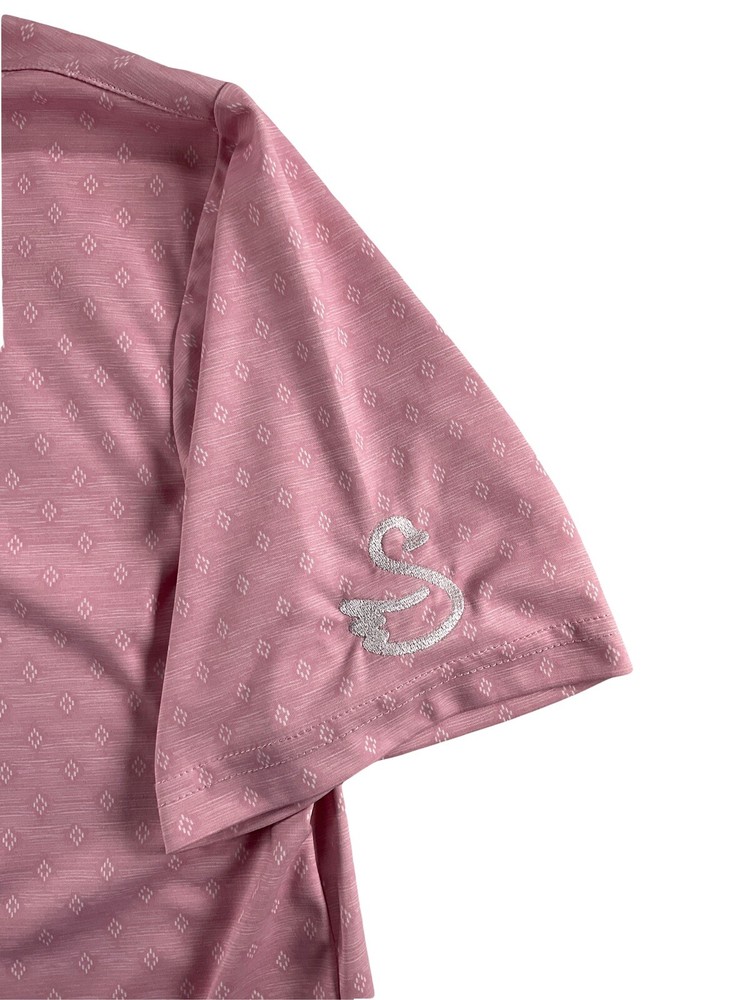 Swannies Golf Eddie-B Polo Southwestern Diamond Tech Stretch PGA Players Pink M Preowned - Excellent Used Condition This Is A PGA Tour Player's Sponsored Polo Worn On Tour With Swannies Logo On Shoulder Dry Cleaned Only Size - Medium Color - Flamingo Armpit To Armpit - 21.5" Fly Active: Lightweight, breathable, easy care, max stretch Three button placket Collar stay Full stretch Durable performance fabric REPREVE recycled water bottle fabric 100% REPREVE Polyester