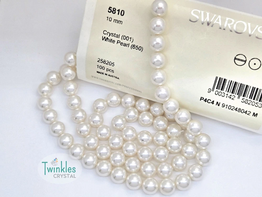 Swarovski Crystal Pearl Item No: 5810 Color: White Item Name: Swarovski Round Pearl Condition: Brand New Brand : Swarovski Shape : Round Made in Austria Weight: 10 - 220grams Factory Pack Q'ty Bead Hole ================================= 3mm 1000 pcs 0.6 mm 4mm 500 pcs 0.7 mm 5mm 500 pcs 0.7 mm 6mm 500 pcs 0.8 mm 8mm 250 pcs 0.9 mm 10mm 100 pcs 0.9 mm Free s tandard shipping on any $35 purchase ** We guarantee the style is the same as shown in the pictures ** We accept returns within 30 days in original condition
