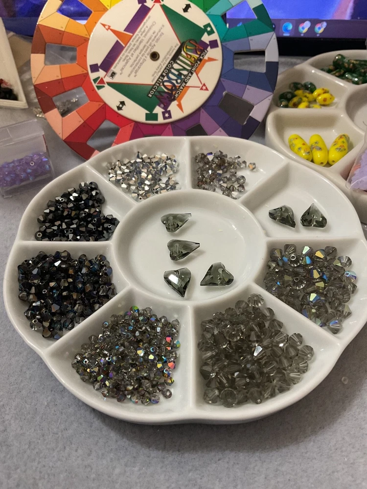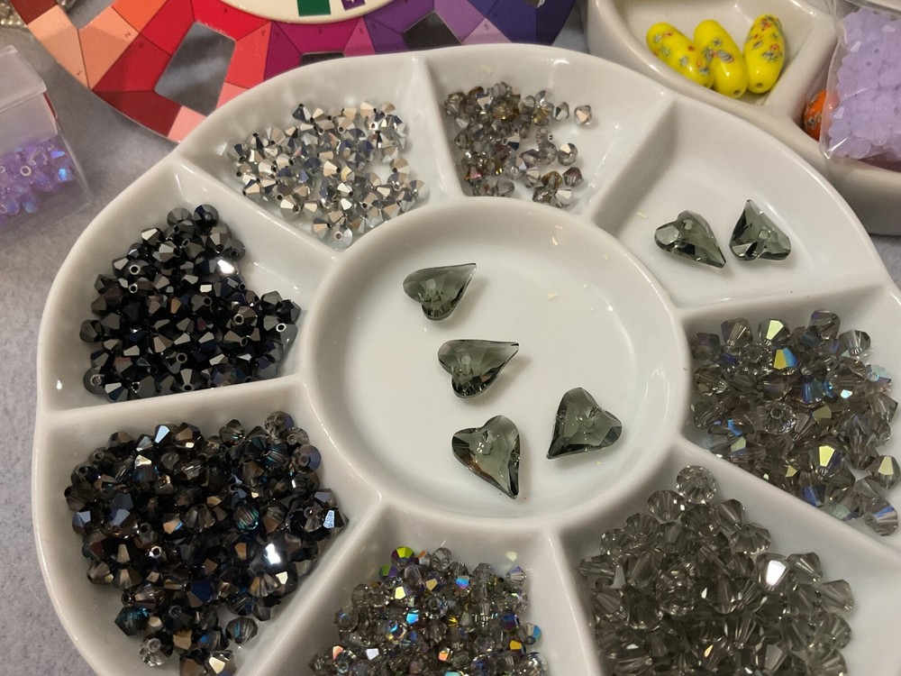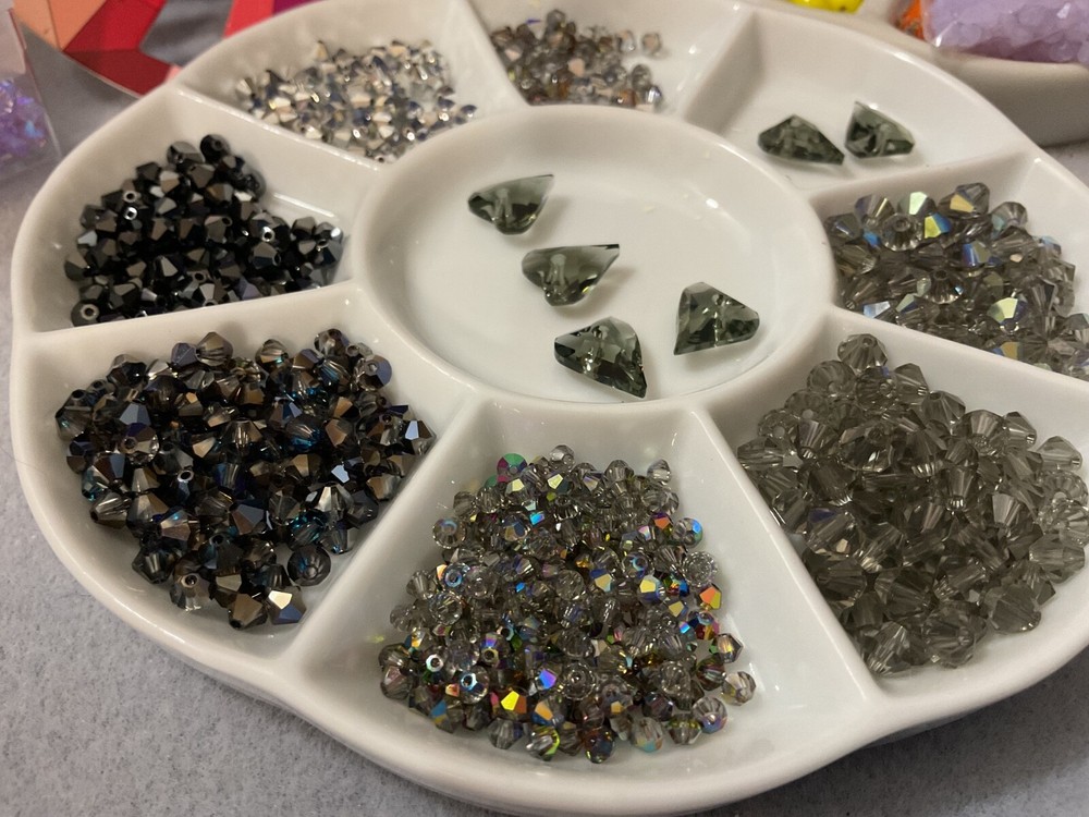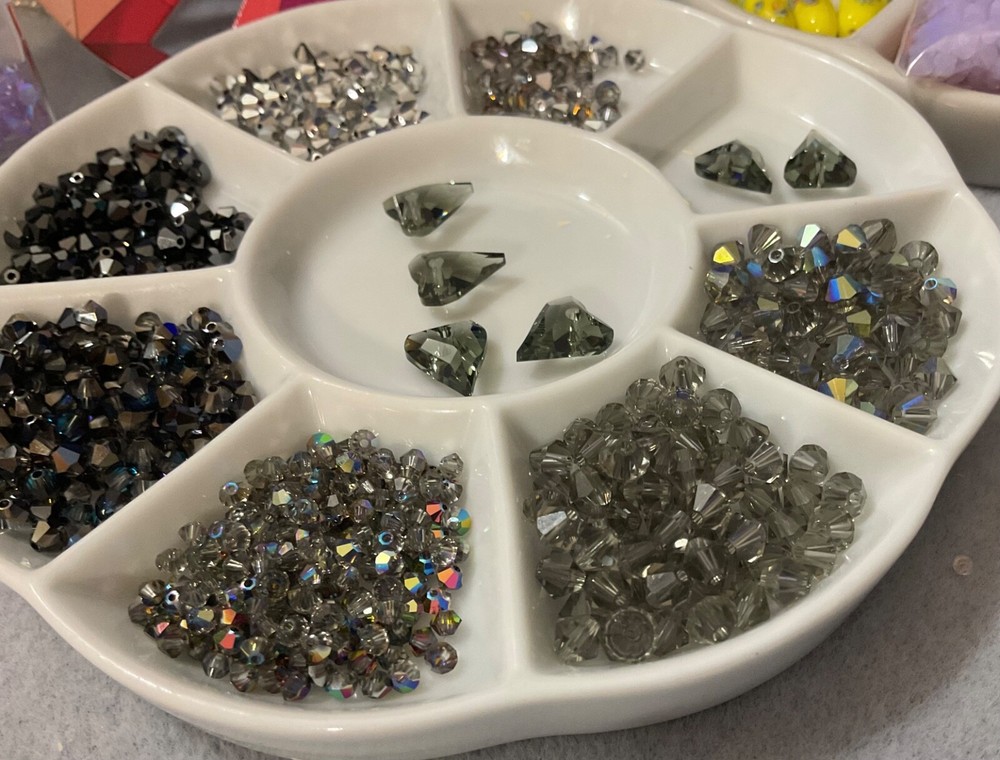 Vintage Swarovski Bead Lots inspire your unique creations to stand out while offering the air of exclusivity your Bead Art Jewelry Designs desire. Swarovski Crystal 5301 Bicone Bead LOT BLACK Diamond / Hearts 3mm Transparent AB Black Diamond, 4mm Transparent AB 2x Crystal Gray, 4mm Opaque Hematite-2, 5mm Transparent Black, Diamond, 6mm Transparent AB Black Diamond, 12mm Transparent Black Diamond Hearts, 4mm BERB, 4mm VOL Additionally, this bead lot comes in Various sizes of Flip-Top Tube bead storage containers. My Swarovski Crystal & Czech Glass Bead Lot Collections offer significant savings, featuring various beads and crystal sizes in one bead lot, with postage savings alone - as postage continues its meteoric rise - savings that you can put towards ordering the best in quality beads and beading supplies for your Bead Art Jewelry Designs. Bead Lot includes what's listed/pictured and Flip Top Tube packaging: 3mm Transparent AB Black Diamond 4mm Transparent AB 2x Crystal Gray 4mm Opaque Hematite-2 5mm Transparent Black Diamond 6mm Transparent AB Black Diamond 12mm Transparent Black Diamond Hearts 4mm BERB 4mm VOL All of my Swarovski listings are Vintage or Circa (manufactured before or around) 1998 - 2003.. As most jewelry designers, bead artists, and crafters know, Swarovski no longer just sells to smaller, unauthorized, contract-bound resellers. With all that being said, and although there are others with limited offerings of Swarovski Crystal Beads, Bicones & Pendants, we all know that, unless an authorized reseller, what is being offered/listed is it. NOTE : Even authorized resellers will not have many of the colors, sizes, and finishes as the latest Swarovski Crystal Designs have changed considerably. There are some amazing Crystals bead manufacturers which my wholesaler and certified Swarovski dealer highly recommend; these brands are more than comparable replacements for anything Swarovski.