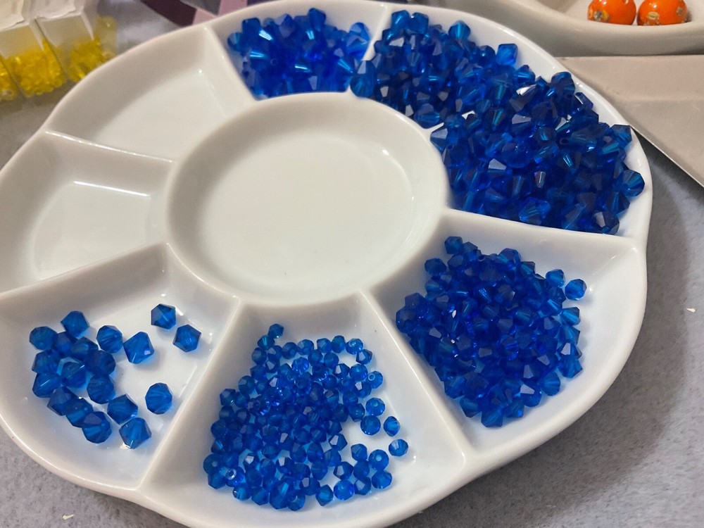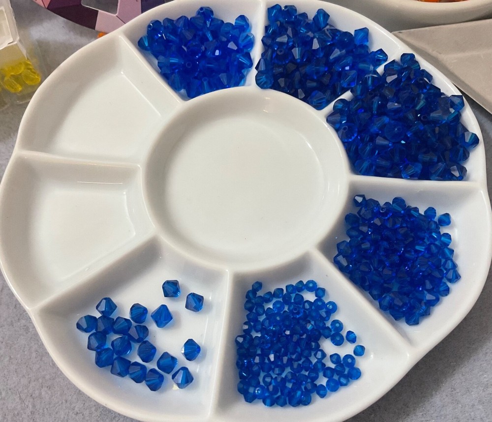 Curated Bead Lots are perfect for inspiration, gift giving, creativity in unique designs with limited beads, and selling designs at higher price points. Swarovski 5301 Bicones Curated Bead LOT CAPRI Blue Crystal Too, this bead lot comes in Various sizes of Flip Top Tube containers. In this economy, the very activities that give us pleasure are what we give up first to save money; however, studies show as well as my bead/craft suppliers that a recession and bad economies are their most profitable. They’re not exactly sure what this is an economic indicator of, but recession after recession has proven to be very profitable for their bottom line. And many of those indulging their craftsmanship during these times seem to come out the other end with a skill they can monetize. My Swarovski Crystal & Czech Glass Bead Lot Collections, offer quite the savings; offering various beads and crystal sizes in one bead lot with postage savings alone, especially as postage continues its meteoric rise, is a huge financial savings with no need to compromise on the quality of their beading supplies. Bead Lot includes what's listed/pictured and Flip Top Tube packaging: 3mm 5301 Capri Blue 4mm 5301 Capri Blue 6mm 5301 Capri Blue 5mm 5301 Capri Blue All of the Swarovski I'm listing are either Vintage or manufactured before or around (Circa) the year I have indicated. After the final clean-out of a storage unit it was clear that Swarovski Crystals, that were put away years ago, finally decided to reveal their location and there is a boatload. As most jewelry designers, bead artists and crafter's know, Swarovski no longer just sells to smaller, unauthorized, contract-bound, resellers. After trying to find information about the treasured Swarovski uncovered I tried to just get some basic information so that I can get accurate descriptions, price ranges and the like; only to realize that the Swarovski colors, finishes that I have in my possession are no longer made-I do have access to all of their new designs and colors which is what I was trying to use to gather information; and although their new colors, and designs are AMAZING, there is very, very, little left to reference any previously produced Swarovski. With all that being said, I'm doing my best to identify colors from the terribly faded packaging and I'm just putting similar colors together and selling as Swarovski Bead Lots, pictures are the best but the quality is clearly Swarovski.