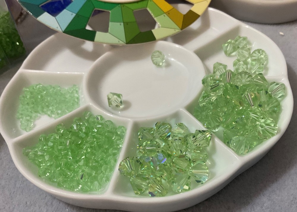 Curated Swarovski Chrysolite Lot is perfect for inspiration, gift giving, creativity in unique designs with limited beads, and selling designs at higher price points. Swarovski Crystal 5301 Transparent Bead LOT in Chrysolite & AB Chrysolite Too, this bead lot comes in Various sizes of Flip Top Tube containers. In this economy, the very activities that give us pleasure are what we give up first to save money; however, studies show as well as my bead/craft suppliers that a recession and bad economies are their most profitable. They’re not exactly sure what this is an economic indicator of, but recession after recession has proven to be very profitable for their bottom line. And many of those indulging their craftsmanship during these times seem to come out the other end with a skill they can monetize. My Swarovski Crystal & Czech Glass Bead Lot Collections, offer quite the savings; offering various beads and crystal sizes in one bead lot with postage savings alone, especially as postage continues its meteoric rise, is a huge financial savings with no need to compromise on the quality of their beading supplies. Bead Lot includes what's listed/pictured and Flip Top Tube packaging: 3mm 5301 Chrysolite 4mm 5301 Chrysolite 8mm 5301 AB Chrysolite 8mm 5301 Chrysolite All of the Swarovski I'm listing are either Vintage or manufactured before or around (Circa) the year I have indicated. After the final clean-out of a storage unit it was clear that Swarovski Crystals, that were put away years ago, finally decided to reveal their location and there is a boatload. As most jewelry designers, bead artists and crafter's know, Swarovski no longer just sells to smaller, unauthorized, contract-bound, resellers. After trying to find information about the treasured Swarovski uncovered I tried to just get some basic information so that I can get accurate descriptions, price ranges and the like; only to realize that the Swarovski colors, finishes that I have in my possession are no longer made-I do have access to all of their new designs and colors which is what I was trying to use to gather information; and although their new colors, and designs are AMAZING, there is very, very, little left to reference any previously produced Swarovski. With all that being said, I'm doing my best to identify colors from the terribly faded packaging and I'm just putting similar colors together and selling as Swarovski Bead Lots, pictures are the best but the quality is clearly Swarovski.