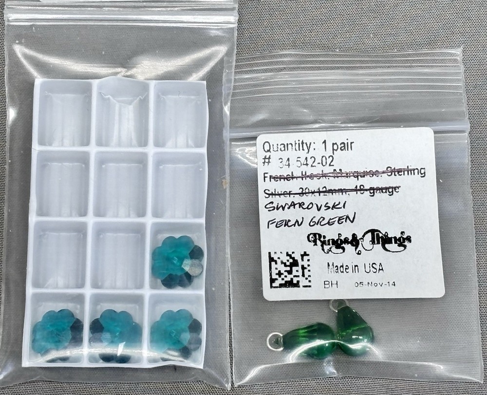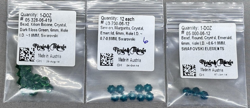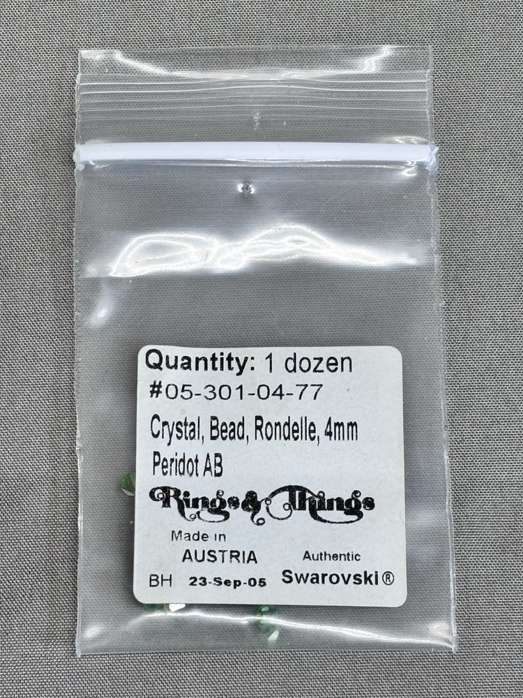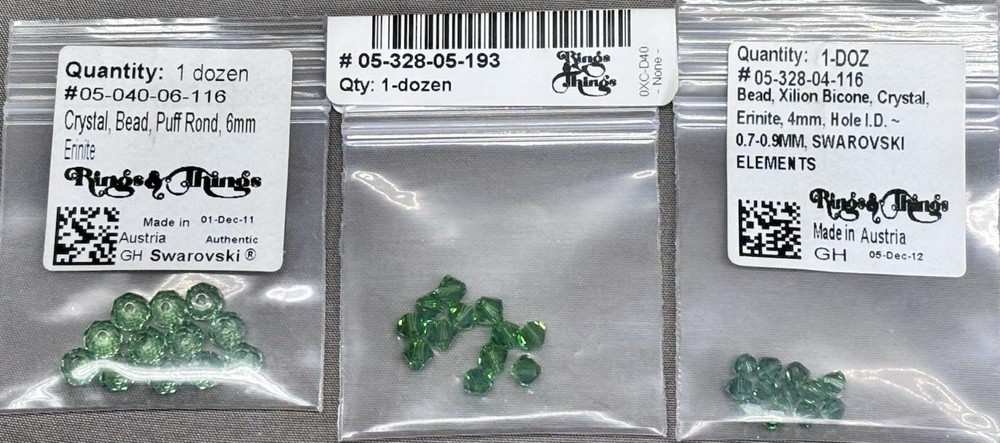 Swarovski Crystal Bead Lot Green Emerald Peridot Bicone Round Rondelle Mixed This mixed lot includes authentic Swarovski crystal beads in green and emerald tone colorways. All pieces are genuine Swarovski Elements made in Austria and are sold together as one assorted lot. •Brand: Swarovski •Material: Crystal •Colors: Emerald, peridot, fern green, dark moss green, erinite •Styles: Bicone, round, rondelle, puff round, sew on margarita, briolette •Sizes: Approximately 4mm and 6mm •Hole sizes: Vary by bead style, see labels and photos •Condition: New unused beads from original labeled packaging •Origin: Made in Austria and USA for Swarovski Elements •Quantity: Mixed lot as shown, sold together These high quality Swarovski crystals are ideal for jewelry making, beadwork, repairs, or adding to an existing crystal bead collection. Please review all photos carefully to confirm styles, colors, and quantities included. Ships securely.