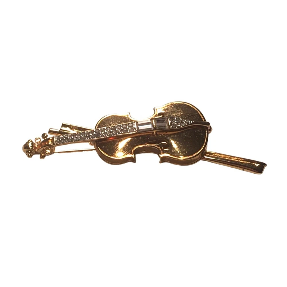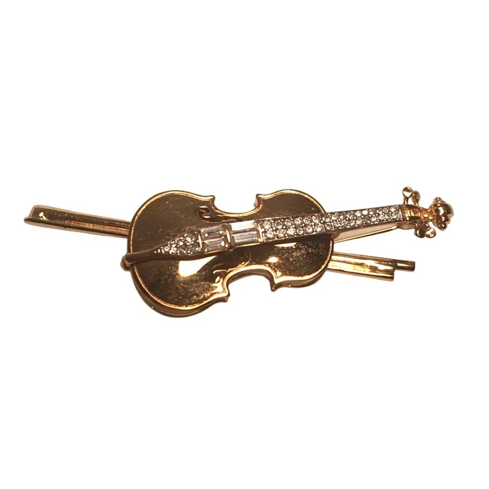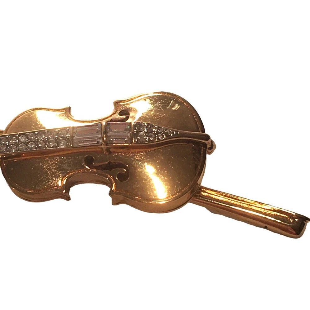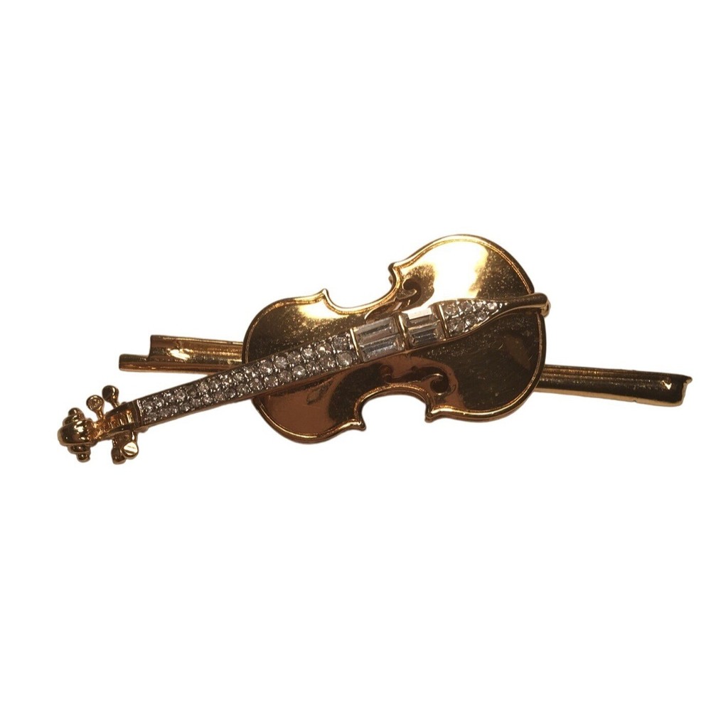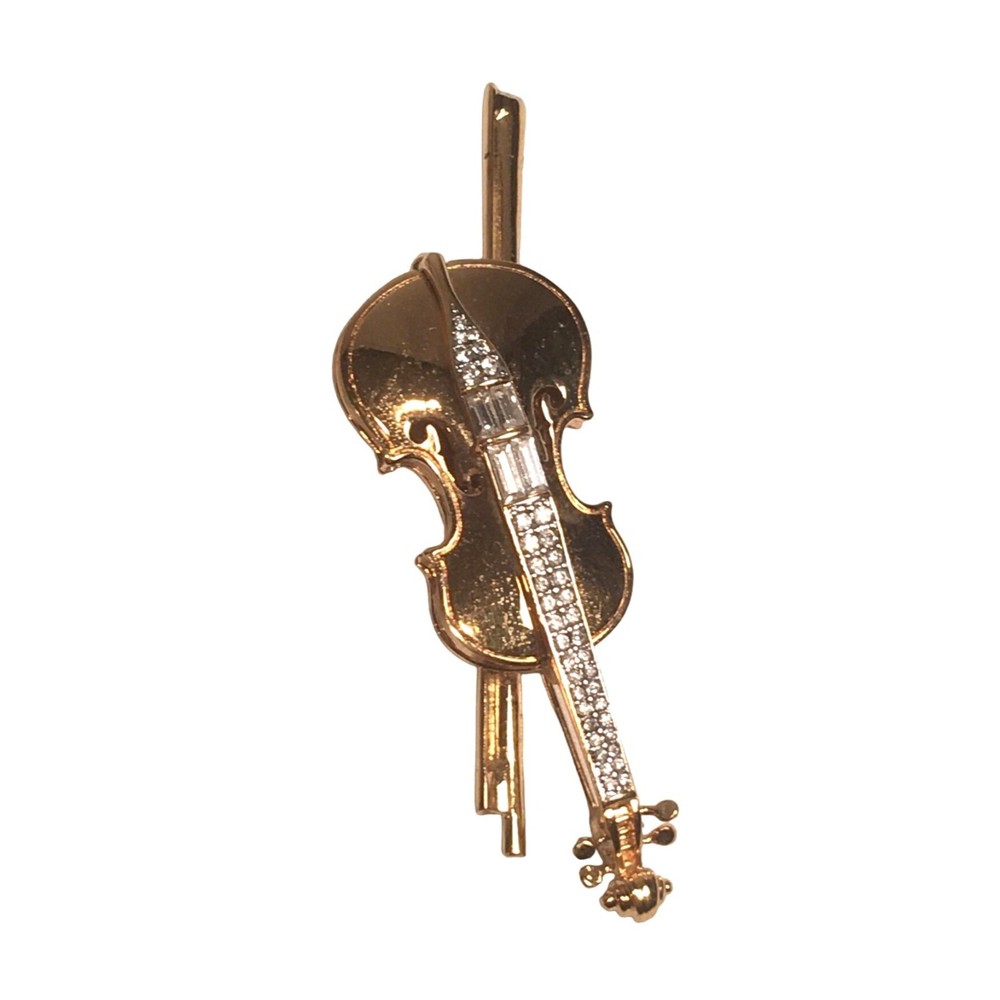 Swarovski Crystal Violin Brooch Pin Musical String Instrument Orchestra Gold Tone Signed Swan High Fashion Jewelry This beautifully made Swarovski brooch is gold plated with beautiful clear crystals accenting the fingerboard string area of the violin. The crystals are done in round and baguette stones for a nice design element. This is a gorgeous brooch and will be a wonderful addition to any collection; Swarovski, brooch, music, musical instruments. Clasp - Rolling and firm, Pin is straight Marking - Swan hallmark on the bottom Measurements Approximately: 3" W X 1" H Condition: Pre-Owned & Used Good condition, back side has some gold tone metal removed, looks like glue along back of violin where the bow is attached as if it may have been repaired. The bow is firmly attached. Some light scratching and color variations on surface. Please see all photos. Swarovski, Crystal, Violin, Brooch, Pin, Musical, String, Instrument, Orchestra, Gold, Tone, Signed, Swan, High Fashion Jewelry All jewelry purchases will include a beautiful gift box unless in its original box. All items will ship by ground advantage mail unless buyer selects priority mail at the time of purchasing. Items will be shipped out quickly. We strive hard to describe items as accurately as possible including listing condition issues and adding photos. If you feel the item is not as described please contact us and describe where you feel we missed the mark. Many of the items we sell are vintage so we ask you to keep that in mind as they are many years old. With age items may have normal wear and tear or have limited additional life span all items sold as is. Please take this fact into your purchasing decisions. We give much attention and care to packaging our items so there is no breakage or damage. If you are unsatisfied for any reason PLEASE reach out to us before leaving negative feedback so we can make you a happy customer. Return policy please contact us within 48 hours of receiving your item to inform us of any issues. Thank you for looking and shopping Treasures Found in Time we appreciate you.