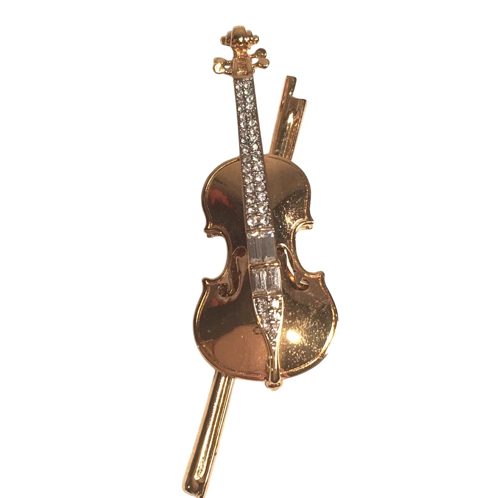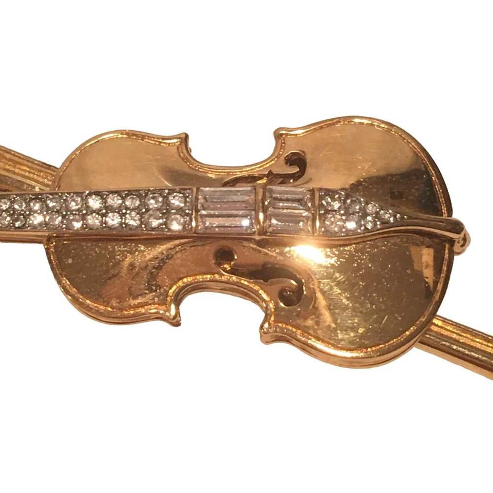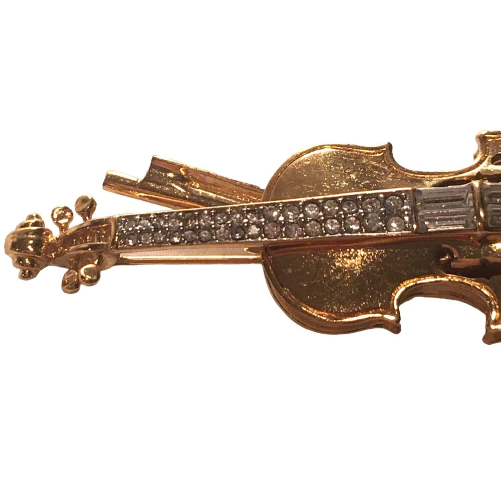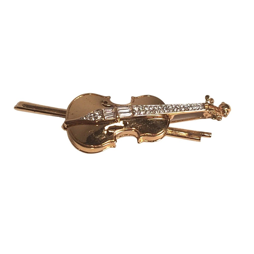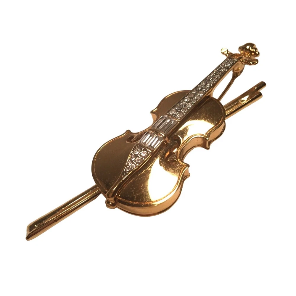 Swarovski Crystal Violin Brooch Pin Musical String Instrument Orchestra Gold Tone Signed Swan High Fashion Jewelry This beautifully made Swarovski brooch is gold plated with beautiful clear crystals accenting the fingerboard string area of the violin. The crystals are done in round and baguette stones for a nice design element. This is a gorgeous brooch and will be a wonderful addition to any collection; Swarovski, brooch, music, musical instruments. Clasp - Rolling and firm, Pin is straight Marking - Swan hallmark on the bottom Measurements Approximately: 3" W X 1" H Condition: Pre-Owned & Used Good condition, back side has some gold tone metal removed, looks like glue along back of violin where the bow is attached as if it may have been repaired. The bow is firmly attached. Some light scratching and color variations on surface. Please see all photos. Swarovski, Crystal, Violin, Brooch, Pin, Musical, String, Instrument, Orchestra, Gold, Tone, Signed, Swan, High Fashion Jewelry All jewelry purchases will include a beautiful gift box unless in its original box. All items will ship by ground advantage mail unless buyer selects priority mail at the time of purchasing. Items will be shipped out quickly. We strive hard to describe items as accurately as possible including listing condition issues and adding photos. If you feel the item is not as described please contact us and describe where you feel we missed the mark. Many of the items we sell are vintage so we ask you to keep that in mind as they are many years old. With age items may have normal wear and tear or have limited additional life span all items sold as is. Please take this fact into your purchasing decisions. We give much attention and care to packaging our items so there is no breakage or damage. If you are unsatisfied for any reason PLEASE reach out to us before leaving negative feedback so we can make you a happy customer. Return policy please contact us within 48 hours of receiving your item to inform us of any issues. Thank you for looking and shopping Treasures Found in Time we appreciate you.