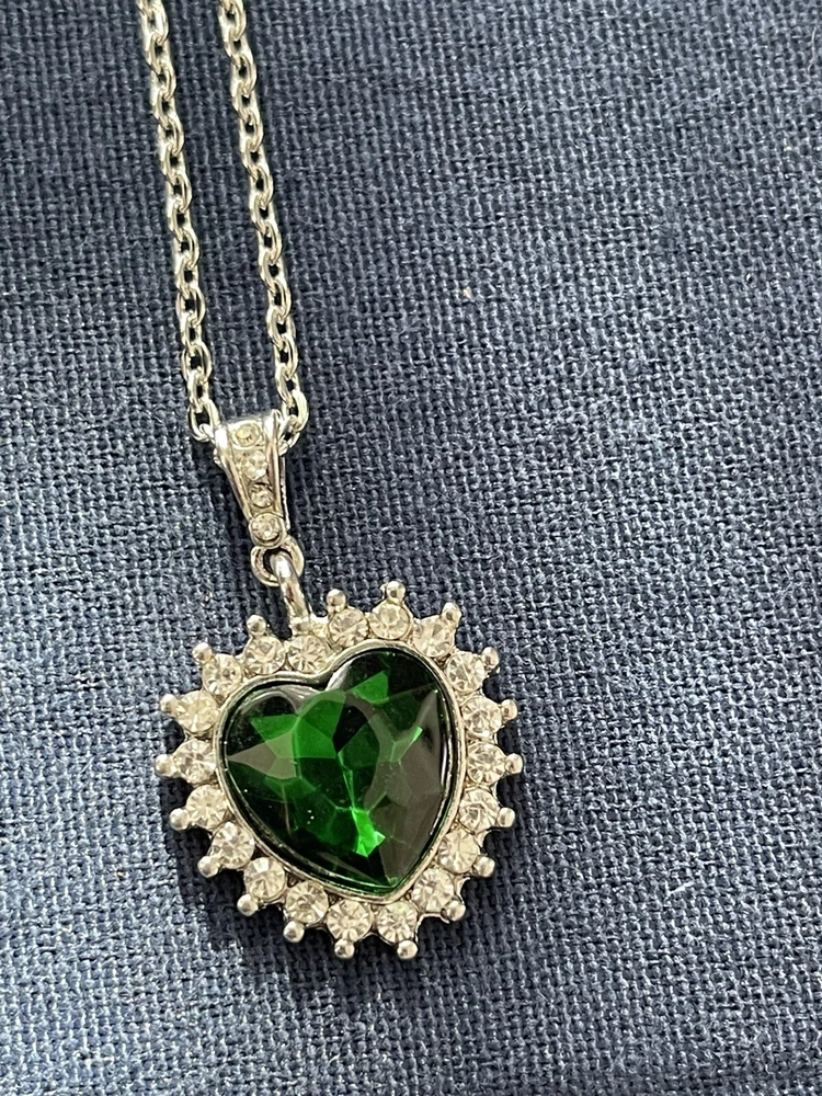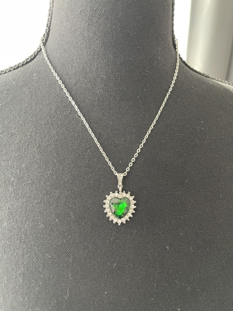 Swarovski Crystal Heart Shaped Necklace Green Gem Surrounded By Clear Crystals 10 in with 3 in extender