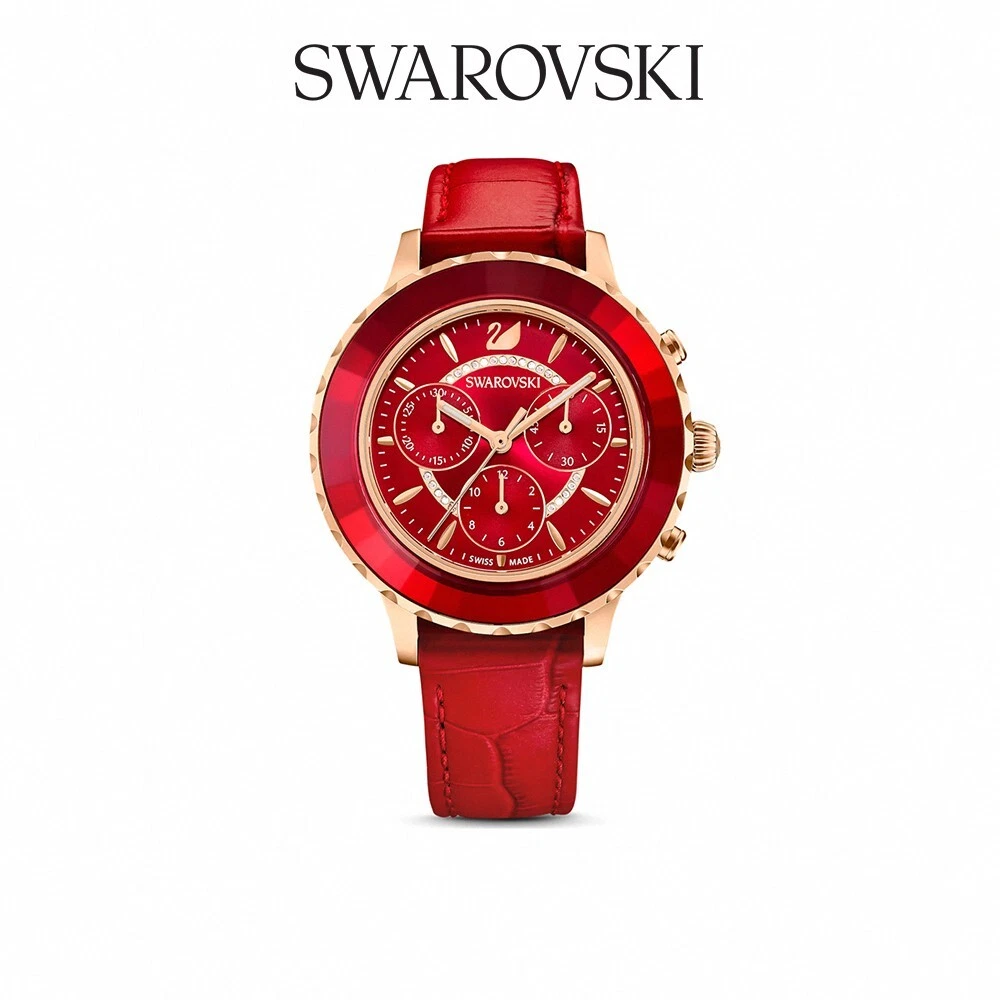Swarovski Crystal Gifts ! Swarovski Octea Lux Chrono Rose Gold Quartz Red Watch with Leather Strap, Crystals, Swiss Made Octea Lux Crystal Watch Collection, Red Model # 5646975 Brand New in Swarovski Case Will come Gift Boxed Our bestselling Octea watch collection reaches new levels of precision and craftsmanship with this luxurious new chronograph watch Perfect for everyday wear, it features a stopwatch function with accumulated and interval timing The case is worked in rose gold-tone coated stainless steel, while the faceted crystal bezel exclusive to Swarovski watches, sunray dial, and crocodile-embossed genuine leather strap, all shine in emerald red tones. Case: 39 mm, water resistant to 50 m Our bestselling Octea watch collection reaches new levels of precision and craftsmanship with this luxurious new chronograph watch. Perfect for everyday wear, it features a stopwatch function with accumulated and interval timing. The case is worked in rose gold-tone coated stainless steel, while the faceted crystal bezel exclusive to Swarovski watches, sunray dial, and crocodile-embossed genuine leather strap all shine in emerald red tones Case size: 1 1/2 inches; Watch strap length: 7 1/2 inches; Swiss Made