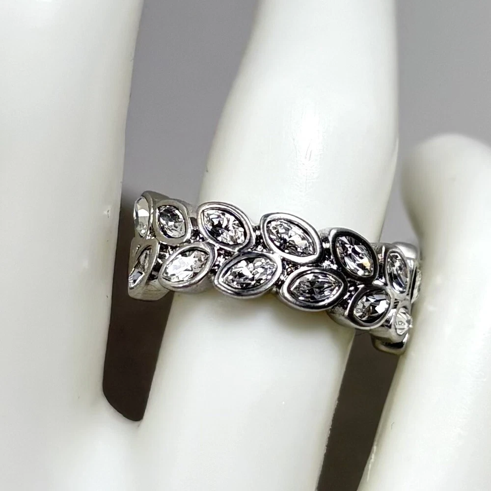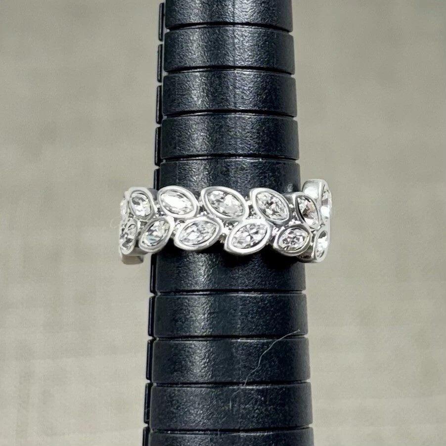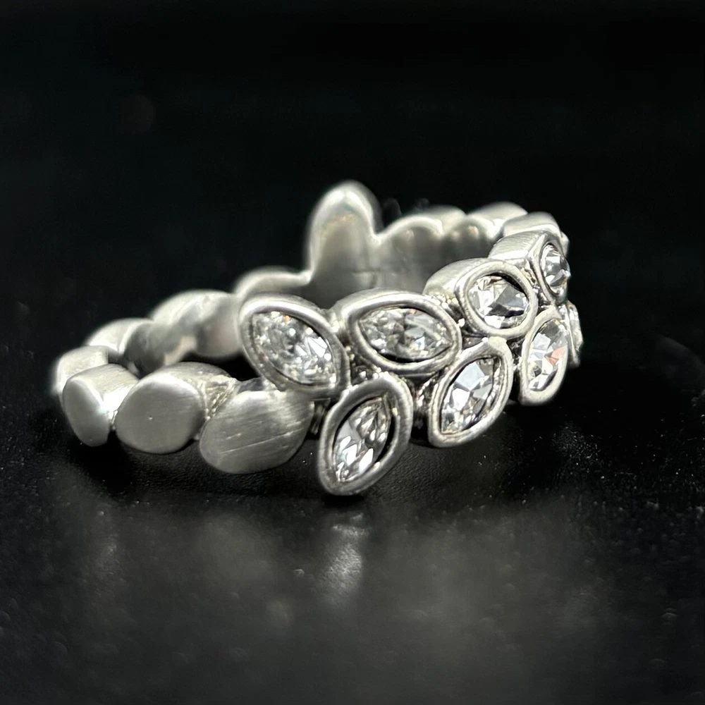 Touchstone Swarovski Olympia Crystal Ring Sz 7 Cocktail Leaf Brushed Silver Tone Great condition! The brushed silver tone finish is intact and bright, and the crystals are clean and sparkly. This ring definitely makes a statement! Please see pictures for details and message me with any questions.