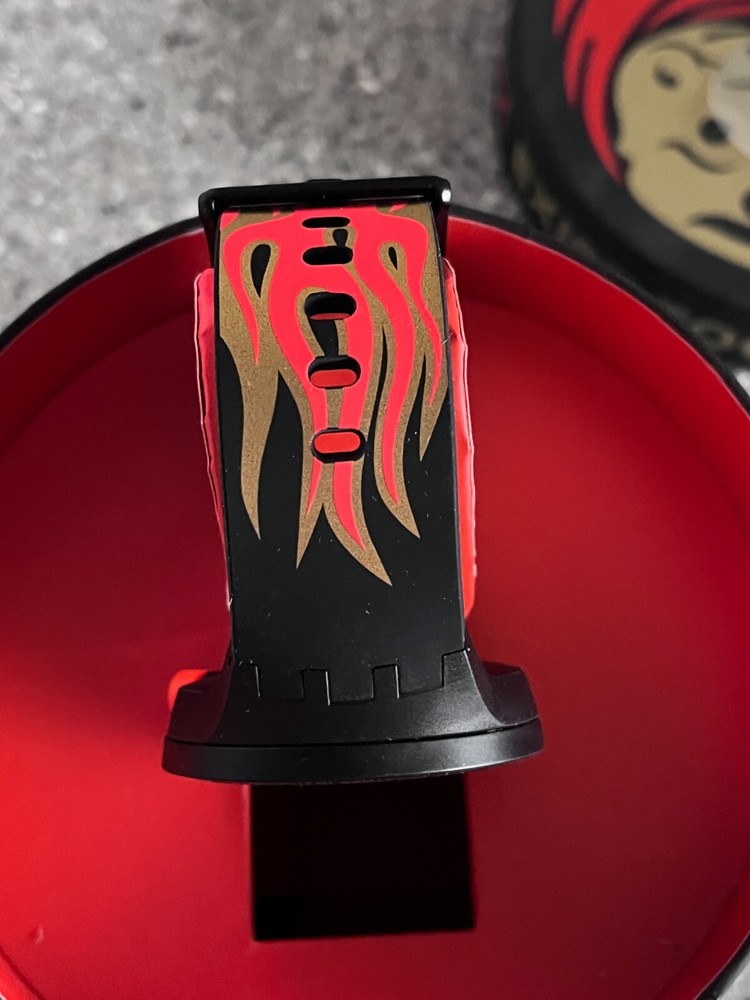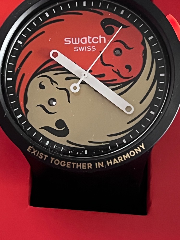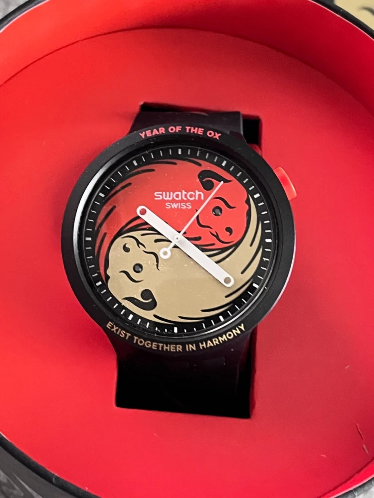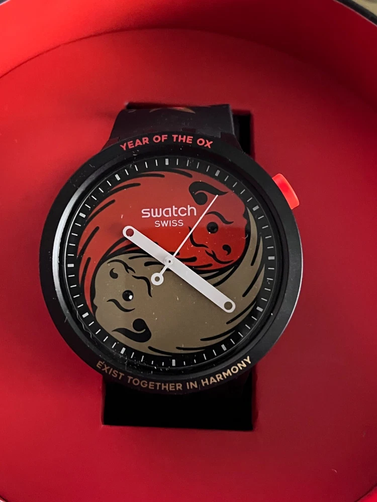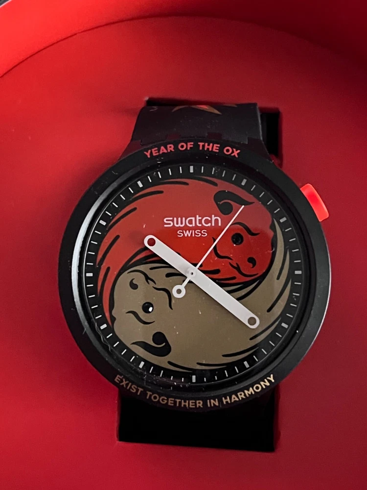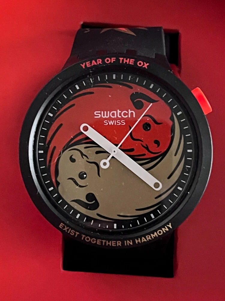 Celebrate the Year of the Ox with this limited edition Swatch watch. Featuring a stunning design inspired by the Chinese zodiac, this timepiece is a must-have for any watch collector. It has a battery installed and is running, it will be shipped with the battery. It has flames on the band and is UNWORN BRAND NEW. With its sleek black exterior and bold red accents, the Swatch Chinese New Year Ox Rocks. Watch is sure to make a statement wherever you wear it. The watch is made by Swatch, a trusted brand in the industry, and features a variety of impressive aspects including a durable construction and reliable performance. (SO27Z109) is a must-have celebratory piece for the Chinese New Year and it comes right on time. Warmed up by the fiery black, red and gold-colored strap, the dial represents the perfectly harmonious Ox in a Ying and Yang shape, adorned with two black crystals. This has a larger 47mm face
