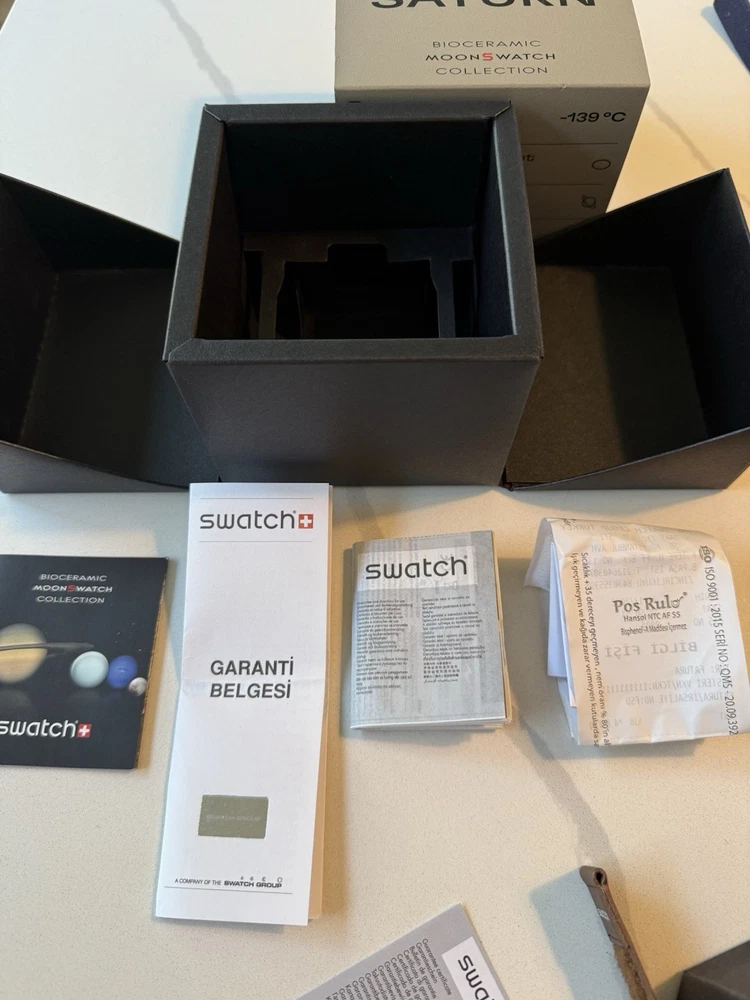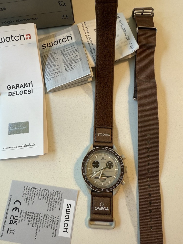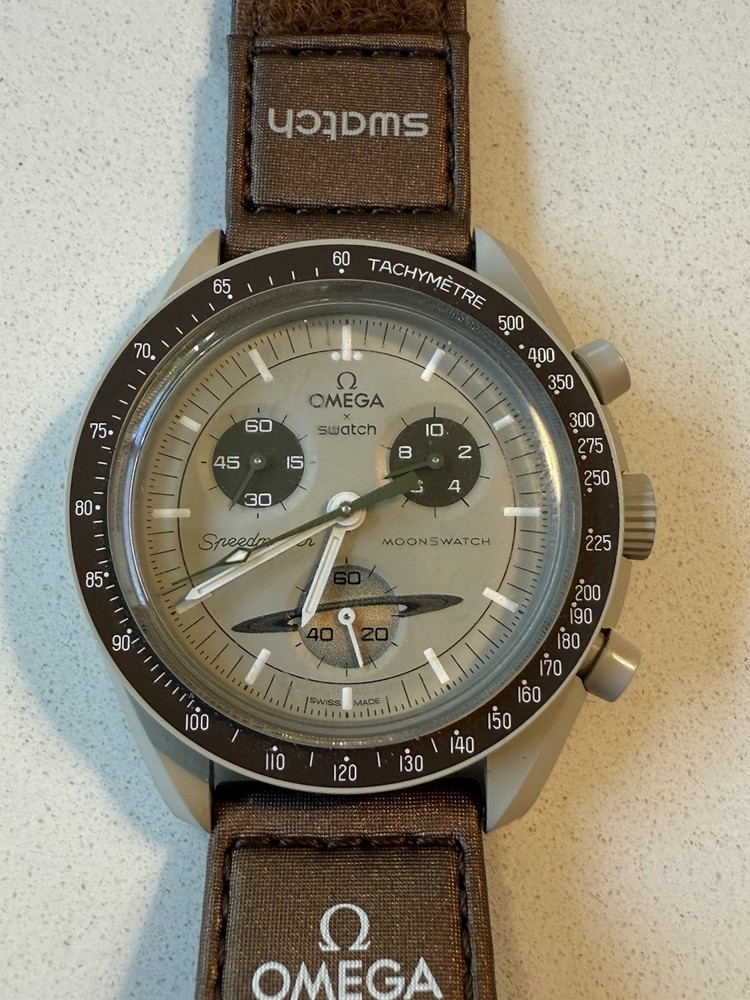 The Swatch x Omega Bioceramic Moonswatch Mission To Saturn 42 mm Beige is a luxurious and sporty wristwatch designed for men or women Featuring a beige case color and brown bezel and band, this timepiece exudes a sophisticated and stylish appeal. With Swiss-made quartz movement, water resistance up to 30 meters, and a chronograph feature, this watch is both practical and reliable for everyday wear. The unique design, including stick and baton indexes, tachymeter bezel, and snap caseback, sets it apart as a timeless and high-quality accessory for any occasion. There is one minor scratch on the dial (see pictures). It is barely noticeable. I will also include the extra brown nato strap as well. This has been worn less than 10 times.