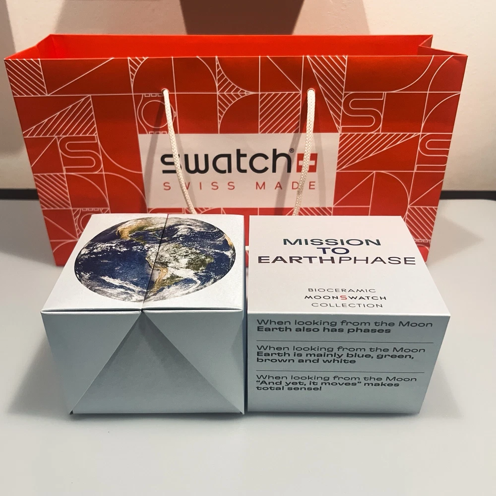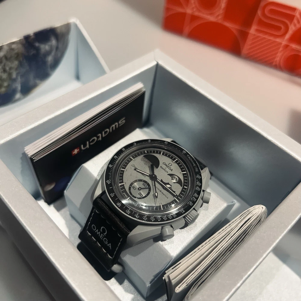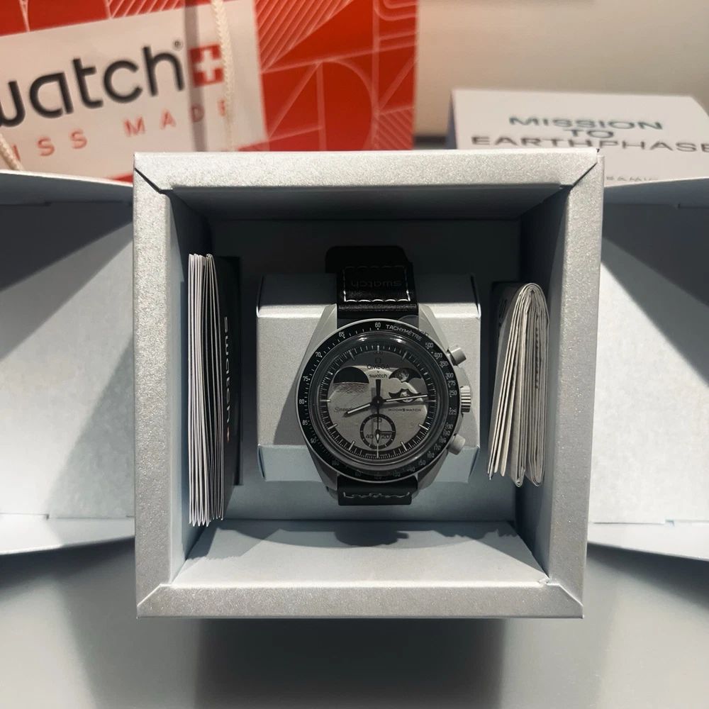 Introducing the Swatch x Omega Mission to the Earth Phase MoonSwatch wristwatch, a stunning timepiece designed for unisex adults. This watch features a black and grey dial with baton indexes, a 12-hour analogue display, and a quartz movement. The watch is water-resistant up to 30m (3 ATM) and comes with its original box and papers. The Swatch x Omega MoonSwatch is a collaboration model, with a sleek black and grey case and strap. It is a perfect addition to any watch collection and is sure to turn heads. The watch is manufactured in 2024 and has been customised with no changes made. Get your hands on this authentic Swatch x Omega Mission to the Earth Phase MoonSwatch wristwatch now.