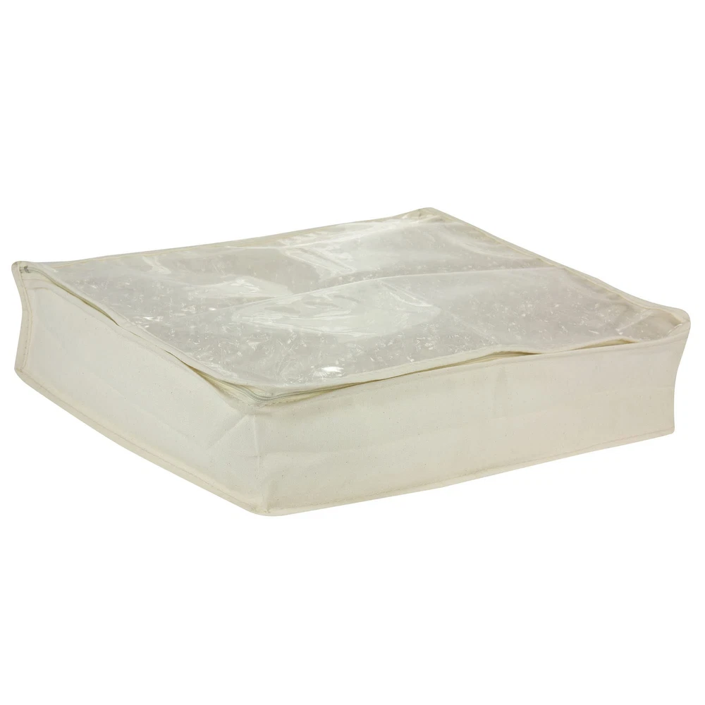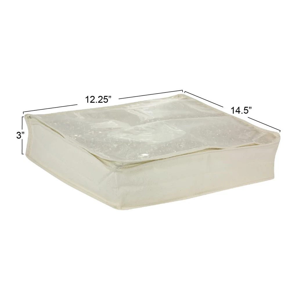 Ease the congestion in your dresser or chest of drawers and store seasonal sweaters safely in these Sweater Bags from . Slip them onto a shelf of slide them under the bed without fear of dust bunnies (there are no dust bunnies in your house, anyway). The soft, sturdy blended cotton canvas is durable and breathable, protecting delicate knits from wear and snags and letting your sweaters air during storage. With a clear PEVA zippered top, you see exactly what is in each bag—no more digging through cumbersome tote! So maximize your wardrobe space and keep sweaters as nice as possible year round and ready to be enjoyed. Item #311321 Smooth blended canvas storage container with clear plastic top for storing sweaters and shirts Provides protective storage for under the bed and on shelves Box protects bedding, clothing, and even shoes from dust and pests Clear plastic top for viewing without opening and 3-sided zipper for easy access 3"H x 14.5"W x 12.25"D