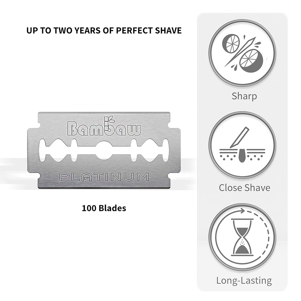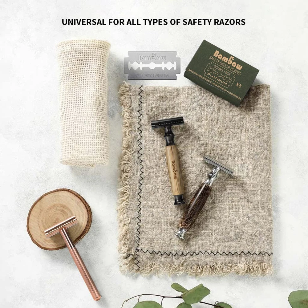 Sharp and precise – These double edge razor blades are designed to be sharp and precise to provide you with the ultimate shaving experience. Say goodbye to ingrown hairs, irritation and razor bumps thanks to these safety razor blades Durability – Crafted from premium stainless steel and coated with platinum, these double edge safety razor blades are built to last and ensure a long-lasting shave Safety – Your safety is our top priority at every step of your shaving experience. That's why our safety razor replacement blades are carefully wrapped in wax-paper, ensuring that each blade is fully protected and easy to handle Plastic-free packaging – Our double edge razor blades are packaged in eco-friendly and sustainable materials. Each pack contains 20 packs of 5 double sided razor blades, all wrapped in a kraft carton box that is fully recyclable Quality – Experience the best quality with our double edge razor blades for men and women, made in Europe with the finest materials Product Description