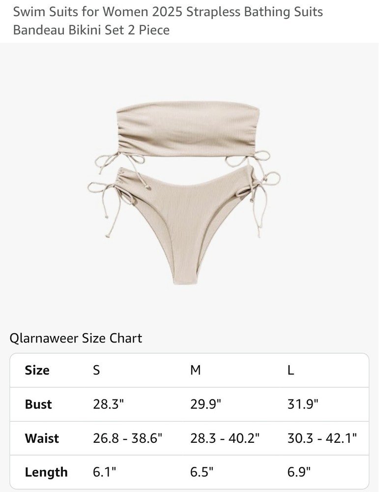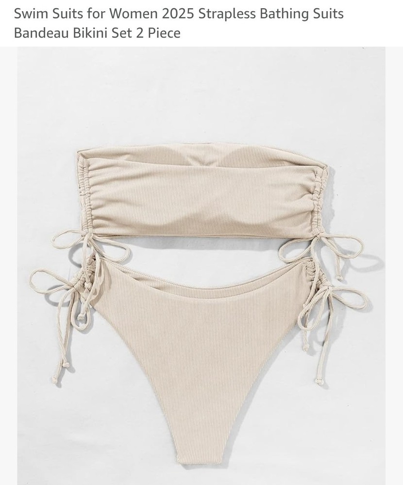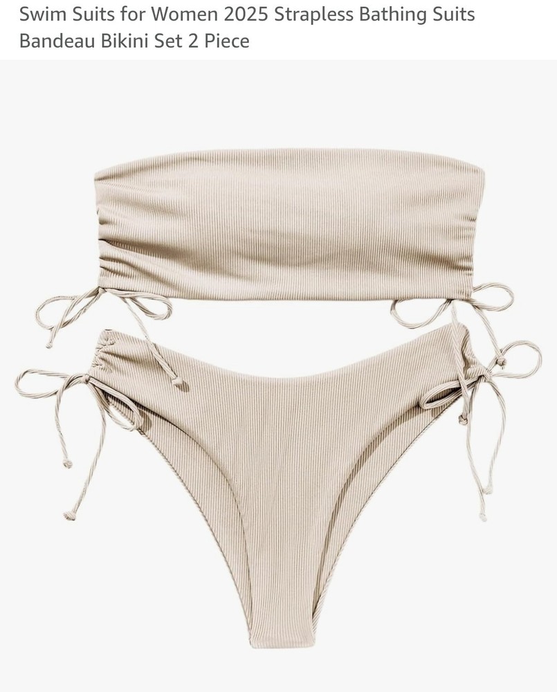 The product is a 2025 women's bandeau bikini set in crema color, featuring a strapless design and two pieces. The swim top is in a bandeau style, while the swim bottom is in a bikini style. The set is perfect for beach-themed occasions and is designed for regular size women. The bikini set is not vintage and is made in China.