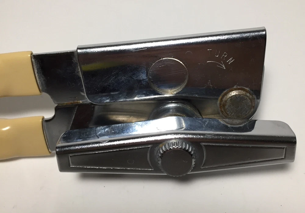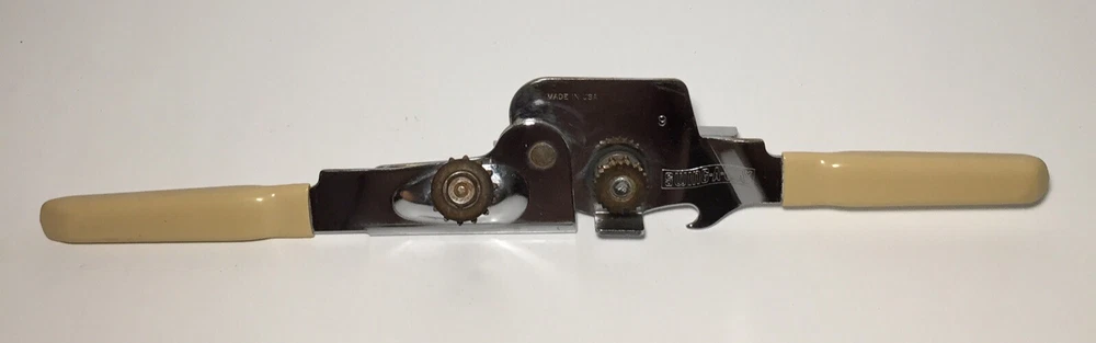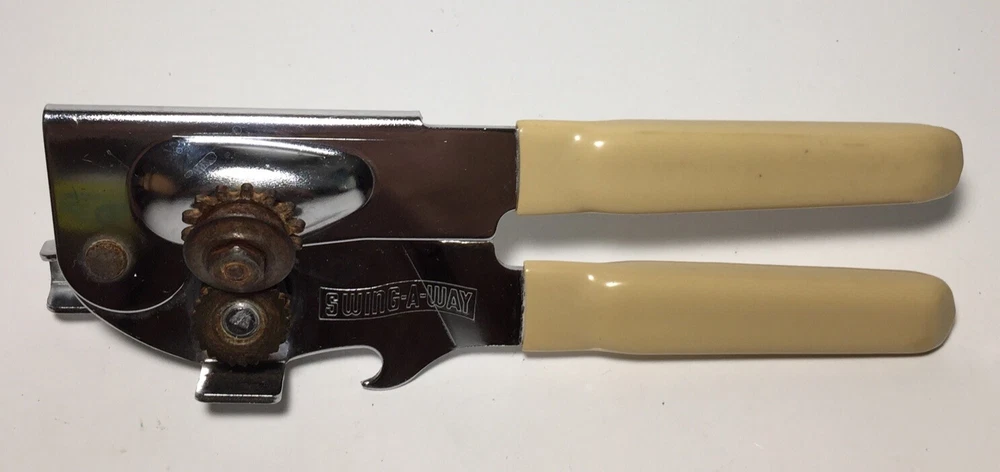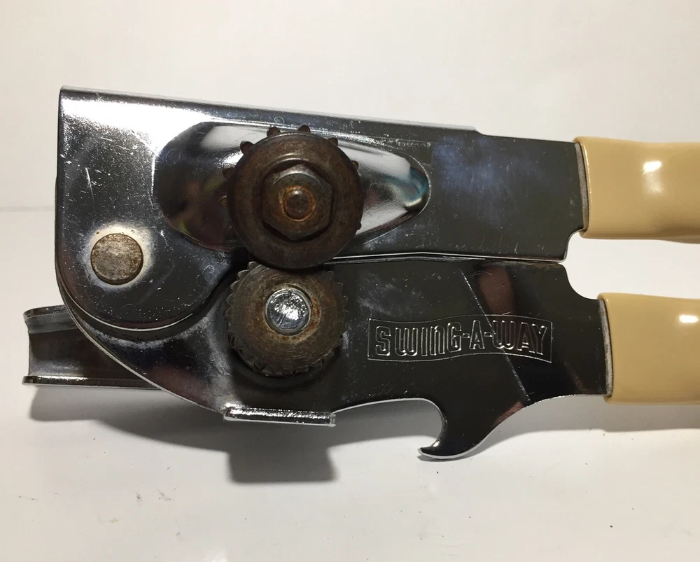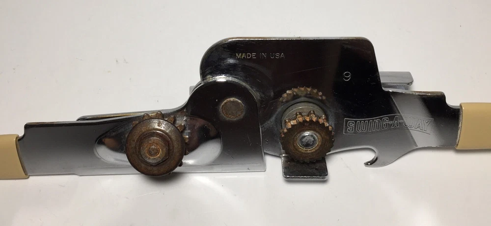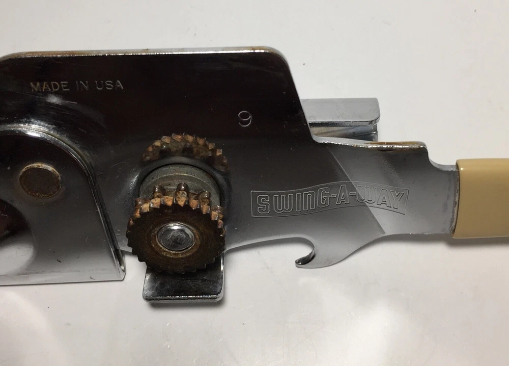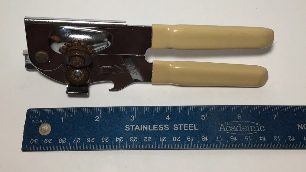 Swing Away USA 7 inch Can Opener Bottle Opener Beige Vinyl Grips Manual #9 The can opener is in good working condition. It does have some minor rust and wear from use. Please feel free to ask any questions. The item will ship out safely and securely the same or next business day.