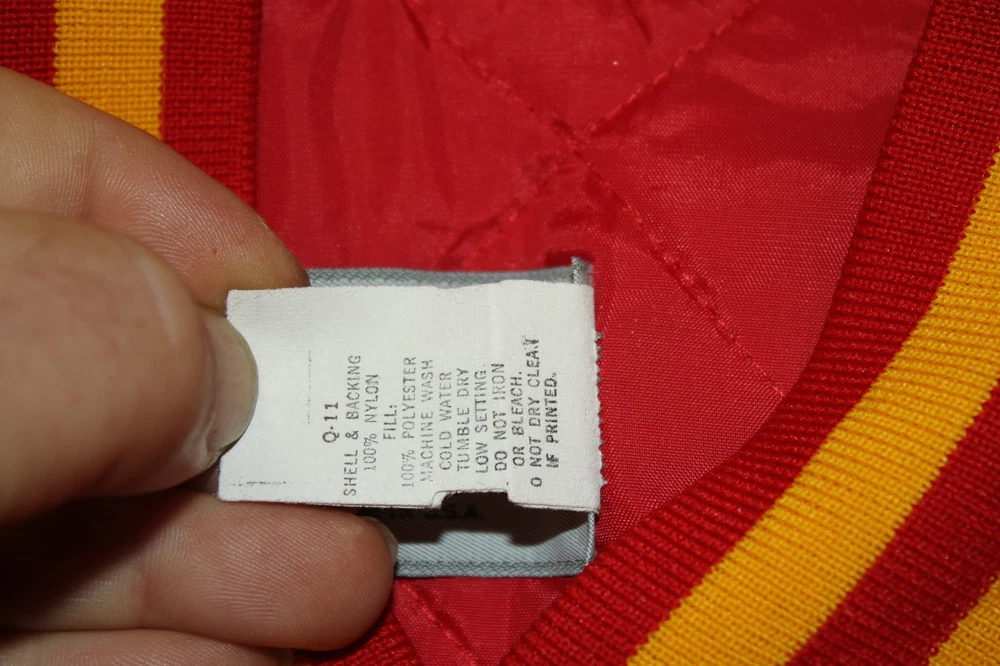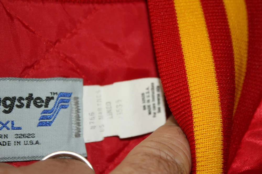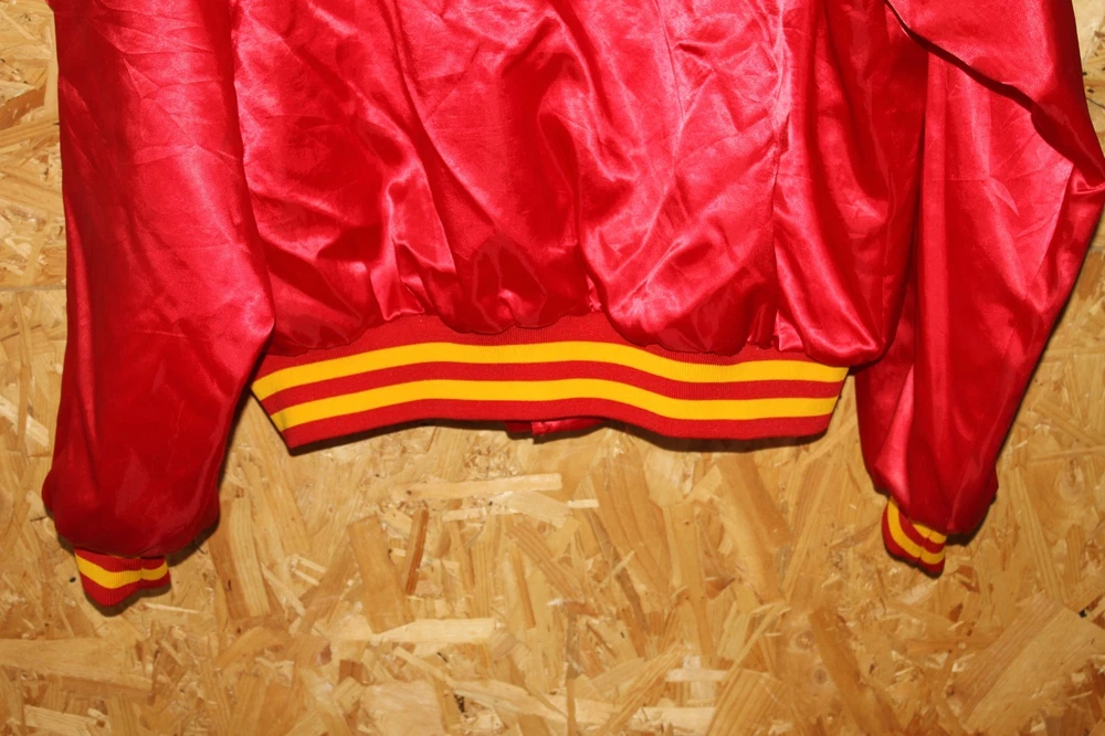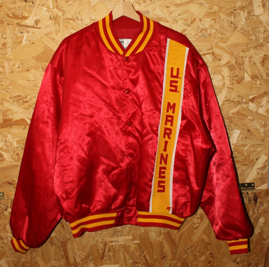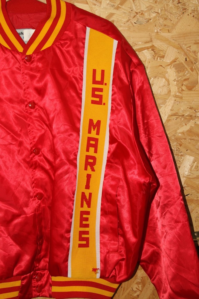 Vintage 1980s U.S. Marines Red Satin Bomber Jacket – Swingster – XXL – Made in USA This authentic vintage Swingster U.S. Marines bomber jacket is a rare Made in USA piece from the 1980s. Made from a bold red satin nylon with yellow and white striped ribbed collar, cuffs, and hem, it features a large vertical “U.S. MARINES” logo down the front. The jacket has a quilted lining for warmth and a snap-button front closure, offering classic varsity styling with a military edge. Key Features Brand: Swingster Era: 1980s Made in USA Size: Men’s XXL (vintage fit – slightly oversized) Colour: Red with yellow and white detailing Material: Nylon satin shell, quilted polyester lining Style: Varsity / Bomber Front snap-button closure Two front pockets Classic U.S. Marines logo design Condition Good vintage condition overall. There is a small fray and a minor area that needs repair near the bottom hem by the logo patch (shown in the photos). All snaps fasten securely, lining is intact, and the colour remains vibrant. Clean and wearable, with expected light signs of age for an authentic 1980s jacket. Styling & Appeal A standout retro varsity bomber with bold military styling — ideal for collectors, streetwear fans, or anyone looking for a genuine piece of American vintage. Works perfectly as a statement layer over casual outfits and fits the current oversized trend. 📦 Fast UK dispatch 🌍 Worldwide shipping available
