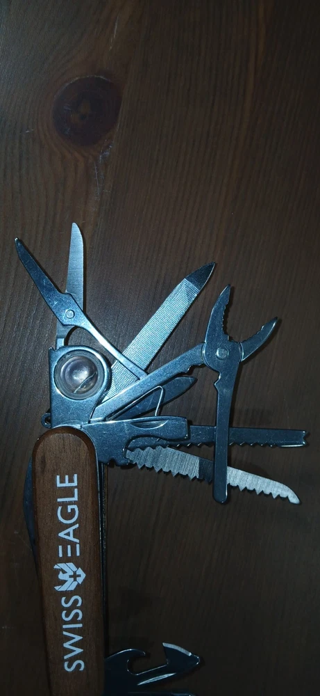 The Swiss Eagle Classic Multi-Tool Army Knife is a compact and versatile pocketknife with a clip point blade crafted from stainless steel. It features a manual opening mechanism and a polished ABS handle for a comfortable grip. This ambidextrous knife includes three blades and is part of the Swiss Army style knife collection, perfect for outdoor enthusiasts and collectors alike. The red color adds a pop of color to this original and reliable tool from the renowned SwissEagle brand.