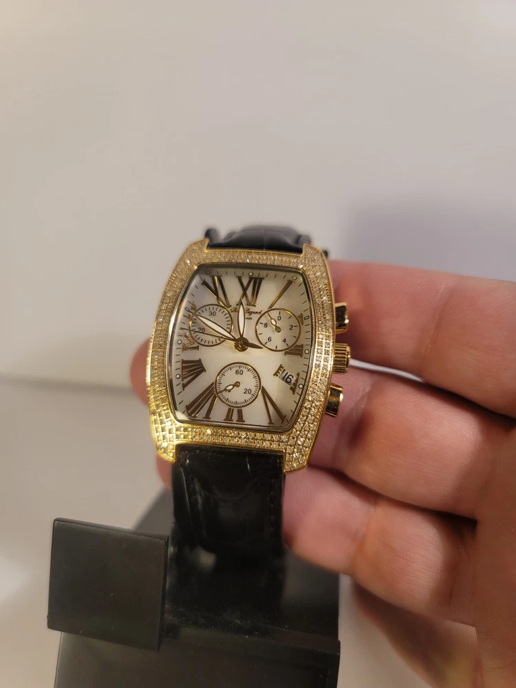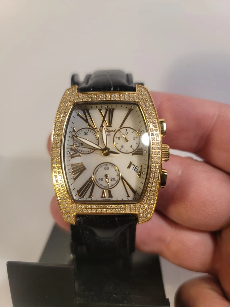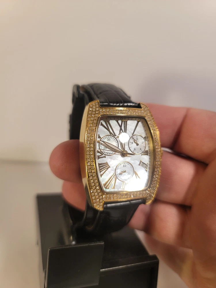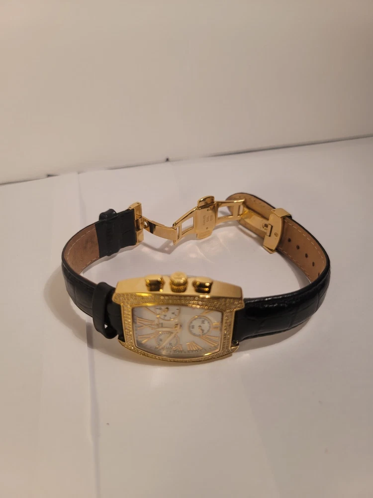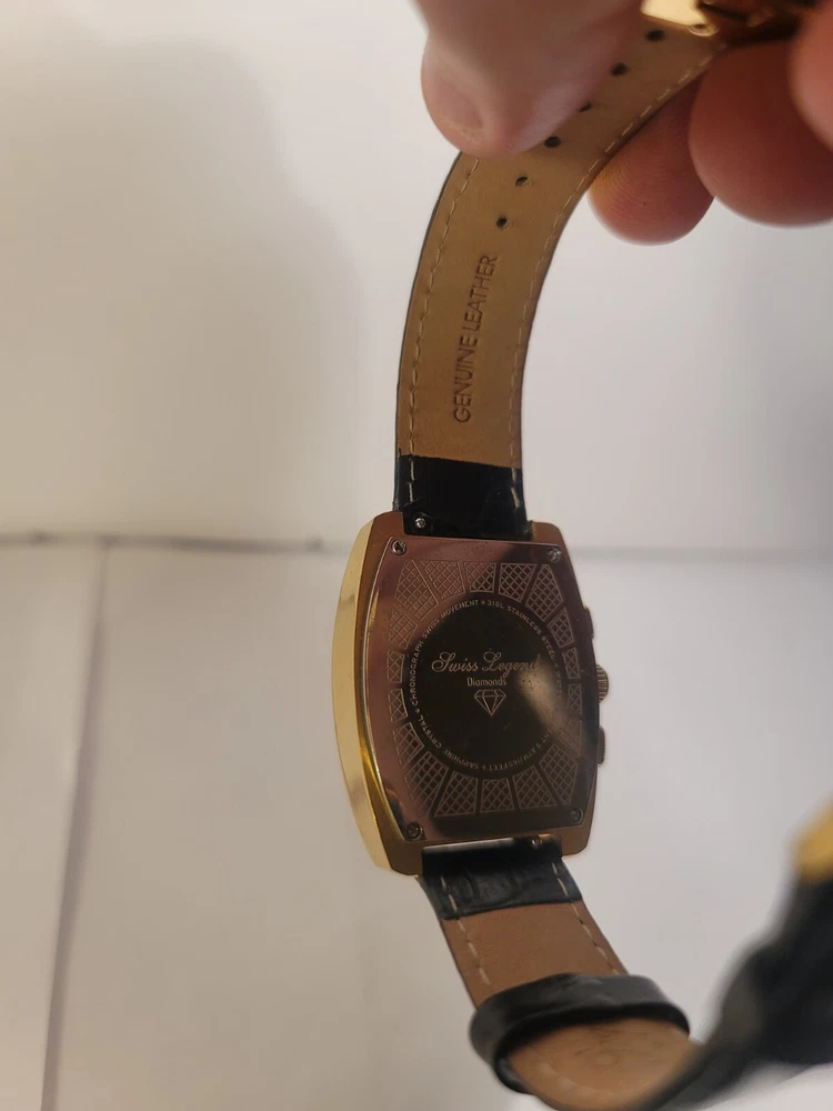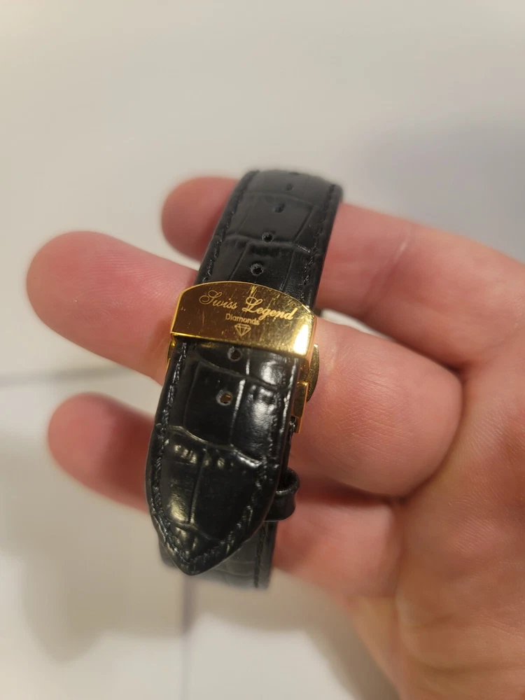 Swiss Legend Diamonds Women's 32mm Gold Watch - Mother Of Pearl Dial New Old Stock - A True Treasure Swiss Legend Diamond Bezel Men's Gold Watch - Mother Of Pearl Dial Gold Case & Black Leather Band with deployment clasp Please see all the pictures. This has a new battery and is ready for a new home. I AM A WATCH SELLER THIS IS NEW OLD STOCK. THIS HAS BEEN IN MY COLLECTION FOR A FEW YEARS. I AM SELLING IT NOW. IT'S NEVER BEEN WORN but it has sat on a display for a while . IT MAY HAVE SMALL IMPERFECTIONS #Swiss #watch #motherofpearl #diamond #gold