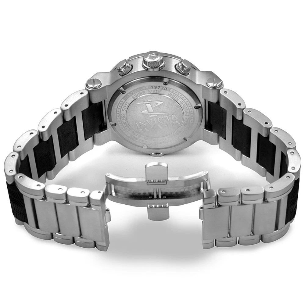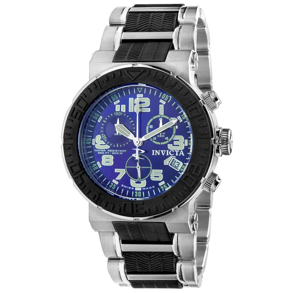 This auction is for brand new authentic Swiss Made Invicta 6138 Reserve Sea Reef Chronograph Stainless Steel Black Polyurethane Men's Watch. The silver-tone stainless steel case is outfitted with a black polyurethane unidirectional rotating bezel with a diver's scale. The case, 15mm in thickness, has been given a terrific satin finish to really bring out that sheen. The screw down case back keeps your timepiece's components safely housed. The round sunray dial comes in blue. Small rectangular Tritnite luminous index markers have been trimmed in silver-tone at all hour positions except 4:00. Tritnite luminous Arabic numerals are also trimmed in silver-tone at every position except 10:00. Sub-dials have been positioned near 2:00, 6:00 and 10:00. A date window sits right next to 4:00. Silver-tone hour and minute hands are brought to life with a Swiss Made ETA G10.211 Quartz Chronograph movement. The exhilarating bracelet combines satin brushed and polished stainless steel outer links in silver-tone with black textured polyurethane inner links. This bracelet attaches with a push button dual deployant clasp. The watch comes in Invicta Box with Papers. 2 year manufacturer warranty. MSRP: $1,295.00 Description Brand Invicta Style 6138 Series Reserve/Sea Reef Style Chronograph Size Men's Case Stainless steel with black ion plated lugs Dial Color Blue dial with silver tone and luminous hands and Arabic numerals Bracelet Brushed and polished stainless steel with black polyurethane Clasp Type Push button hidden Bezel Function Unidirectional Bezel Material Black polyurethane Movement Swiss Made ETA G10.211 Quartz Chronograph Crystal Flame-Fusion Case Diameter 46 mm Case Thickness 15 mm Water Resistant 20 ATM / 200 meters / 660 feet Calendar Date display at 4:00 Subdials 60 second, 30 minute and 1/10 second subdials Bracelet Width 30 mm Bracelet Length 10 inches Crown Screw-down Other Screw-down pushers Warranty 2 years manufacturer warranty Shipping: S/H within USA is FREE. International bidders, please contact for the quote. I use only USPS Registered Mail for international shipments to make sure the item is delivered safely. Buyer has the option of purchasing insurance. Please contact me for the amount of insurance so we can add this to stated postage charges. Once payment is received your order will processed (ship Monday through Saturday). Return: The item can be returned within 30 days after the buyer receives it. The item must be returned in original condition with no damage and with all tags still attached. Buyer is responsible for to pay return shipping. Full purchase price will be refunded promptly after inspected. If for some reason you are not satisfied with your purchase, please contact me before leaving feedback and we can work it out. Please ask all questions prior to bidding. It still costs the seller money when you back out of an auction, so please do not bid if you do not plan to honor your bid. Thanks for looking!