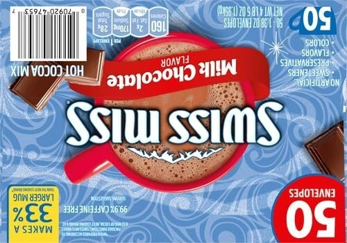 Serving Size: 1 Cup Type: Chocolate Drink UPC: 0070920476537 Product: Hot Chocolate & Malted Drink Calories per Serving: 160 Brand: Swiss Miss Food Specifications: Caffeine Free, No Artificial Flavoring, Preservatives Free, Fat Free, Gluten Free, No Artificial Coloring gtin13: 0070920476537 Style: Modern Flavor: Milk Chocolate Allergens: Milk Food Aisle: Pantry MPN: NOT SPECIFIED Number of Servings: 50