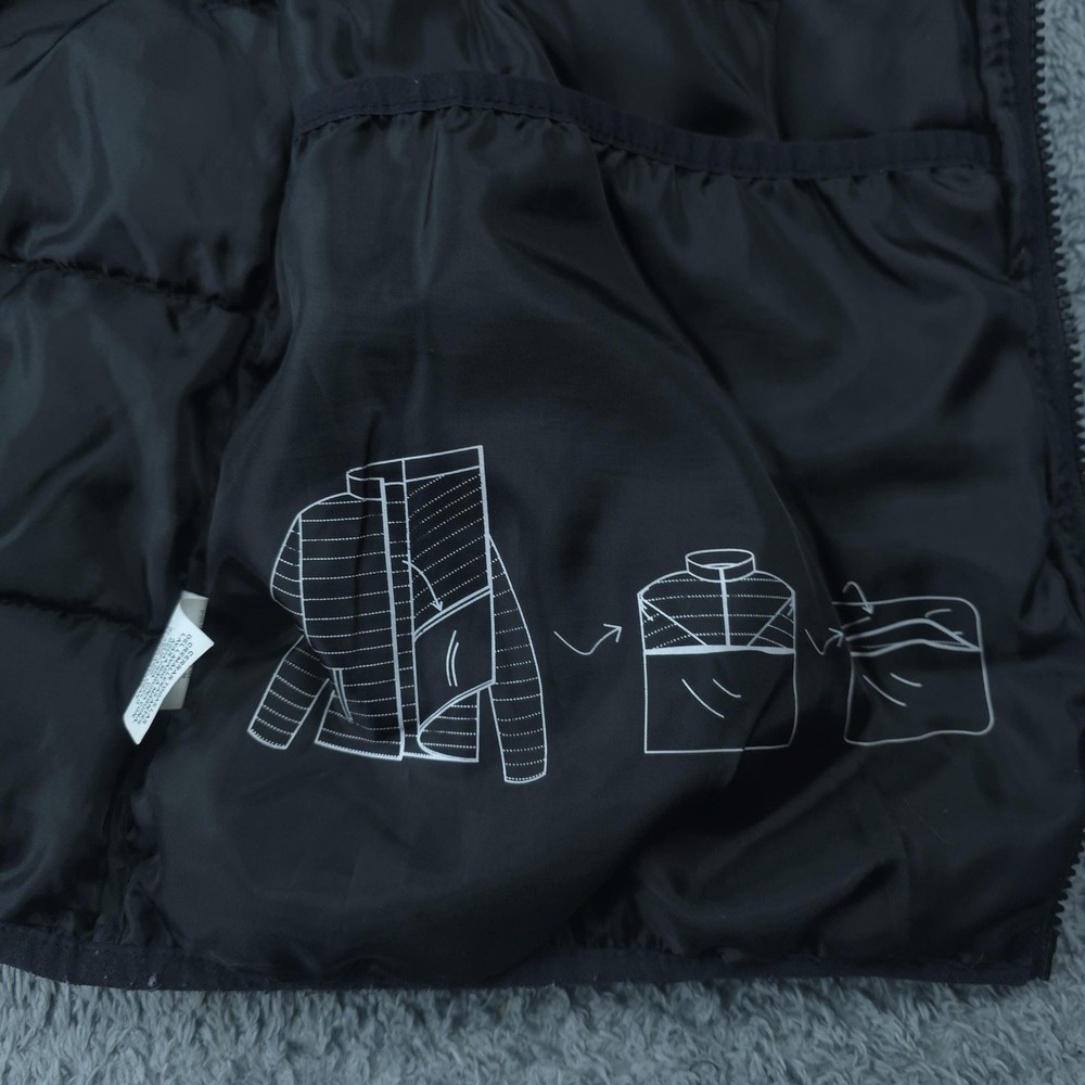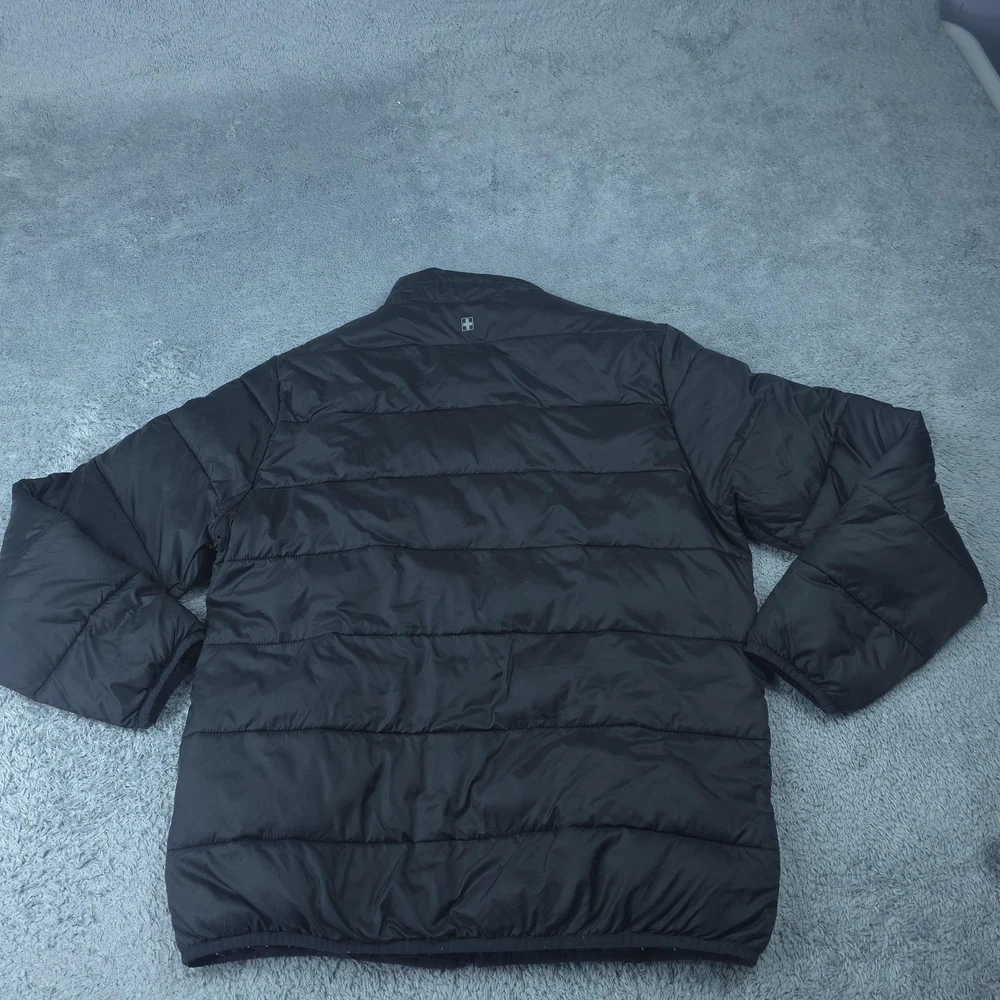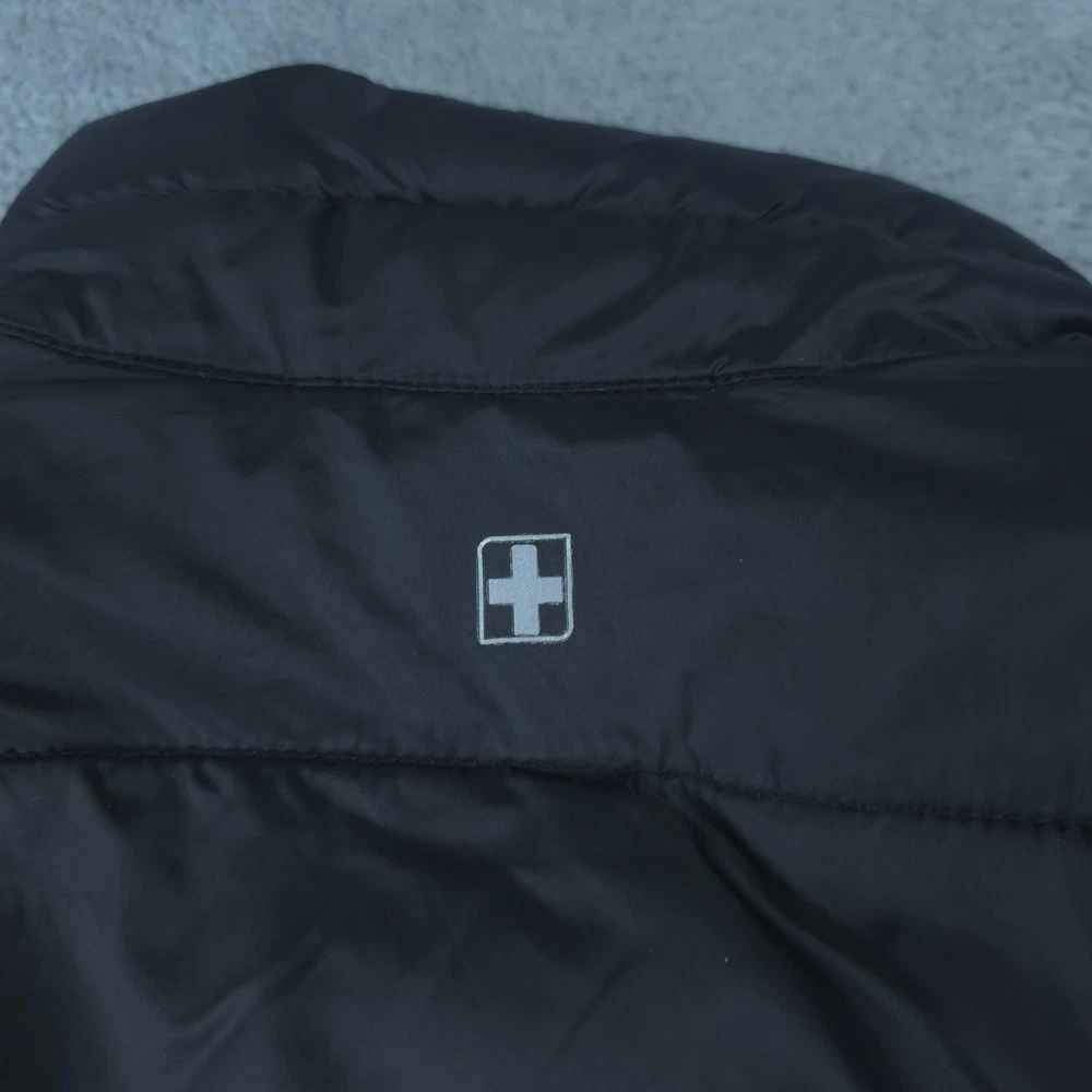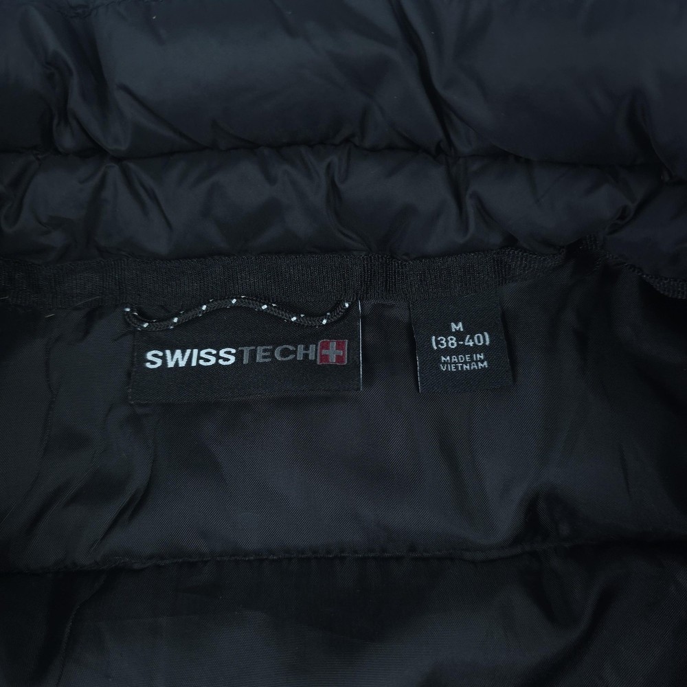 Brand: Swiss Tech Style: Men's lightweight quilted puffer jacket with full zip front and stand collar. Color: Solid black. Tag size: M (men's 38-40 regular). Material: Shell 100% nylon; lining 100% polyester; filling 100% recycled polyester; exclusive of decoration per inner care tag. Features: Horizontal quilted baffles, full-length front zipper, two front vertical zip hand pockets, smooth polyester lining, short jacket length, and lightweight insulated construction suitable for casual wear, travel, or outdoor layering in cool weather. Packable design: Interior graphic shows how the jacket folds and packs into an integrated pocket or pouch for compact storage. Branding: Woven SWISSTECH label at the inner neck and a small reflective Swiss cross logo printed at the back of the neck. Country of origin: Made in Vietnam. Inner care label details: Style SW31100027799, color Black, EAN/UPC 82179642540, RN# 52469.