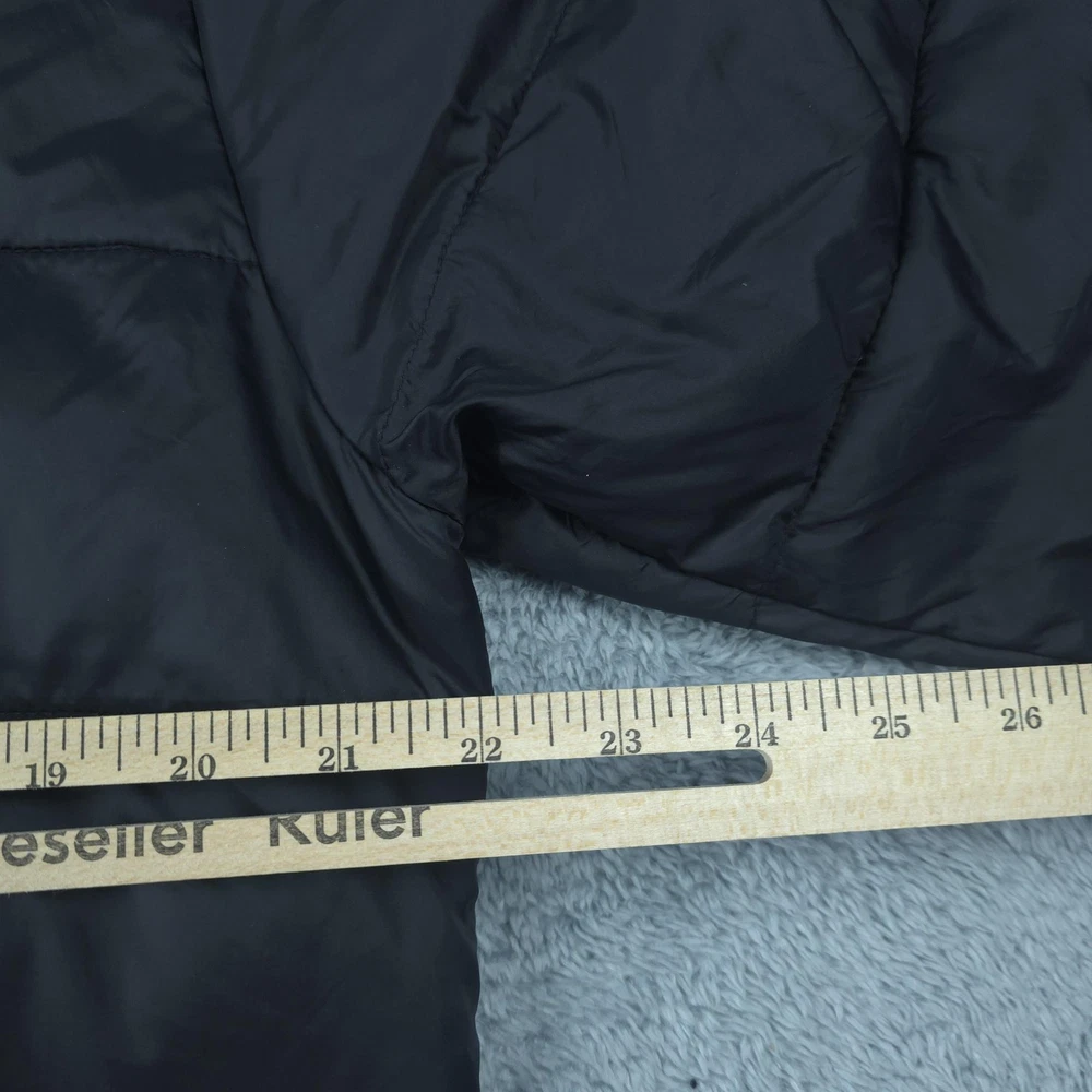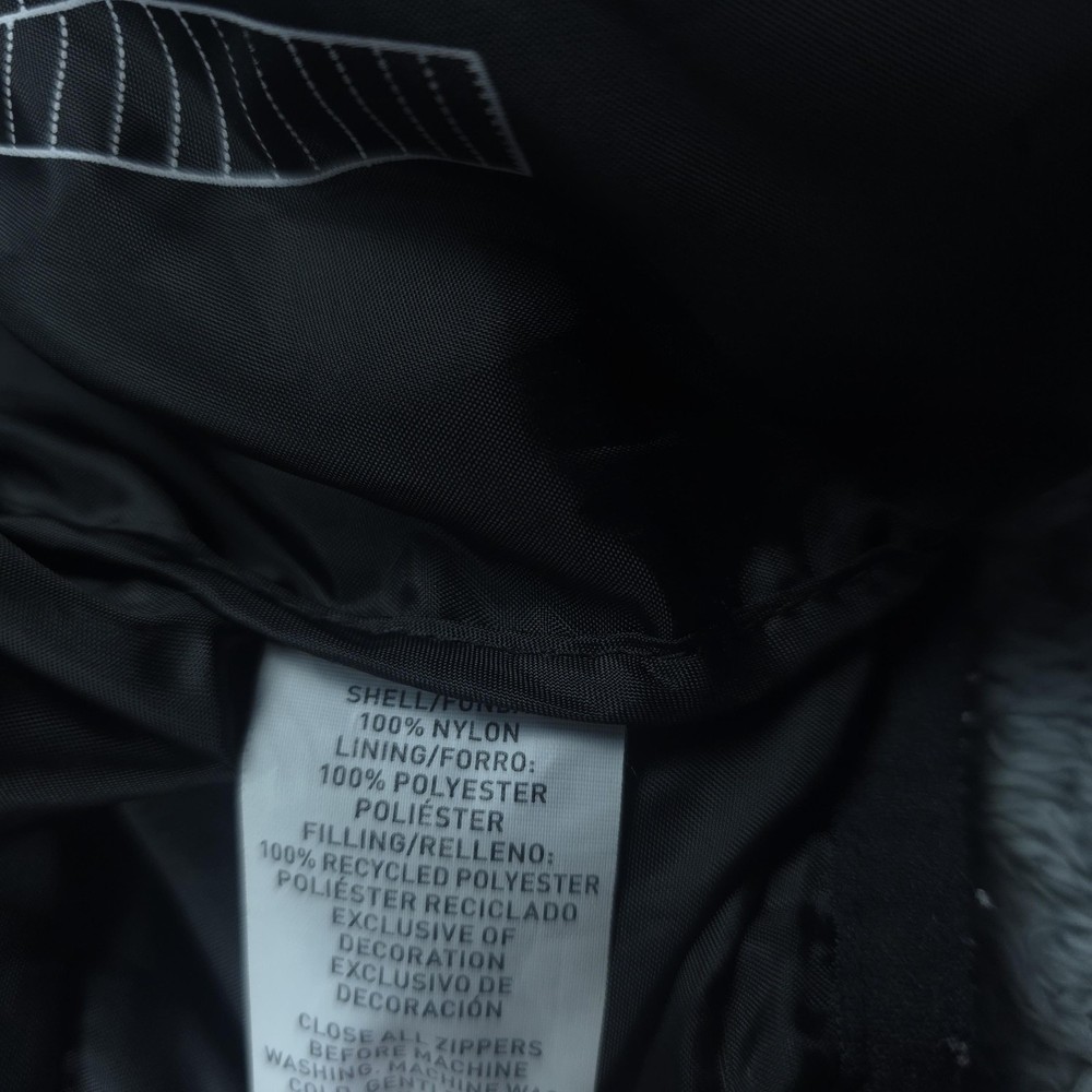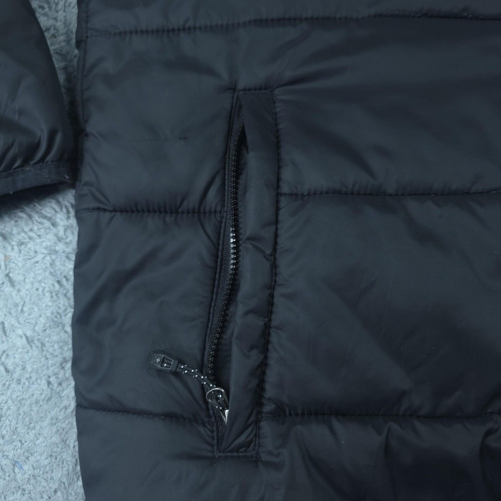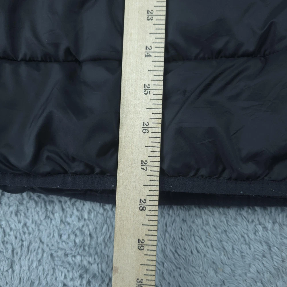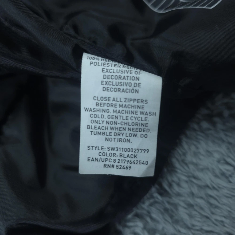 Brand: Swiss Tech Style: Men's lightweight quilted puffer jacket with full zip front and stand collar. Color: Solid black. Tag size: M (men's 38-40 regular). Material: Shell 100% nylon; lining 100% polyester; filling 100% recycled polyester; exclusive of decoration per inner care tag. Features: Horizontal quilted baffles, full-length front zipper, two front vertical zip hand pockets, smooth polyester lining, short jacket length, and lightweight insulated construction suitable for casual wear, travel, or outdoor layering in cool weather. Packable design: Interior graphic shows how the jacket folds and packs into an integrated pocket or pouch for compact storage. Branding: Woven SWISSTECH label at the inner neck and a small reflective Swiss cross logo printed at the back of the neck. Country of origin: Made in Vietnam. Inner care label details: Style SW31100027799, color Black, EAN/UPC 82179642540, RN# 52469.