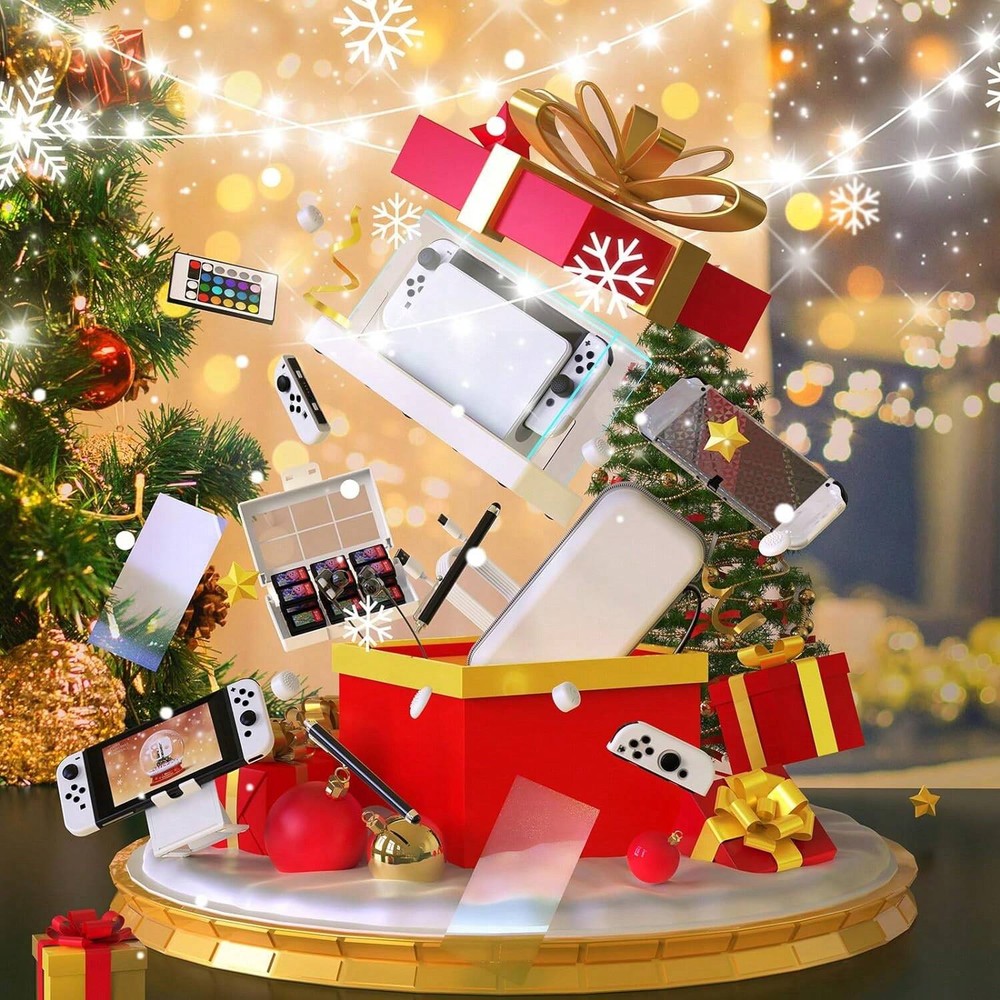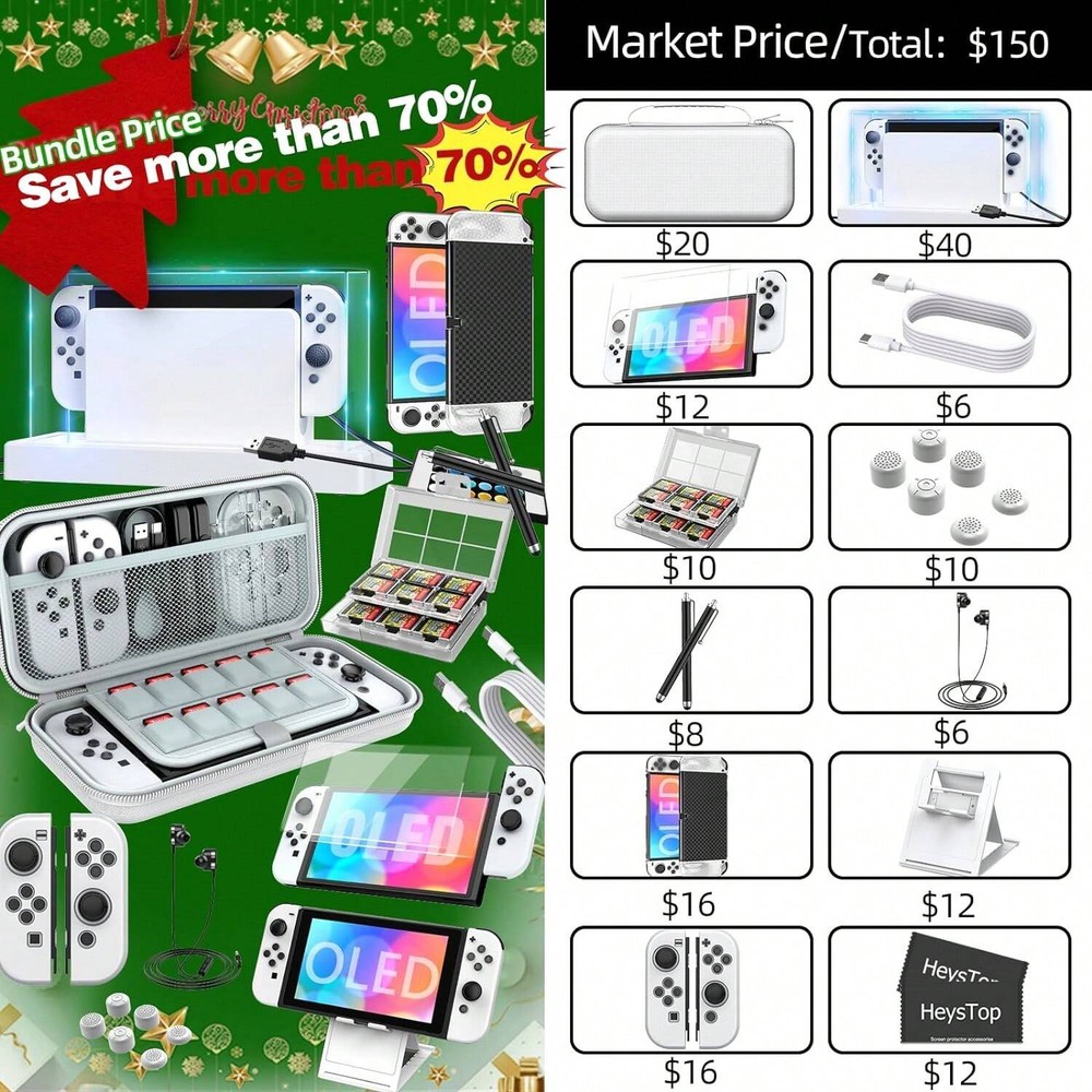 [Excellent Gifts for Switch OLED Gamer]This OLED Accessories Gift Kit contains almost all switch oled accessories, perfectly meets all the needs of game enthusiasts, making it an excellent gift choice for your game lover friends and family! [25 in 1 OLED Accessories Bundle]1x Switch LED Display Box Cover kit, 1x Switch Carrying Case, 1x Switch OLED Cover Case, 2x Joy-Con Clear Protective Case, 2x Screen Protector, 1x Compact Playstand, 1x Game Card Storage Case, 2x Comfort Grip, 2x Joy-Con Wheel, 1x USB Charging Cable, 2x Joy-Con Protective Case, 6x Thumb Grips Caps, 2x Touchscreen Pen, 1x Headset, 2x Cleaning kit [Cool LED Display Dock Cover for Switch OLED]HSTOP dust cover not only keep your OLED safe from dust, water and oil, It's more a super-cool switch OLED display case to show your personality: with four lighting modes and 16 LED lighting colors, you can switch the lighting display modes freely with the included smart remote control. [Full Protection Switch OLED Accessories Set]Switch oled carrying case is great for traveling, with high quality material, anti-scratch & shock & water design, 360° all-round protective case cover and 0.25mm tempered glass screen protectors, Joy-con protective case, thumb grip caps provide full protection for your switch console and all accessories. [Attention]This OLED accessory pack is only compatible with OLED model, not switch or Lite model.