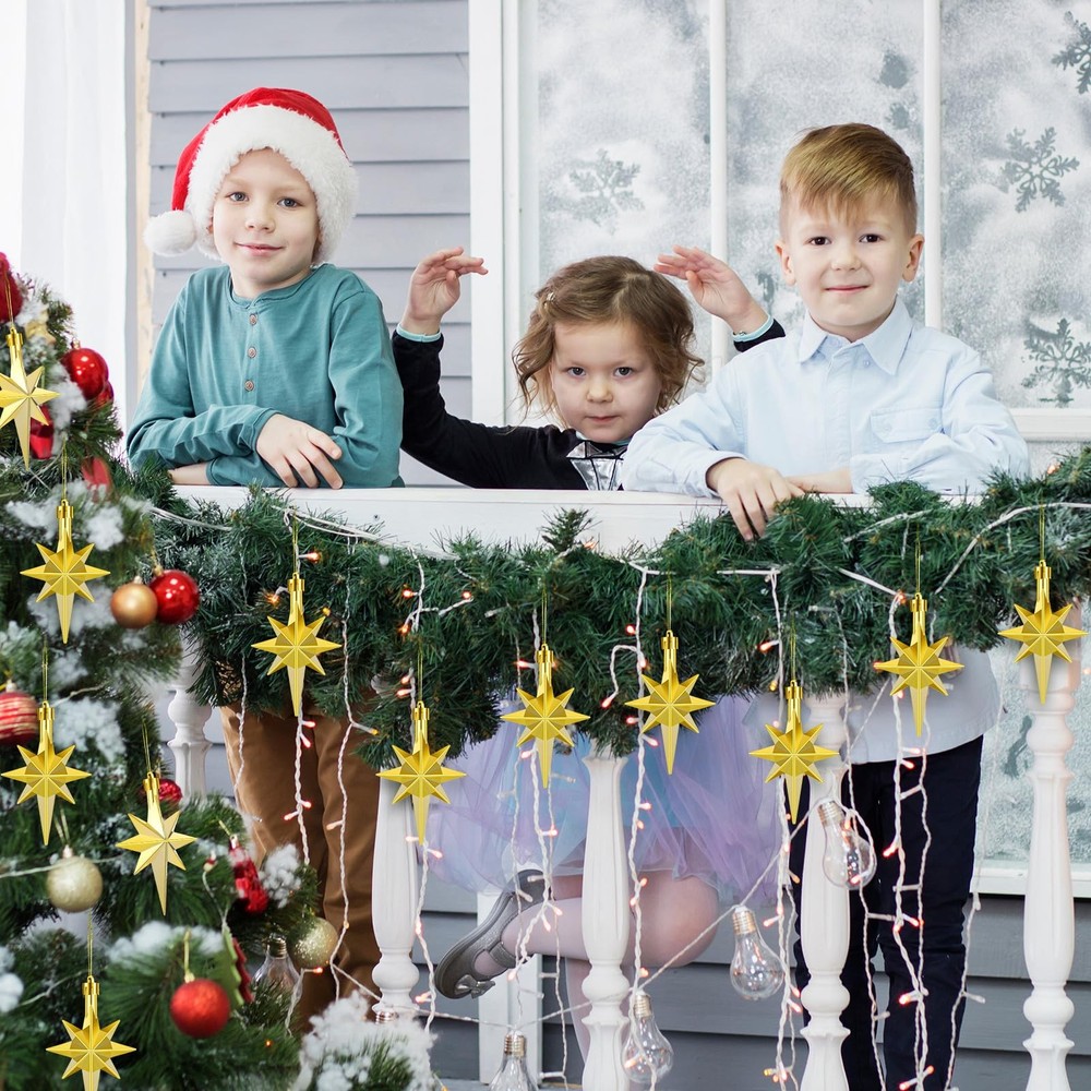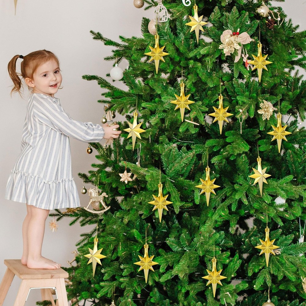 Package Includes: package includes 12 bethlehem star Christmas ornaments, each individually and securely packaged; Whether you're planning to cover a large tree or need several accents for wreaths and garlands, we've got you covered Suitable Size: bethlehem star ornament size is about 3.14 x 2.04 inches, the bethlehem star Christmas ornaments strike the balance between subtlety and significance on your Christmas tree; They are an ideal size on your Christmas tree without overpowering other ornaments Durability Material: our star Christmas ornament is crafted using plastic that undergoes an electroplating process; This accentuates its durability and gives it a polished, shiny appearance; Amidst the frenzy of festivities, this ornament is made to last, bringing joy to countless holiday Convenient Hanging Design: each star ornament for Christmas tree is designed with convenience in mind; A practical loop is placed at its top with an attached rope, ensuring easy hanging and rearrangement; These charming ornaments will hang securely, contributing to your beautiful Christmas decoration Holiday Parties Gift Dcoration: the star of bethlehem decor are not only for personal use but also suitable for holiday party decorations; They add an dose of festive cheer and style to any holiday gathering, be it a small family get together or a grand Christmas party