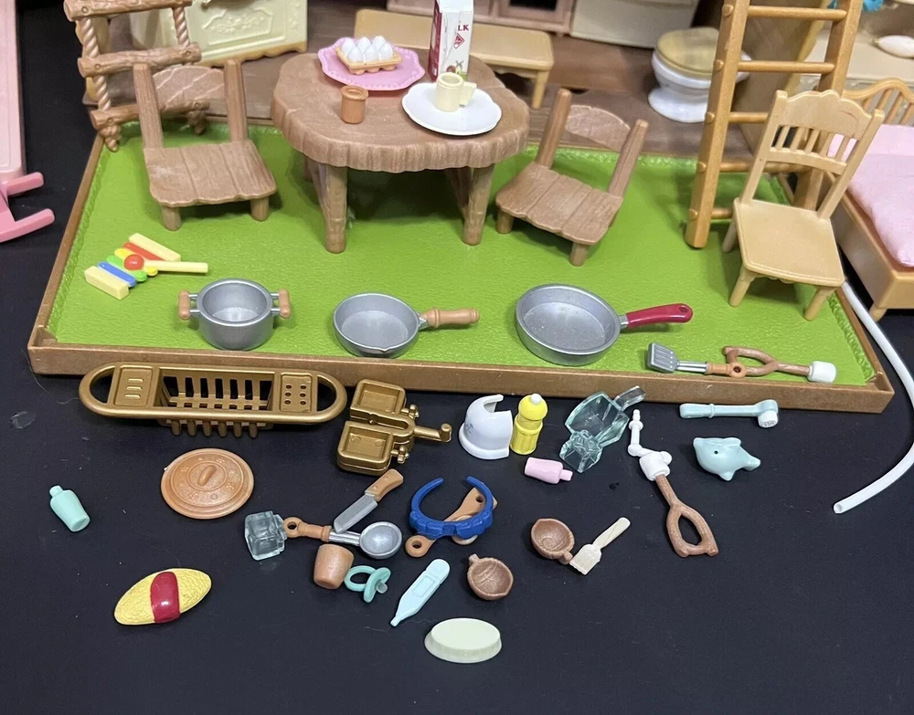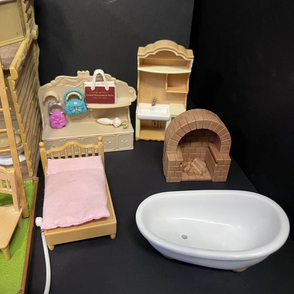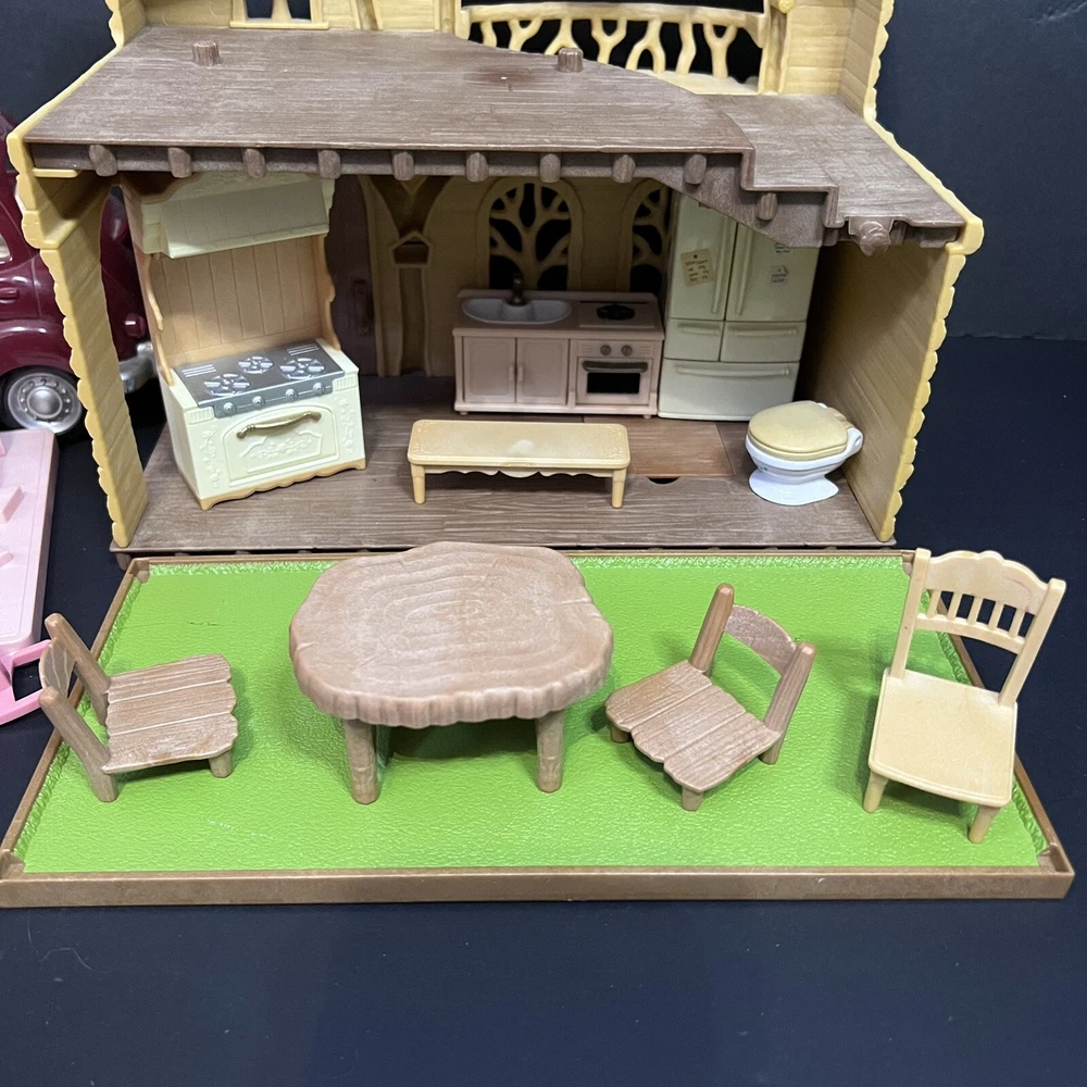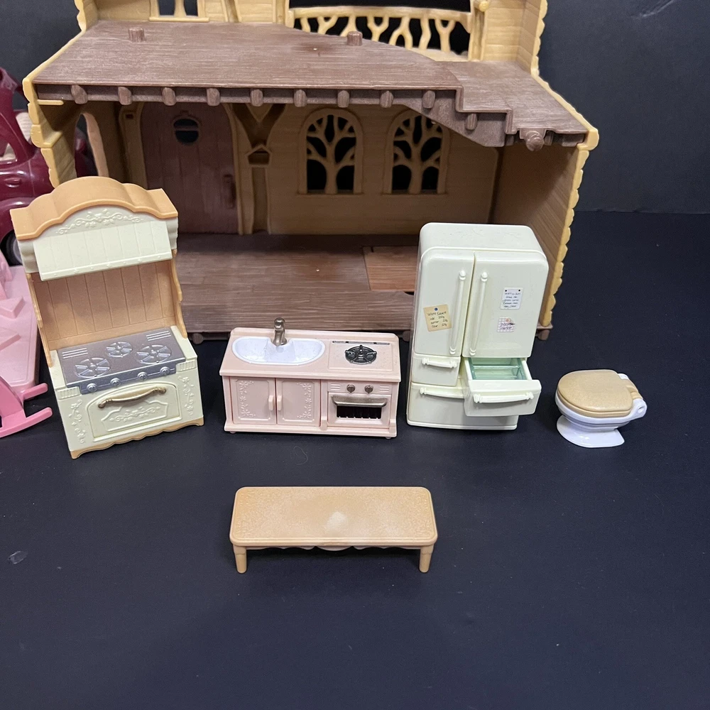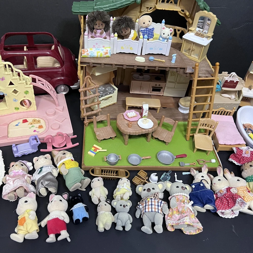 •Sylvanian Families/ Calico Critters Lakeside Lodge Play House. •Epoch Co, Ltd Calico Critters Cherry Cruiser Red Coupe Roadster Holds 5 Critters. Car needs a deeper cleaning. •Baby castle playground. (Some Stickers are peeling off. ) •22 Animal dolls. -9 cats -3 Koalas ( mom has damage on the ear.) -4 Bunnies (one bunny in missing a tail) -2 Chipmunks -2 Baby Hedgehogs -1 baby yellow lab -1 baby white mouse /gerbil?? Mixed assortment of furniture and accessories. Tables, chairs, refrigerators, tub, fireplace, shower and bathing accessories, campfire accessories, purses. Please refer to ALL photos. You will receive every item as photographed. Most Items are in played with condition. Some were only displayed on a shelf, some have some light wear.