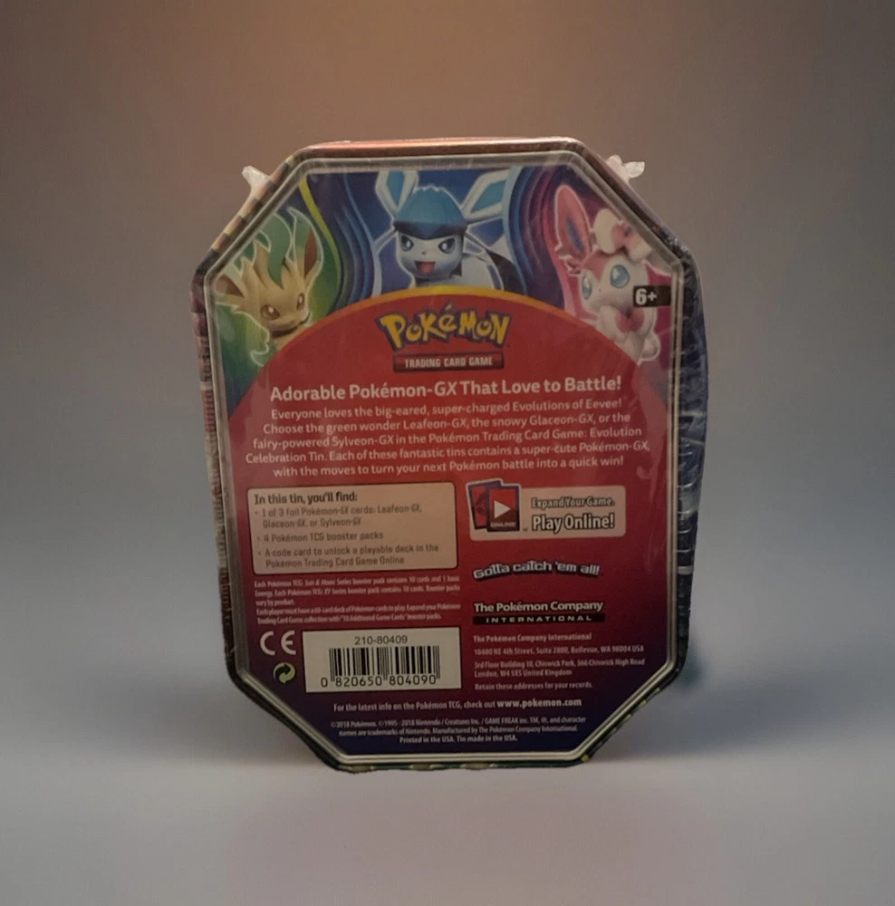The "Sylveon GX Pokemon Evolution Celebrations Tin" from 2018 features Glaceon, Sylveon, and Leafeon characters from the Pokémon TCG Evolutions set in English. Manufactured by Nintendo, this booster box contains a single box with Sylveon GX card and other Pokémon cards. The item is sealed, ensuring the contents are brand new and untouched. It is designed for ages 6 and up, making it suitable for younger Pokémon fans to enjoy collecting and playing with the cards. Slight dent on the tin front. Sealed and in excellent condition, perfect for both new and experienced collectors. If you have any questions about the product, feel free to reach out! I’ll respond as soon as I’m available.