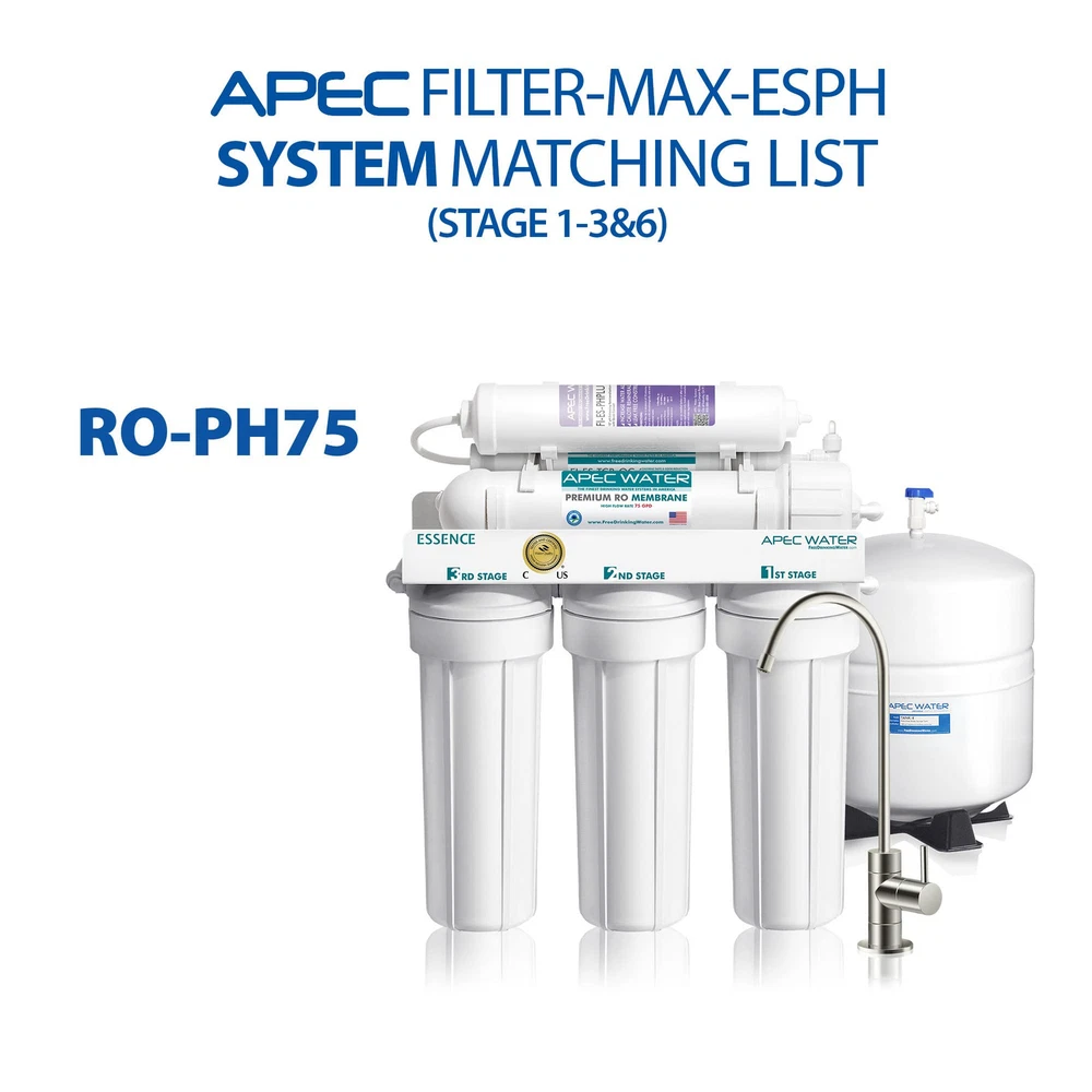 APEC ESSENCE series standard capacity pre-filter set for ROES-PH75 is made with high quality filtration components to protect and prolong the lifespan of your reverse osmosis system. Premium quality filter set lasts over 6 to 12 months for high performance impurity removal. These standard size filters are 10 inch and compatible with all standard size under counter RO systems. 1st stage: 5 micron polypropylene filter to remove sediment, particles, and rust. Prevent sediment from building up and clogging the filters and the system. 2nd and 3rd stage: 10 micron extruded carbon block filter to remove chlorine, taste & odor at a fast flow rate. Improve water taste, protect the life of the RO membrane and enjoy chlorine free water. 6th stage: 10 inch high purity pH+ calcium carbonate alkaline inline filters W/quick connect. Compatible with APEC ROES-PH75 and all other standard size under counter reverse osmosis systems. For over 20 years, APEC has been an industry leading manufacturer who specializes in high performance RO systems. As the original manufacturer, we have dedicated a knowledgeable and sincere team that is committed to providing customer SATISFACTION in hopes to bring many years of enjoyment and good health for you and your family. ESSENCE Series FILTER-SET-ESPH is for ROES-PH75. 1st stage 5 micron Polypropylene sediment filter to remove dust, particles, and rust 2nd & 3rd stage 10 micron extruded carbon block filters to remove chlorine, taste & odor 6th stage 10" High Purity US Made pH+ Calcium Carbonate Alkaline Inline Filters w/ Quick Connect APEC's extruded solid carbon block filters far surpass GAC filters in performance and absorptive capacity; in addition they do not leak carbon fines.